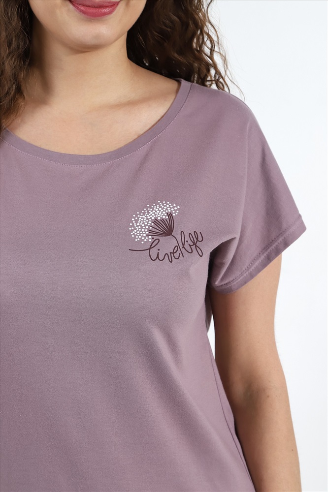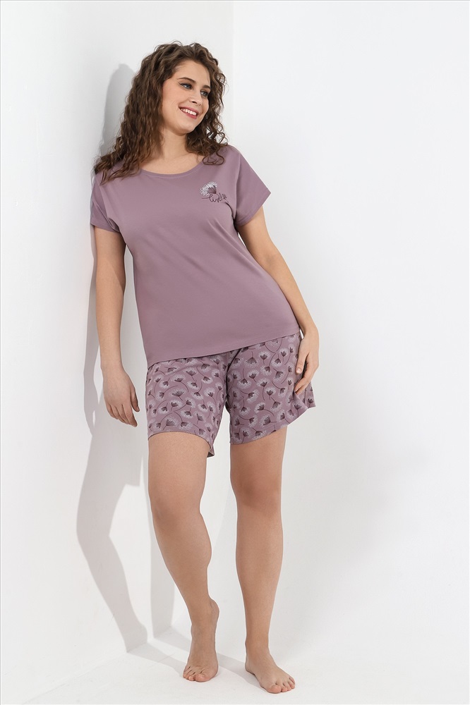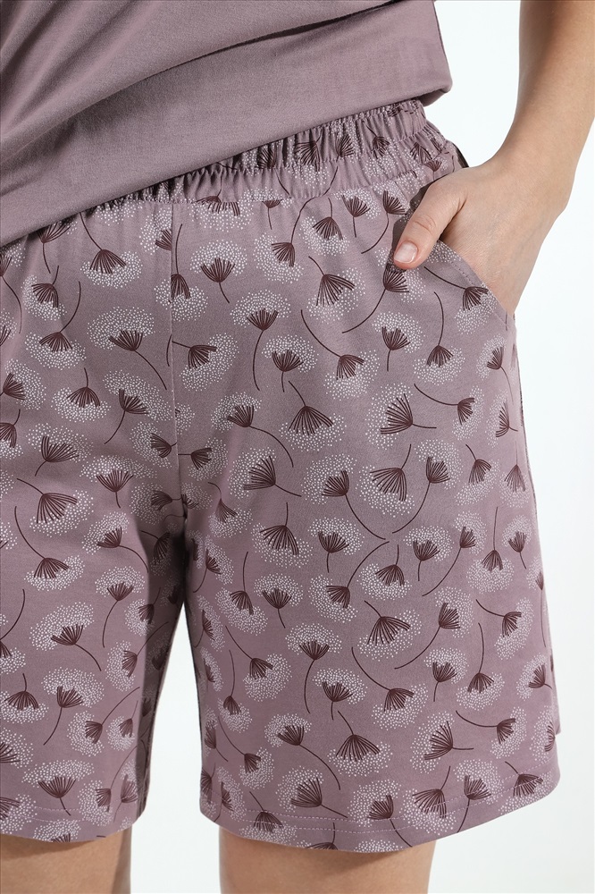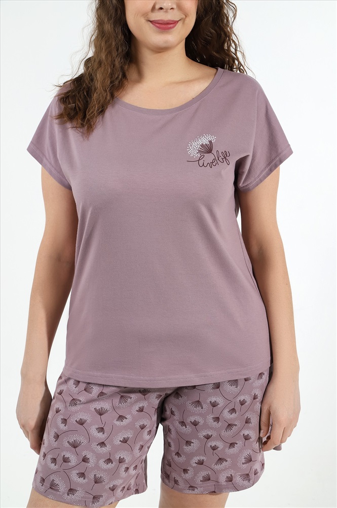 Костюм молодежный из трикотажного полотна «кулирка» в комбинации двух видов: с набивным рисунком и гладкокрашеного в единой цветовой гамме, состоящий из футболки и шорт. Футболка - из гладкокрашеного полотна, классического покроя, с короткими цельнокроеными рукавами, горловиной овальной формы, обработанной притачной бейкой из основного материала и принтом на полочке, выполненным в технике «шелкографии».Шорты – из полотна с набивным рисунком, свободные, средней длины, с карманами в боковых швах, на притачном поясе с эластичной тесьмой внутри.