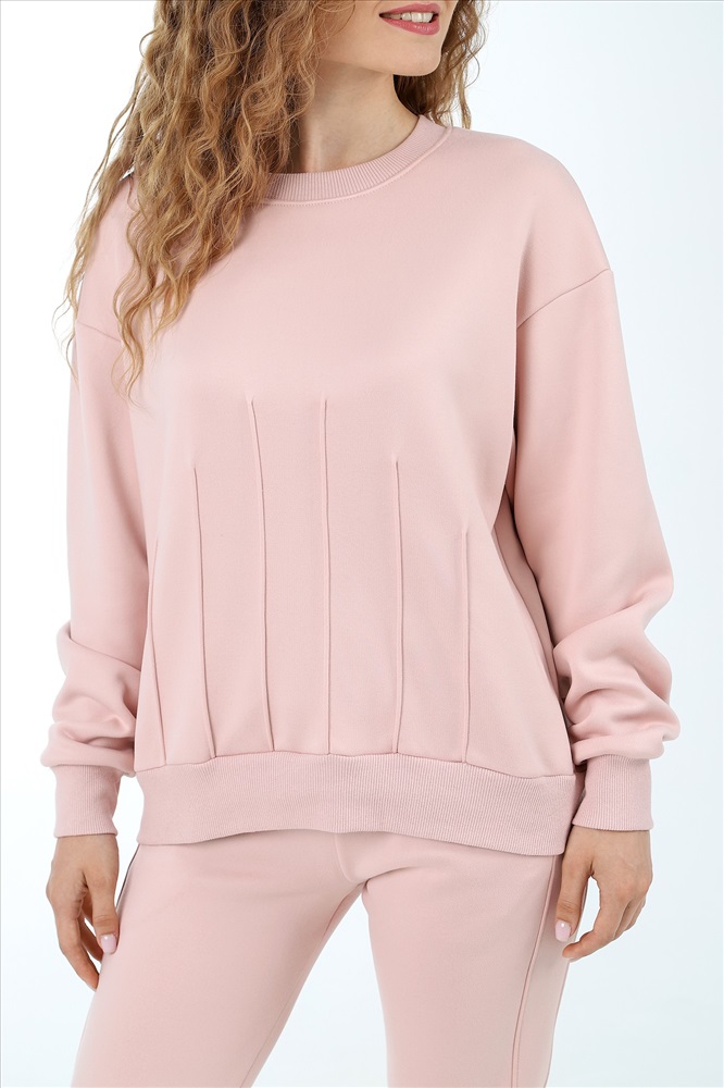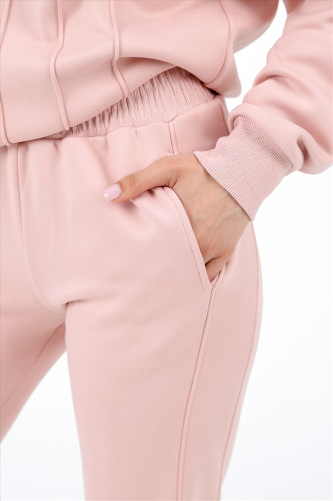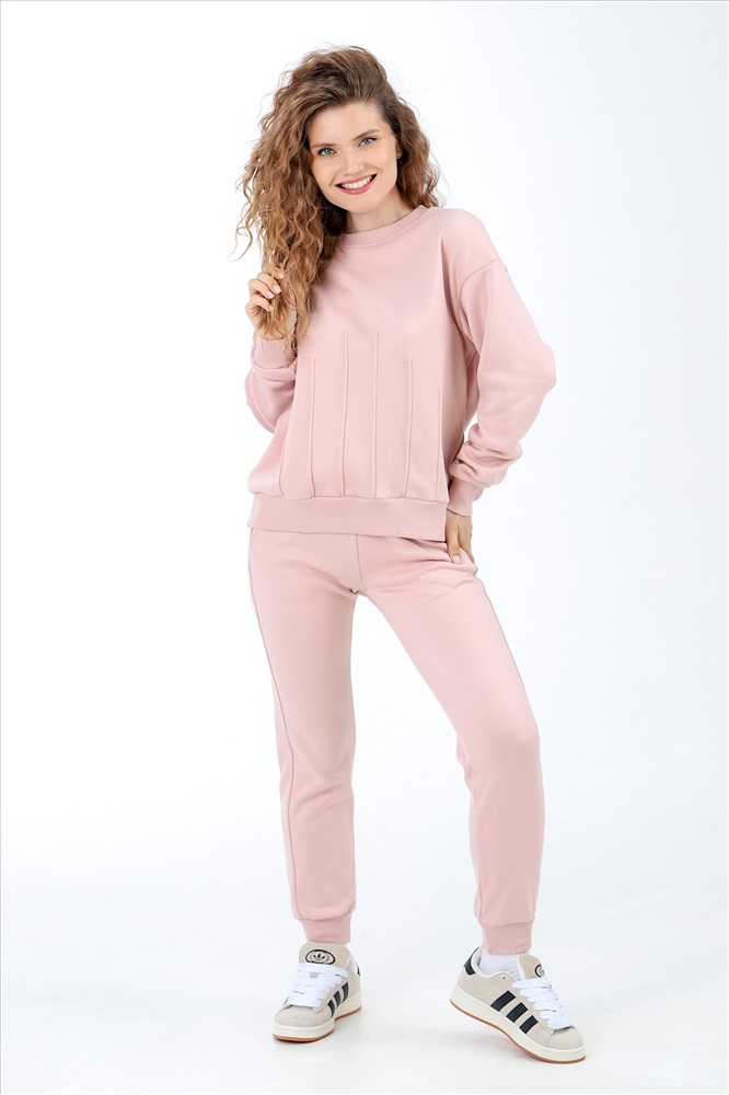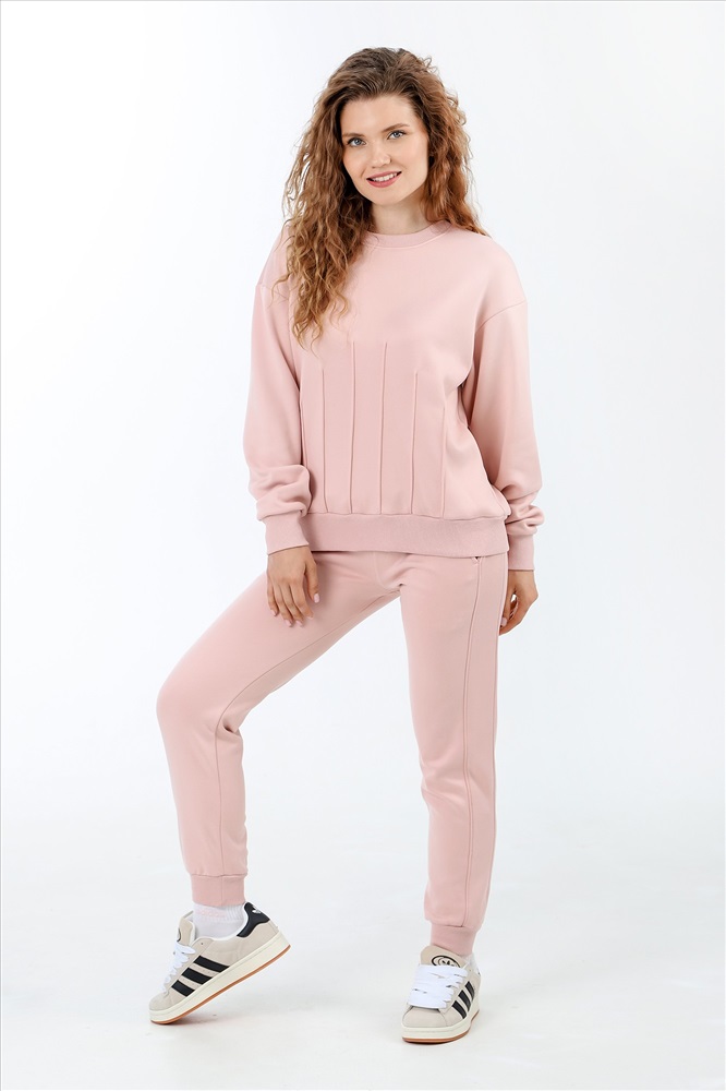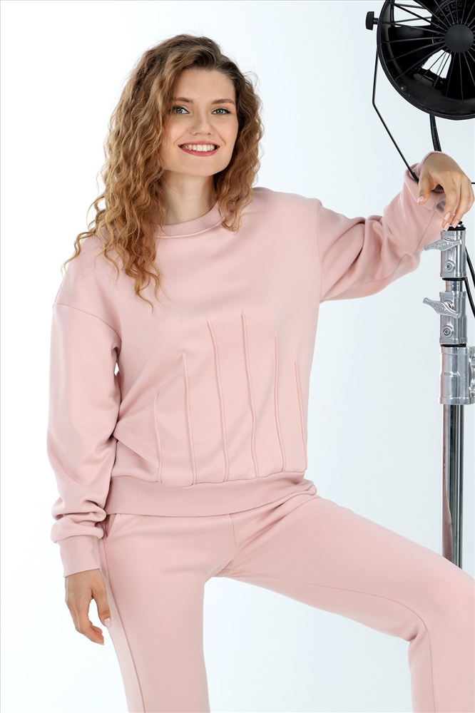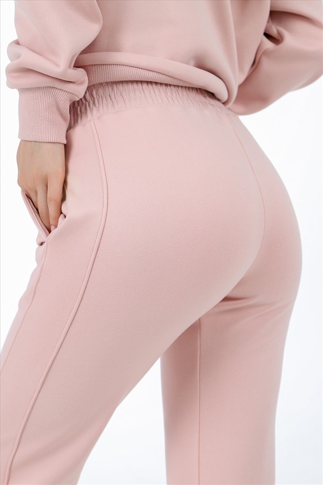 Костюм молодежный из гладкокрашеного трикотажного полотна «футер-интерсофт», состоящий из джемпера и брюк Джемпер – свободного покроя, с длинными втачными рукавами, горловиной овальной формы, обработанной втачной планкой и притачным поясом по низу. Рукава – с притачными манжетами. Манжеты, планка горловины и пояс выполнены из полотна «кашкорсе» такого же цвета, как и основной материал. На полочке застрочены декоративные складочки-защипы, расположенные симметрично относительно линии центра. Брюки – длинные, на притачном поясе с эластичной тесьмой внутри и манжетами по низу. Передние половины – из двух частей каждая, со смещением соединтельных швов в сторону боковых срезов. Соединительные швы передних половин обработаны с карманами. Пояс и манжеты выполнены из трикотажного полотна «кашкорсе».