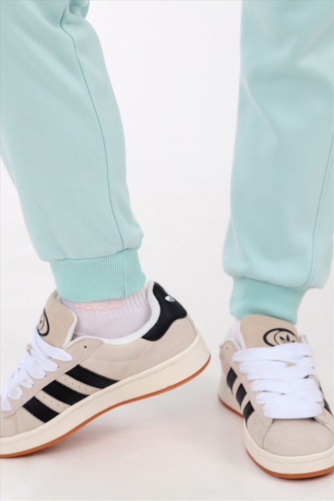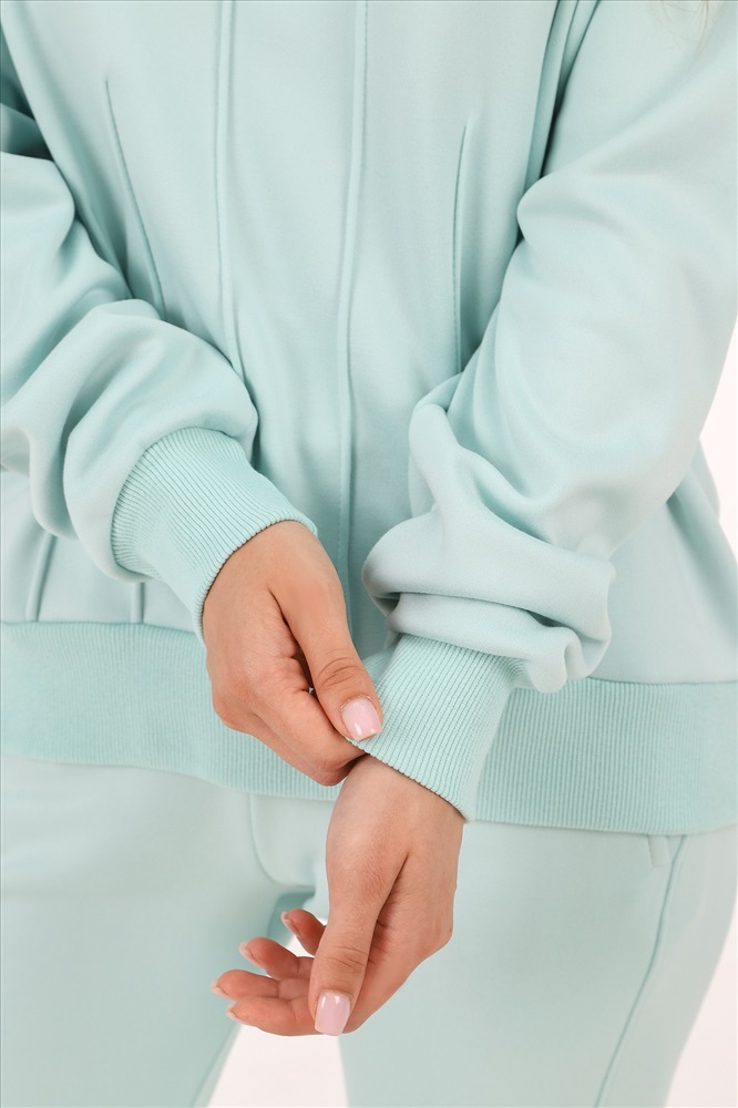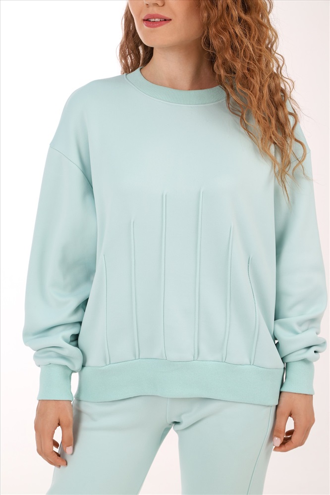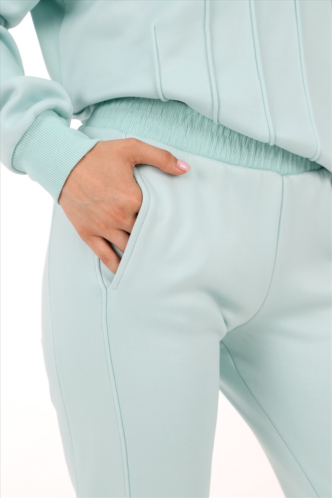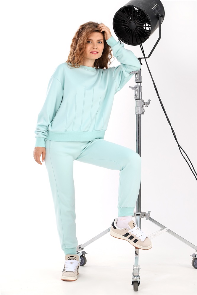 Костюм молодежный из гладкокрашеного трикотажного полотна «футер-интерсофт», состоящий из джемпера и брюк Джемпер – свободного покроя, с длинными втачными рукавами, горловиной овальной формы, обработанной втачной планкой и притачным поясом по низу. Рукава – с притачными манжетами. Манжеты, планка горловины и пояс выполнены из полотна «кашкорсе» такого же цвета, как и основной материал. На полочке застрочены декоративные складочки-защипы, расположенные симметрично относительно линии центра. Брюки – длинные, на притачном поясе с эластичной тесьмой внутри и манжетами по низу. Передние половины – из двух частей каждая, со смещением соединтельных швов в сторону боковых срезов. Соединительные швы передних половин обработаны с карманами. Пояс и манжеты выполнены из трикотажного полотна «кашкорсе».