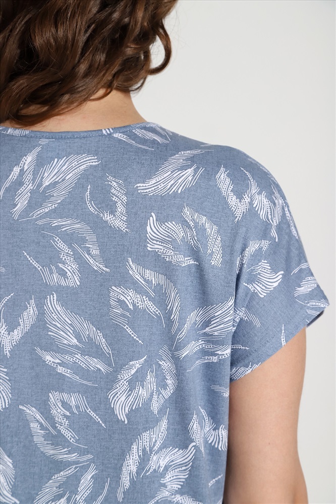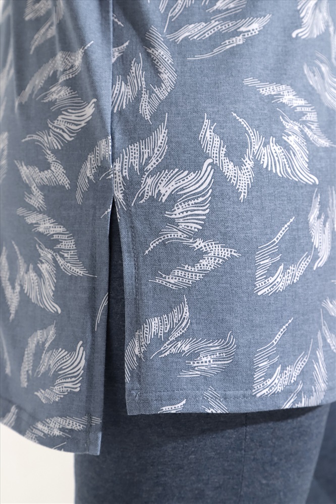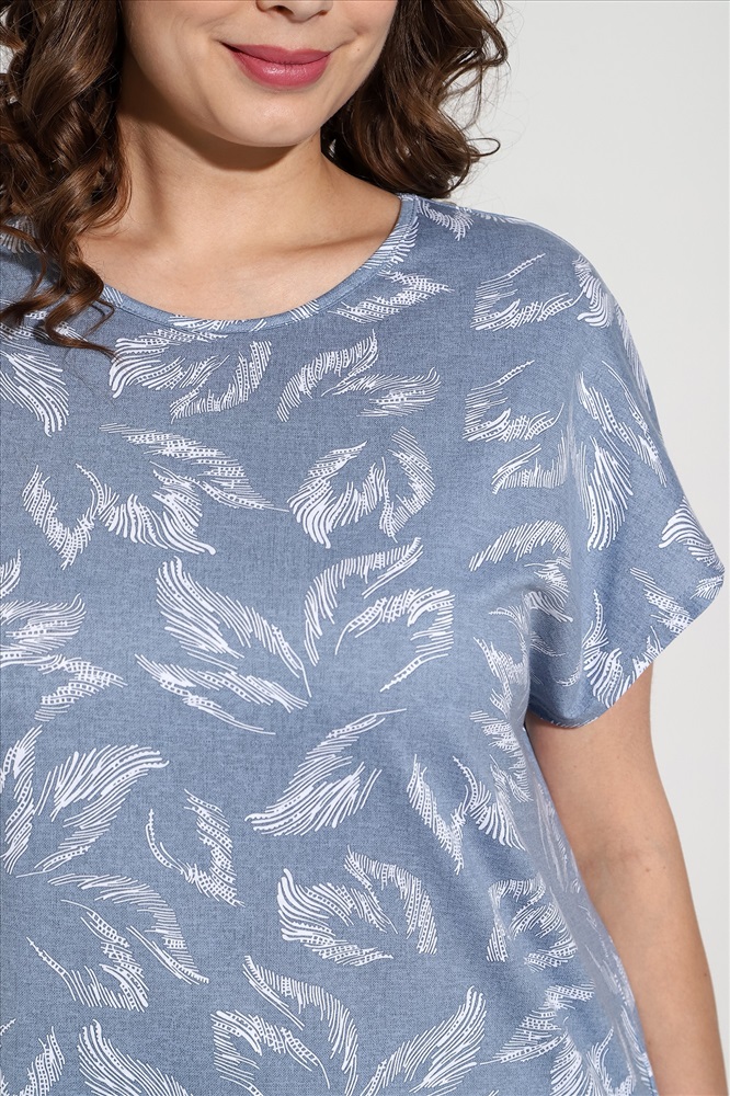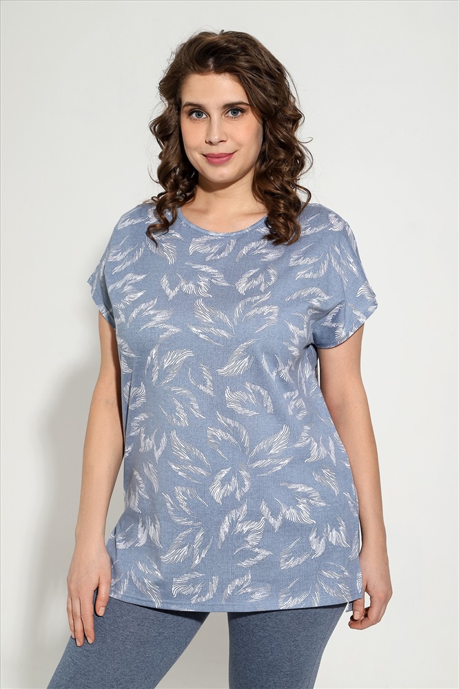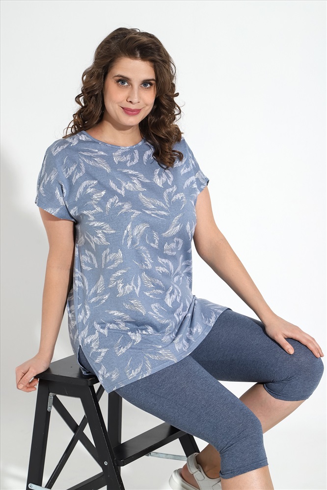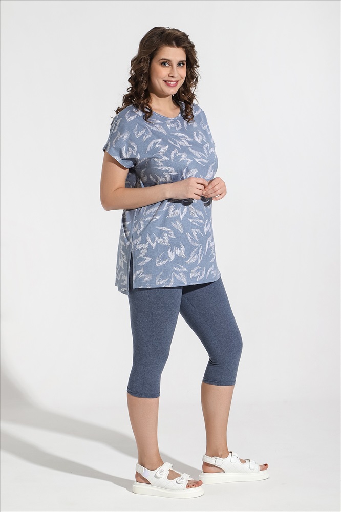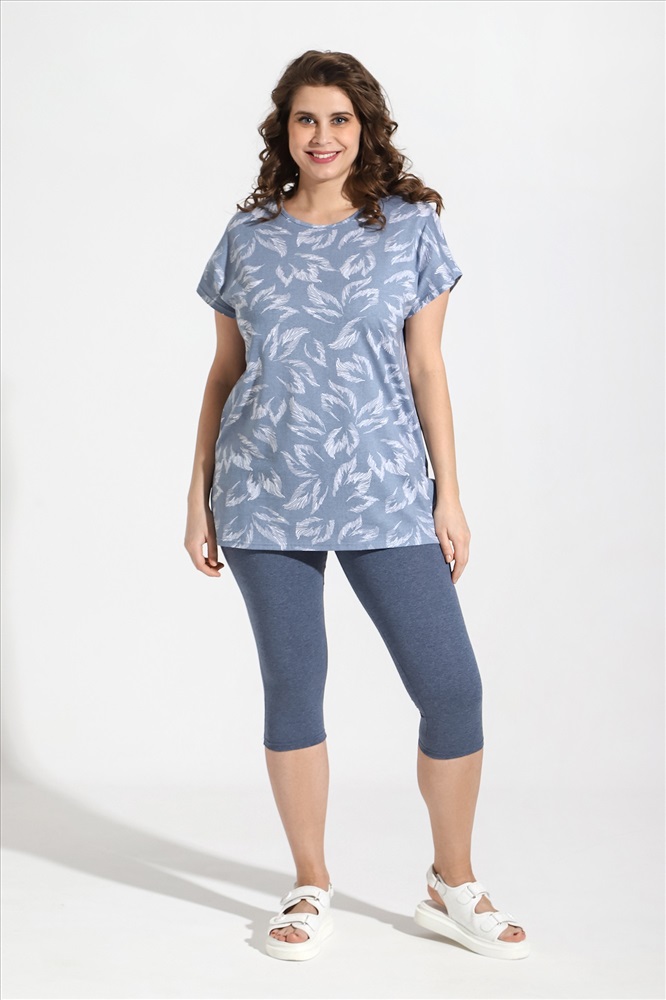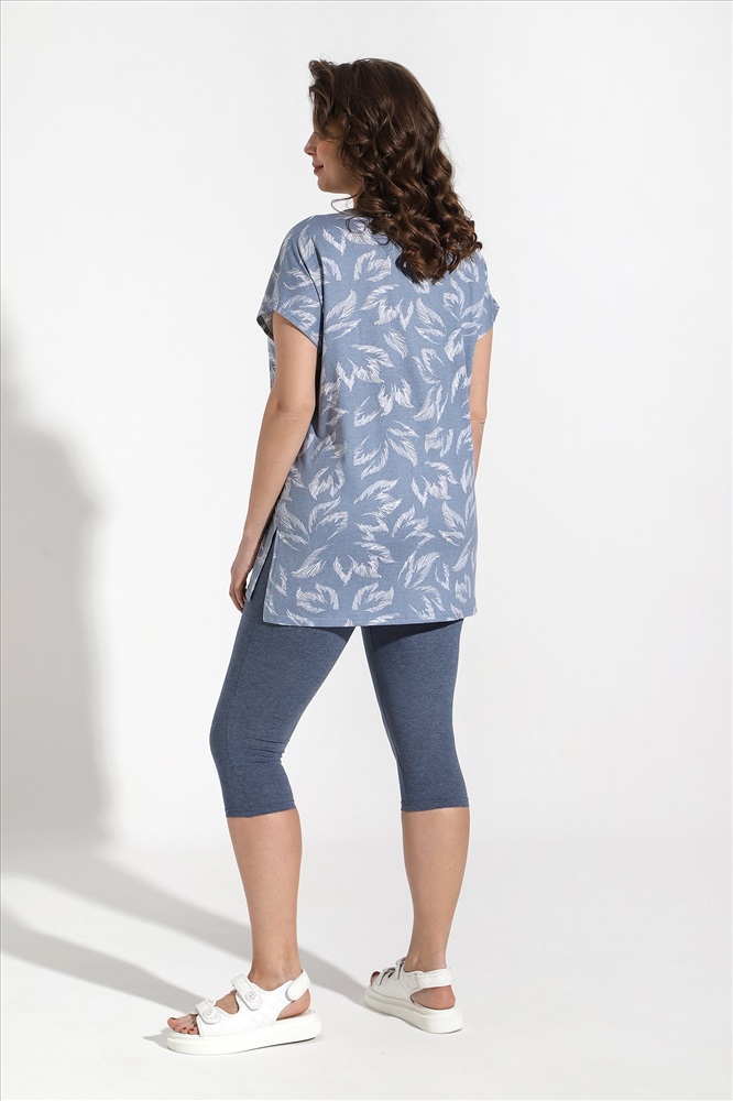Костюм из трикотажного полотна «кулирка» в комбинации двух видов: гладкокрашеного «меланжированого» и с набивным рисунком, состоящий из футболки и бридж.Футболка – из полотна с набивным рисунком, с короткими цельнокроеными рукавами, горловиной овальной формы, окантованной основным материалом и разрезами по боковым швам. Бриджи-велосипедки – из «меланжированого» полотна, классического покроя, с эластичной тесьмой по талии.