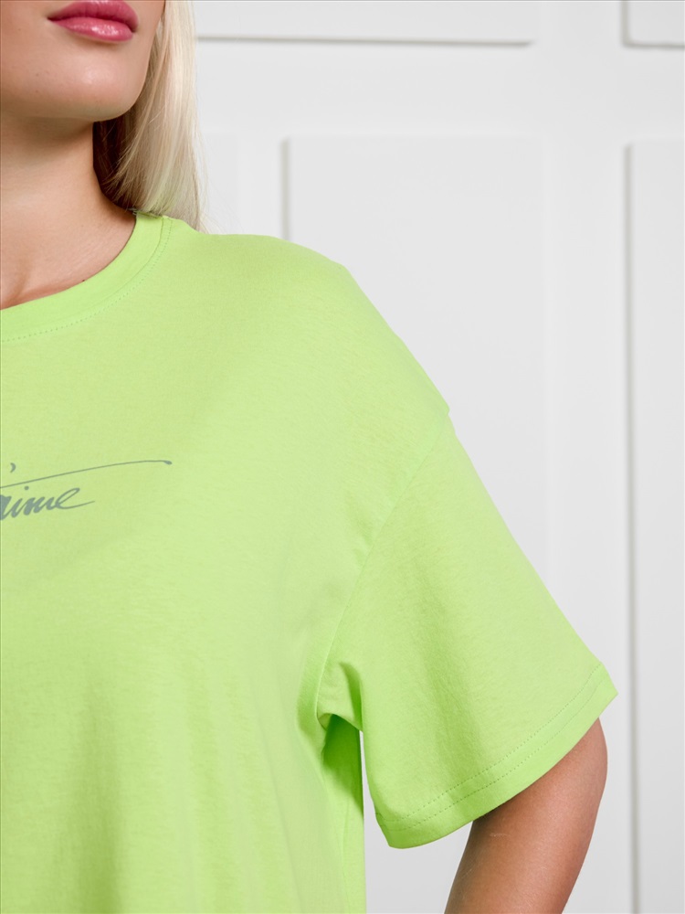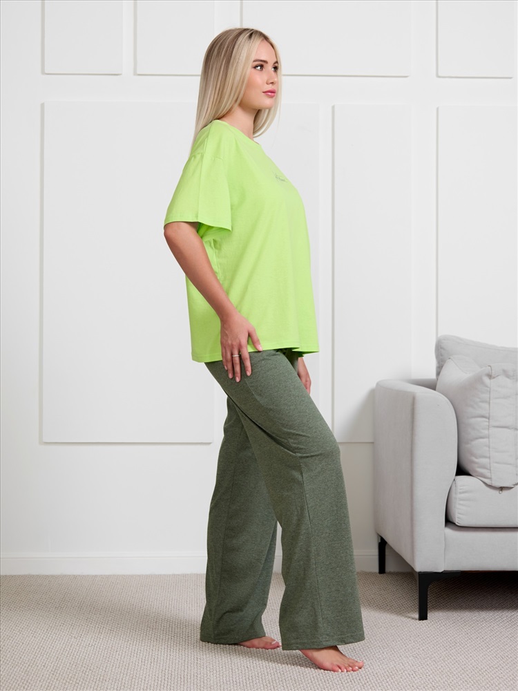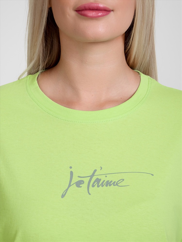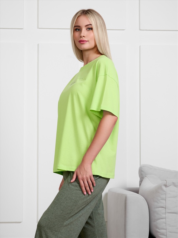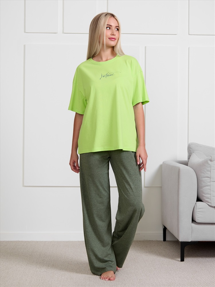 Костюм женский из трикотажного полотна в комбинации двух видов тканей: «кулирка» и «меланжированная кулирка» состоящий из футболки и брюк. Футболка - из гладкокрашенного полотна «кулирка», классического покроя, с короткими втачными рукавами, горловиной овальной формы и принтом на полочке, выполненным в технике «шелкографии». Горловина обработана притачной бейкой из основного материала.Брюки – из гладкокрашенного полотна «кулирка/меланж» контрастного цвета, длинные, классического кроя, с карманами в боковых швах, на притачном поясе с эластичной тесьмой внутри.