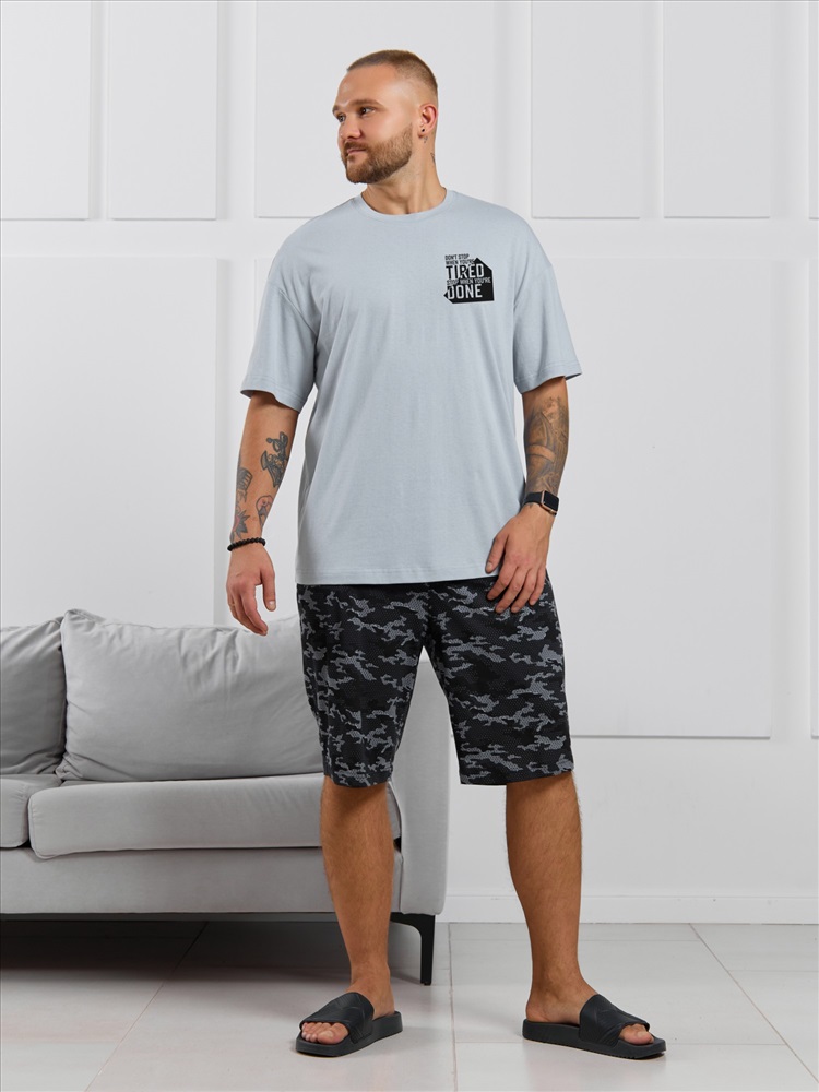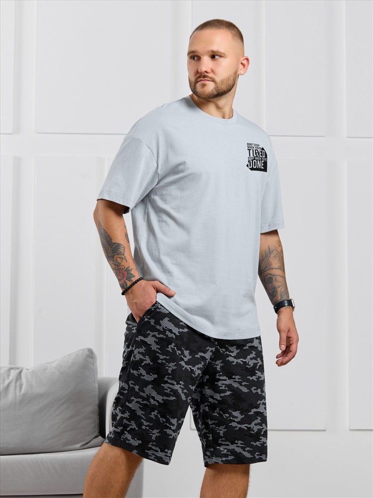 Костюм мужской, состоящий из футболки и шорт. Футболка однотонная с принтом на груди; модель свободная, со спущенной линией плеч. Шорты из полотна с набивным рисунком эксклюзивного дизайна, с боковыми карманами с обтачными входами, на притачном поясе с отстроченной эластичной тесьмой.