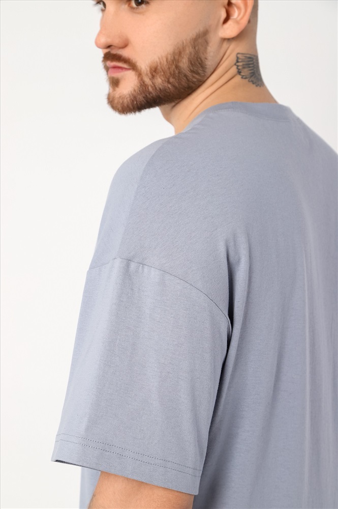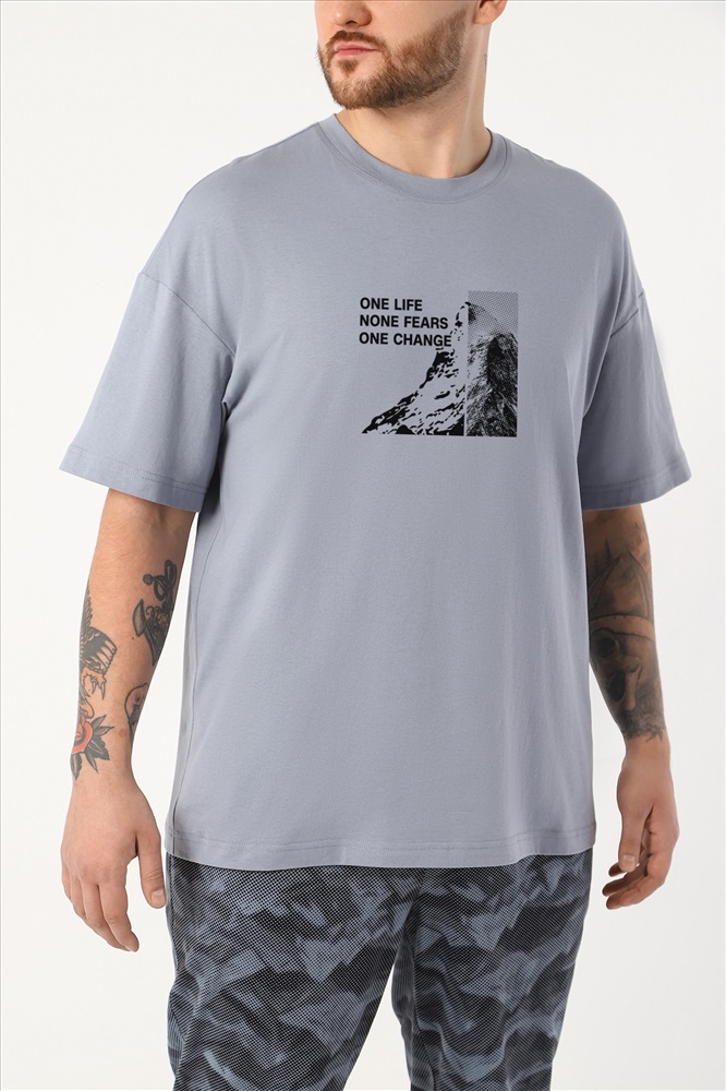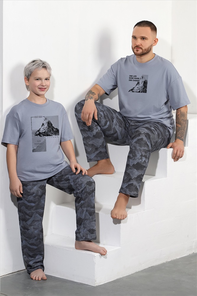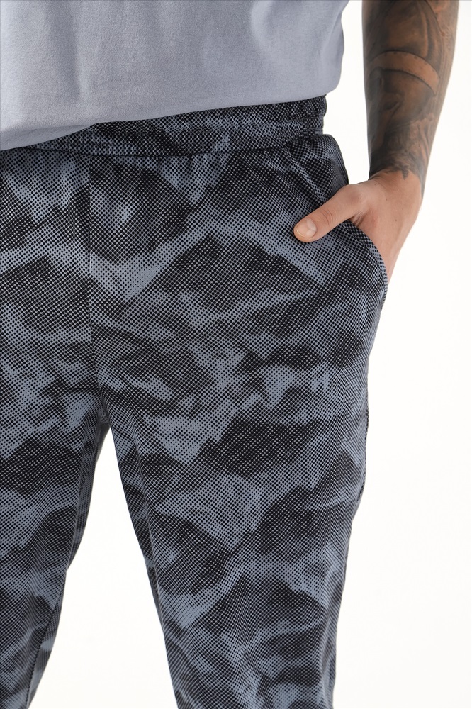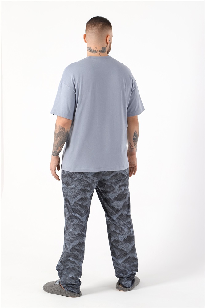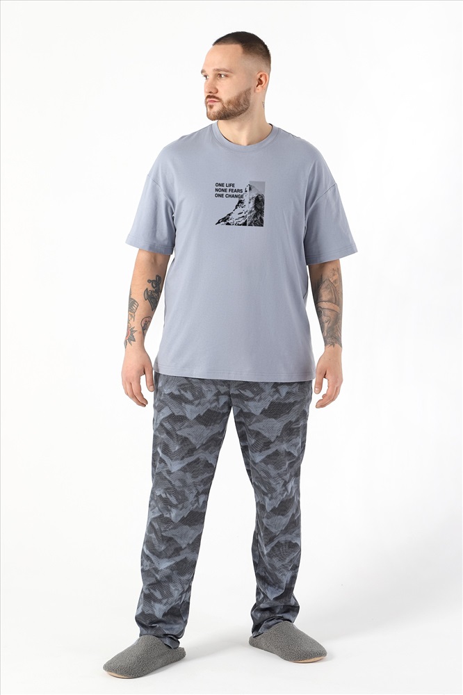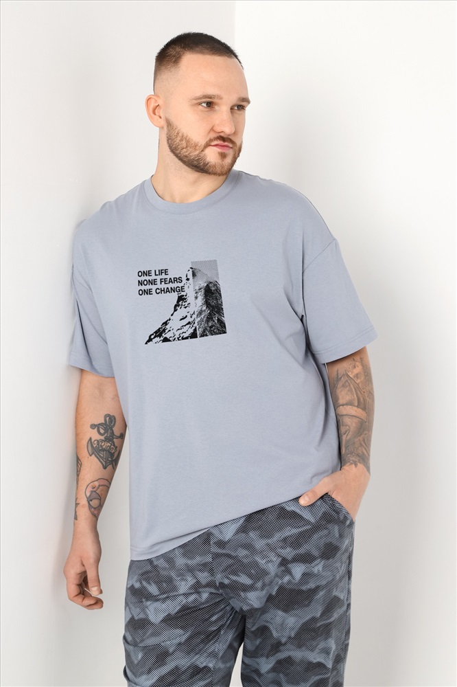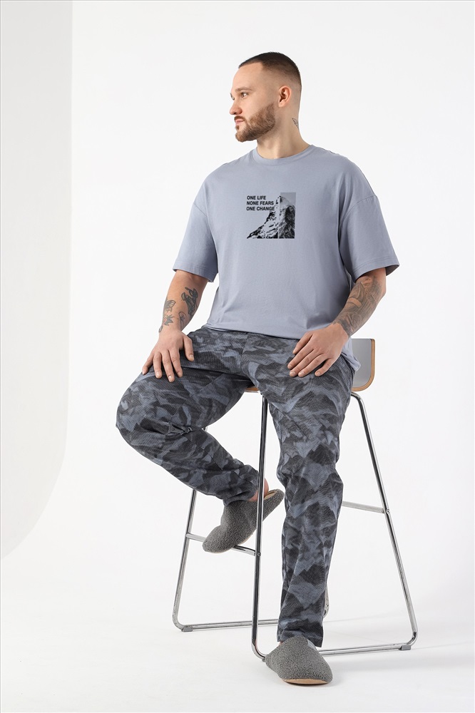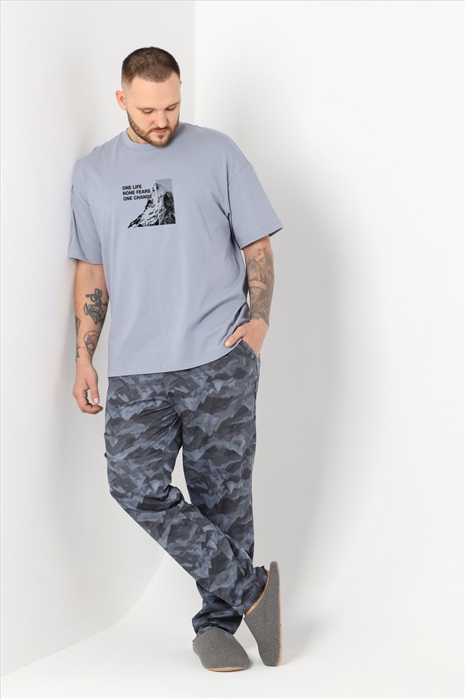 Костюм мужской из трикотажного полотна "кулирка" в комбинации двух видов , состоящий из футболки и брюк. Футболка - из гладкокрашеного полотна, свободного покроя, со спущенным плечом, короткими втачными рукавами, горловиной овальной формы, обработанной втачной планкой, и принтом в центре переда. По шву втачивания планки настрочена двойная отделочная строчка. Брюки - из полотна с набивным рисунком, на притачном поясе с эластичной тесьмой внутри, с карманами в боковых швах. Входы в карманы окантованы основным материалом.