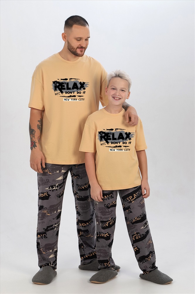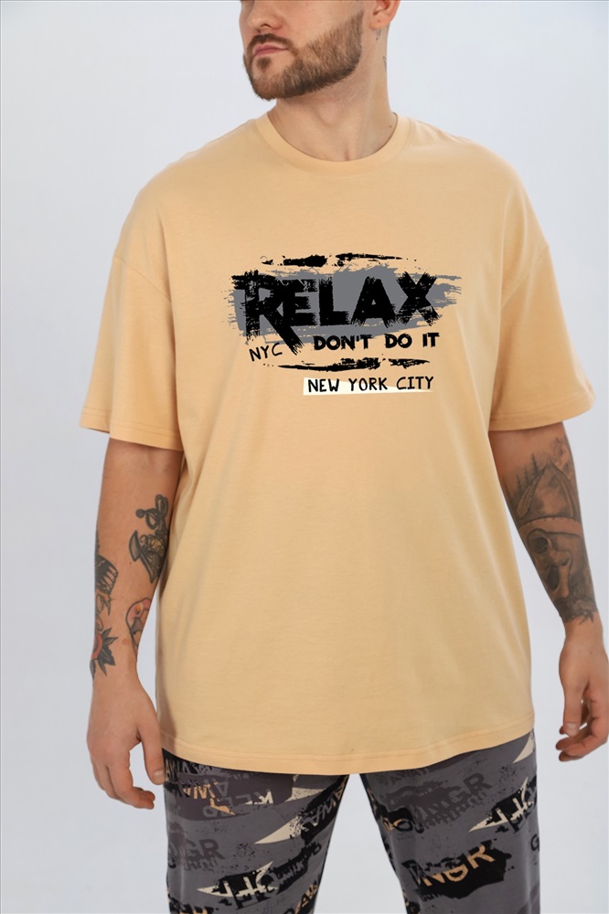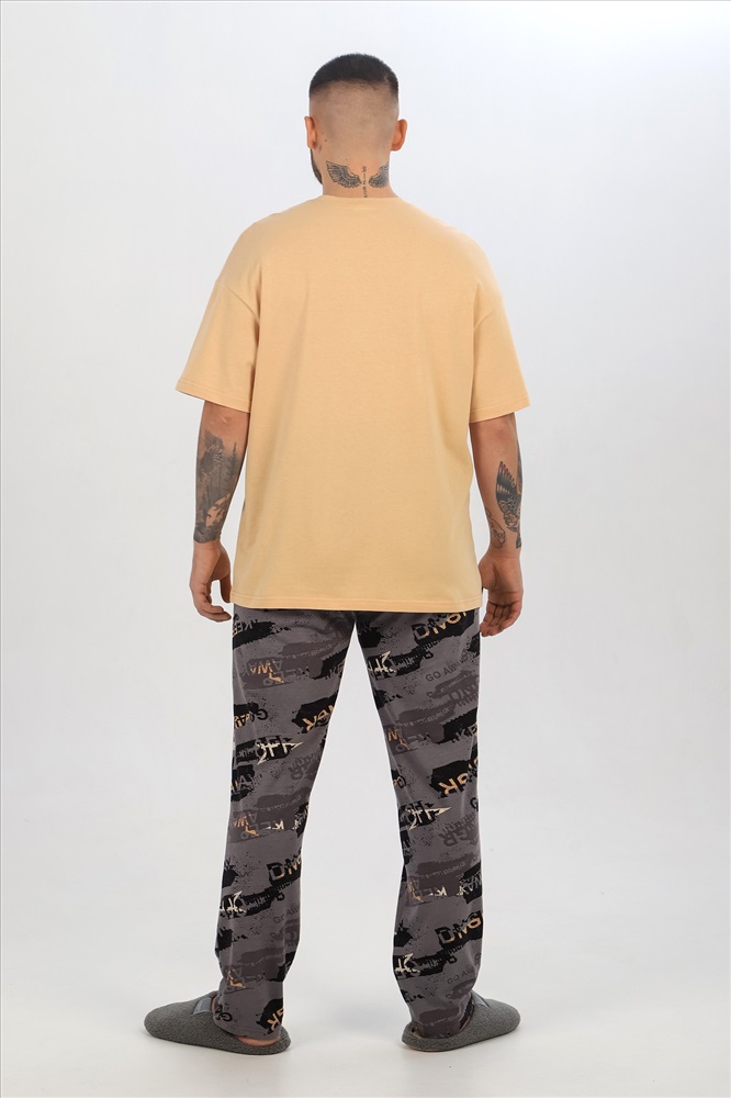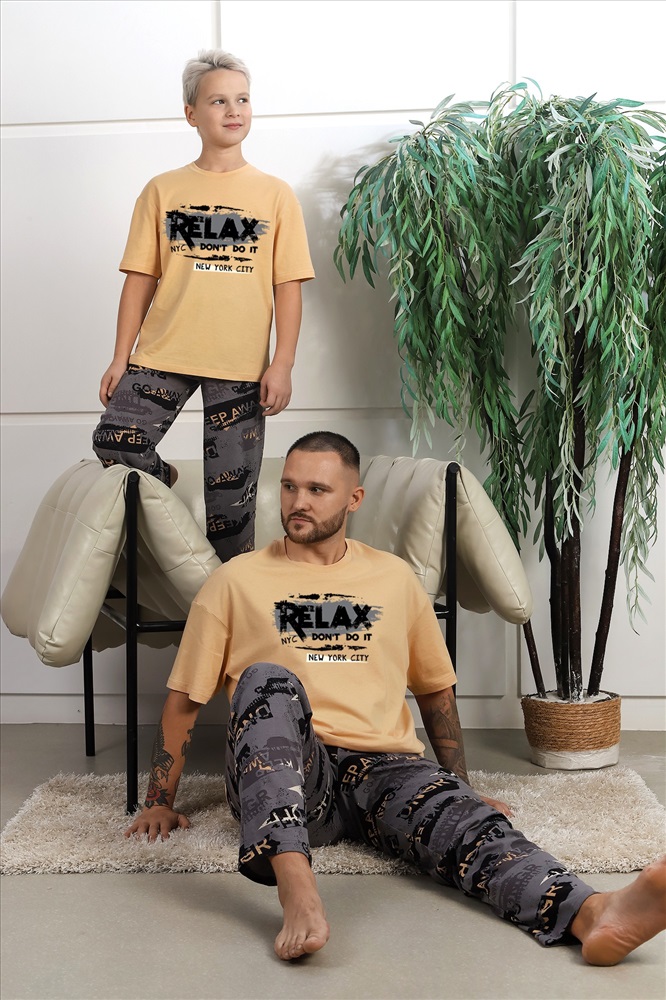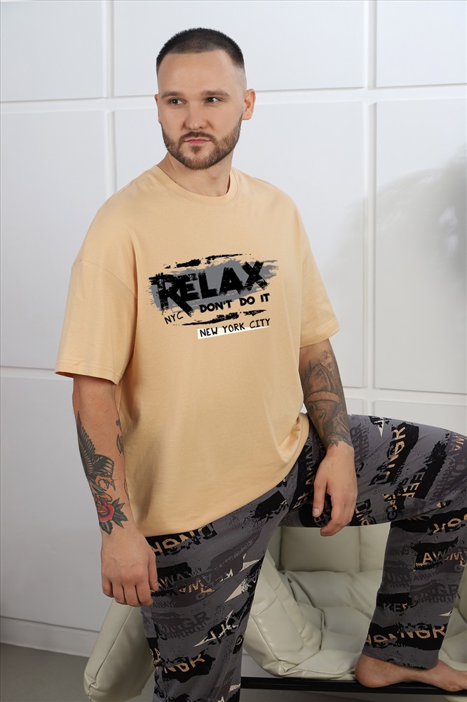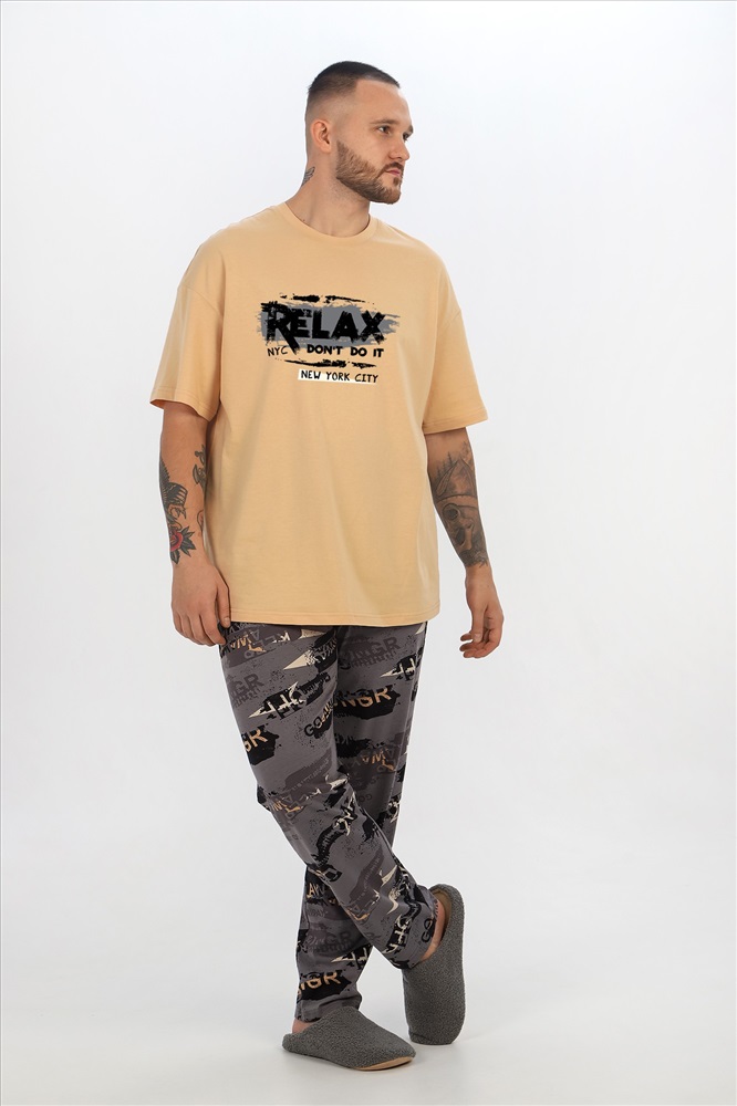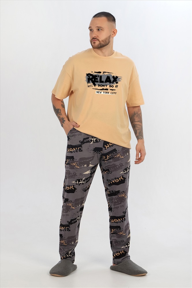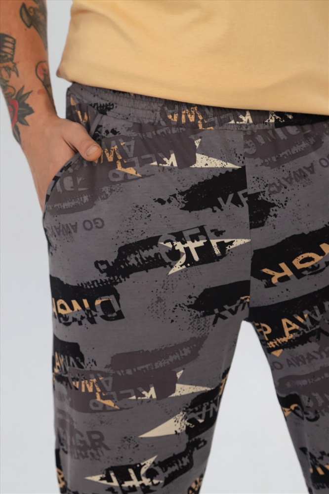 Костюм мужской ,состоящий из футболки и брюк. Футболка - из гладкокрашеного полотна "кулирка", классического покроя, с короткими втачными рукавами, горловиной овальной формы, обработанной втачной планкой, и принтом вцентре переда, выполненным в технике шелкографии. Брюки - из полотна с набивным рисунком, прямого силуэта, на притачном поясе с эластичнойтесьмой внутри и карманами в боковых швах, входы в которые окантованы основным материалом.