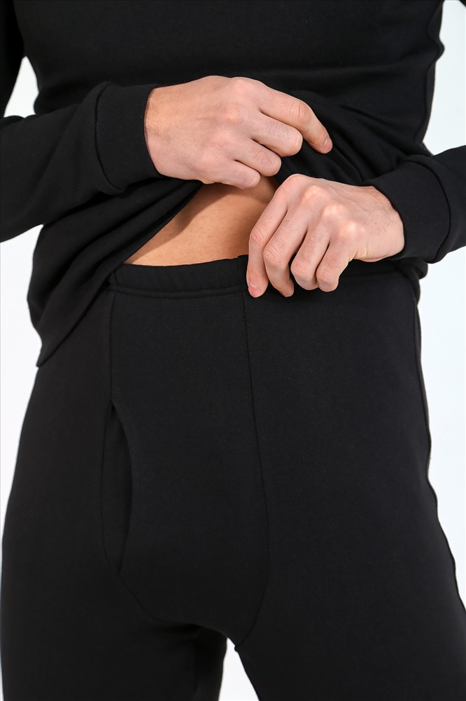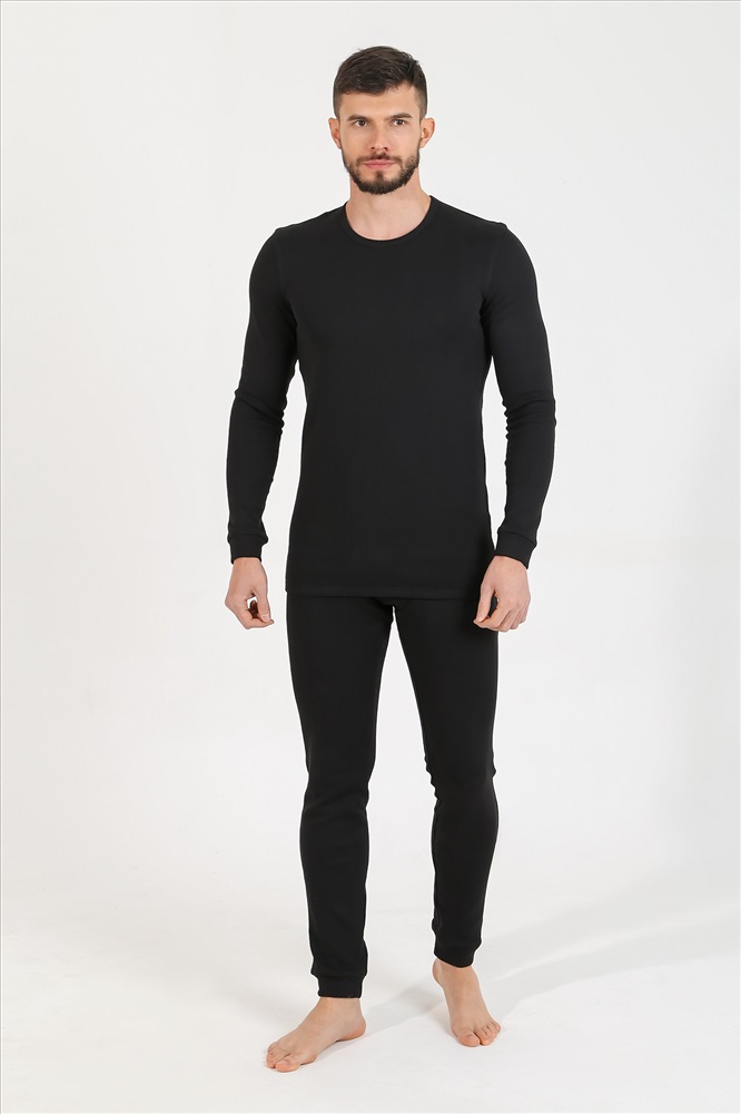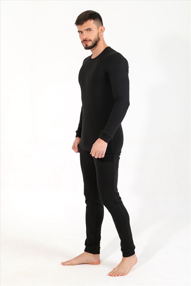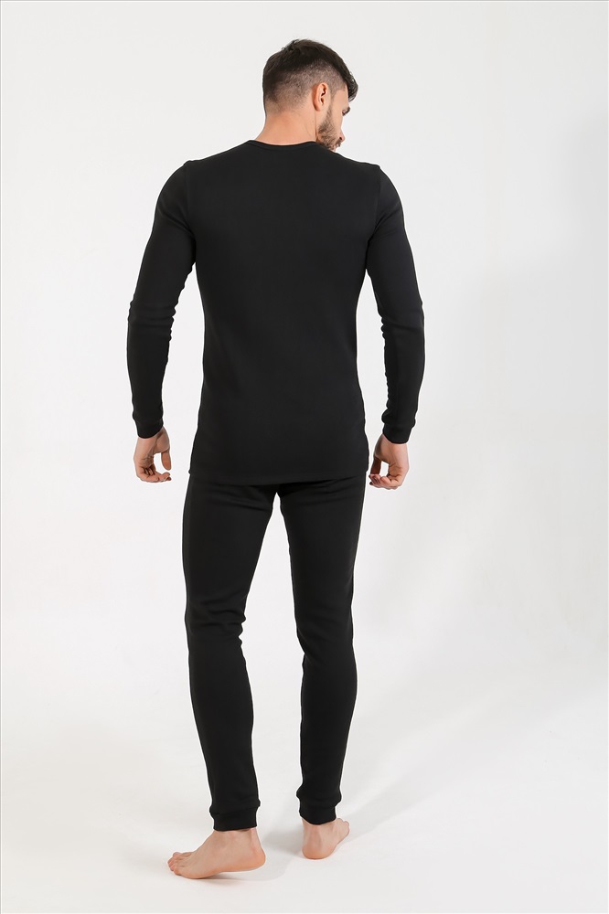 Костюм нательный мужской из рибаны с начесом для сохранения тепла. Джемпер базового покроя, с окантованной горловиной, манжетами по низу рукавов. Брюки-кальсоны с функциональной вставкой спереди, на манжетах по низу.