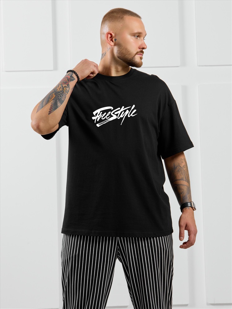 Костюм мужской, состоящий из футболки и брюк. Футболка однотонная с принтом на груди; модель свободная, со спущенной линией плеч. Брюки из полотна с набивным рисунком в узкую черно-белую полоску, прямые, с боковыми карманами с обтачными входами, на притачном поясе с отстроченной эластичной тесьмой.