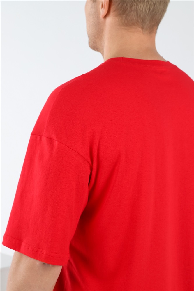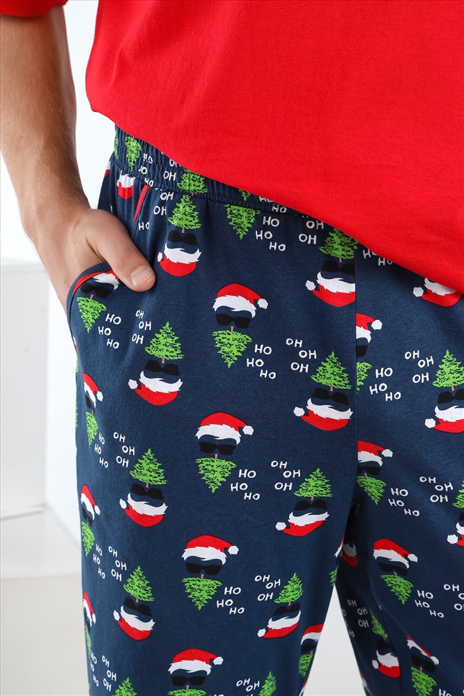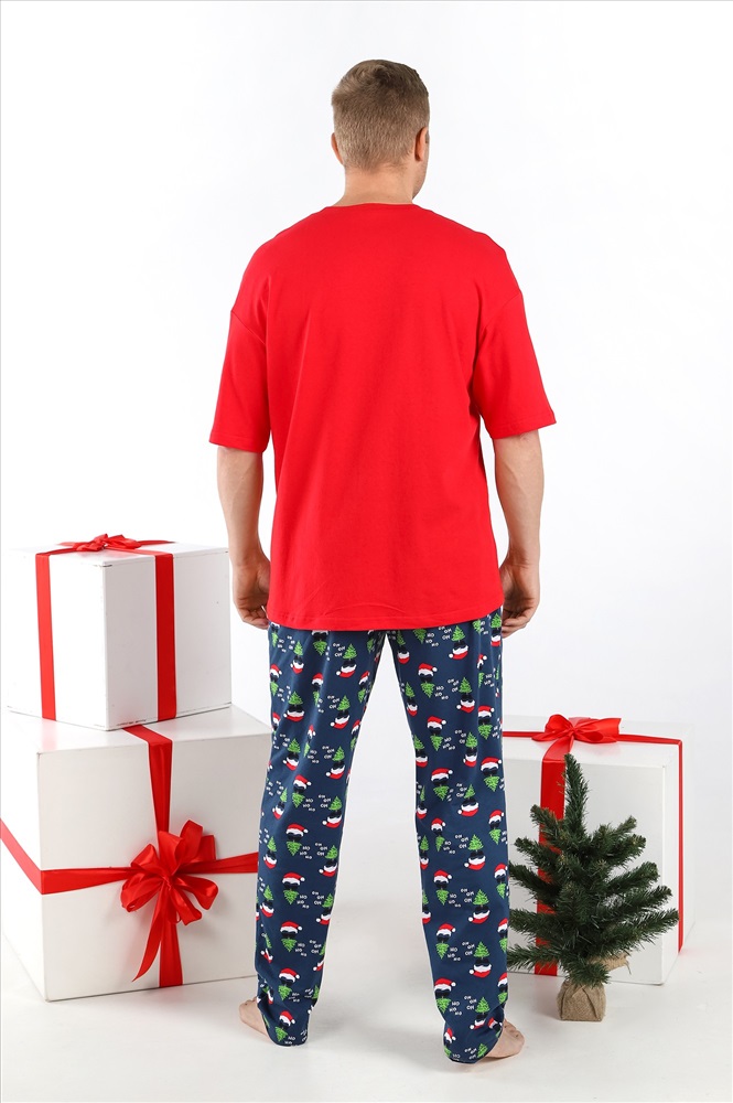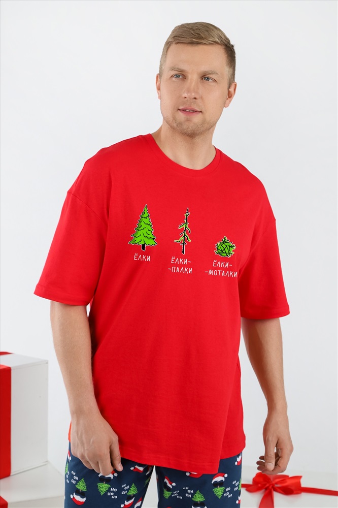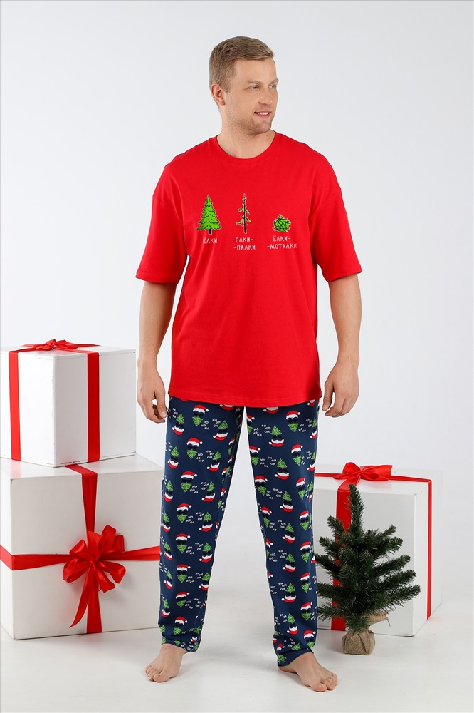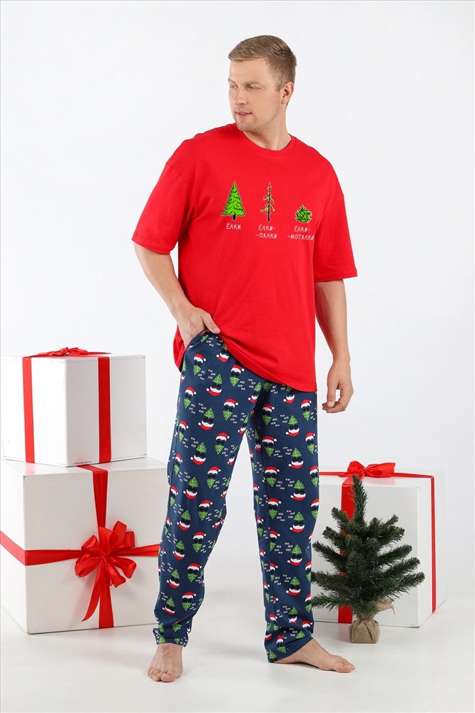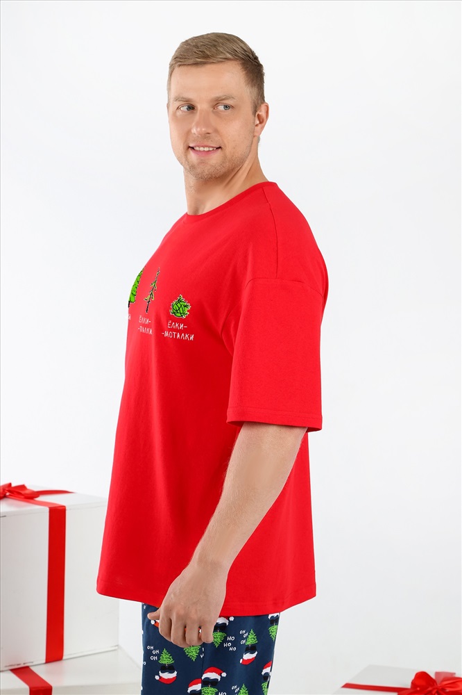 Костюм мужской, состоящий из футболки и брюк.Футболка - из гладкокрашеного полотна с принтом на детали переда, классического покроя, с короткими втачными рукавами, удлиненными плечевыми швами и горловиной овальной формы, обработанной втачной планкой. По шву втачивания планки в горловину настрочена отделочная строчка. Нижние срезы рукавов и изделия обработаны швом вподгибку. Брюки - из полотна с набивным рисунком, длинные, на притачном поясе с эластичной тесьмой внутри и карманами в боковых швах. Нижние срезы обработаны швом вподгибку.