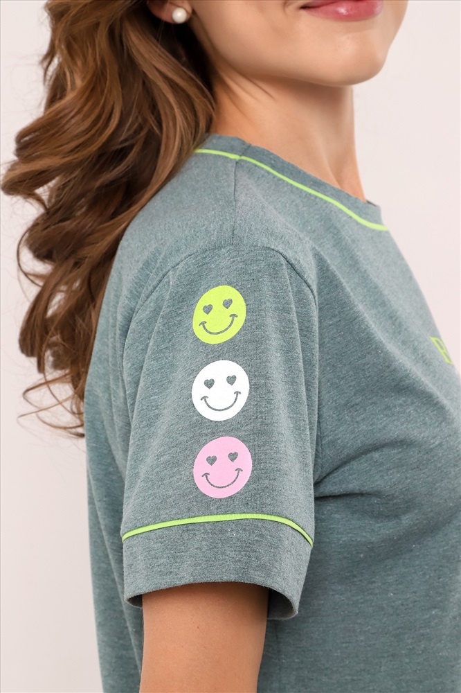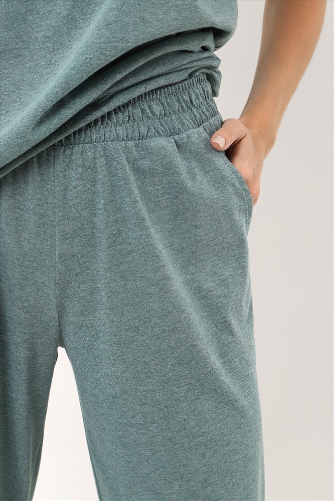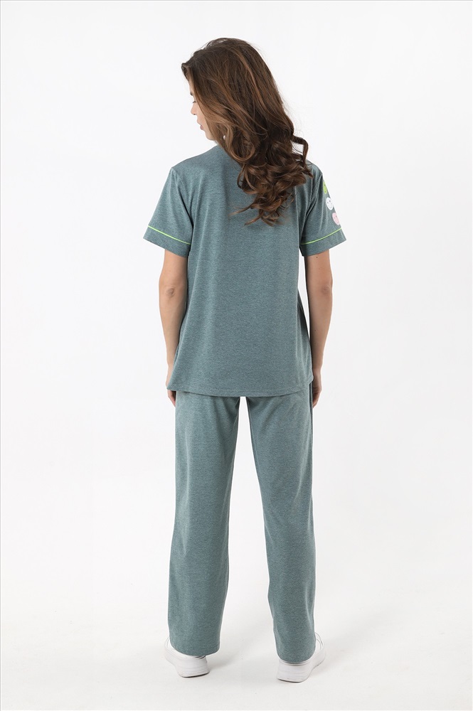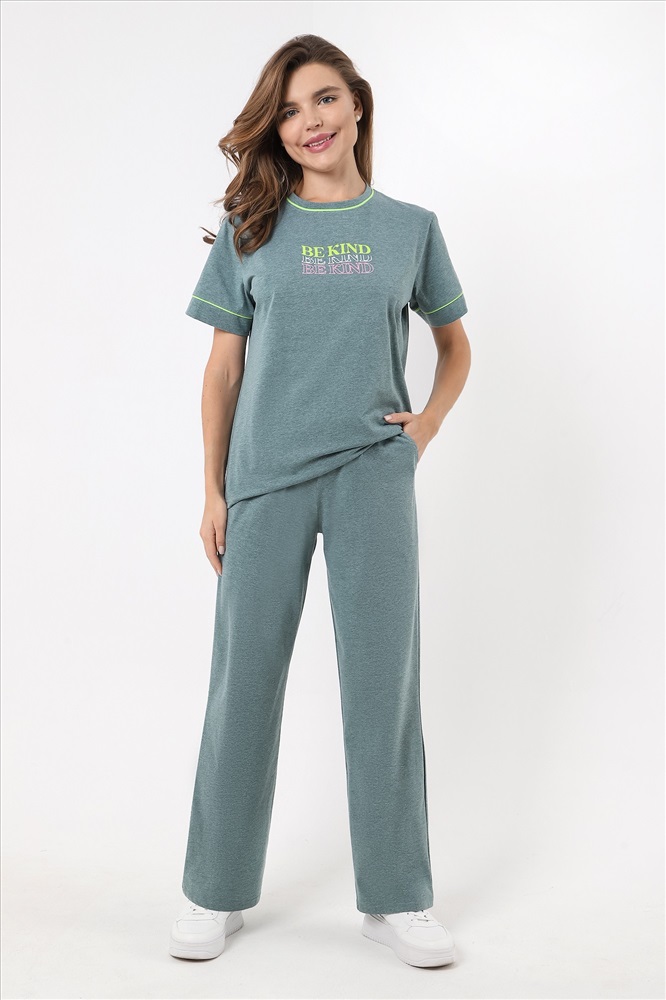 Костюм молодежный из гладкокрашенного трикотажного полотна «кулирка меланж» состоящий из футболки и брюк. Футболка – свободного покроя, с короткими втачными рукавами, горловиной овальной формы, обработанной двойной притачной бейкой из контрастного материала. На полочке и рукаве принт, выполненный в технике «шелкографии», рукава с отделочными манжетами и кантом.Брюки – свободные, с карманами в боковых швах, на притачном поясе с эластичной тесьмой внутри.