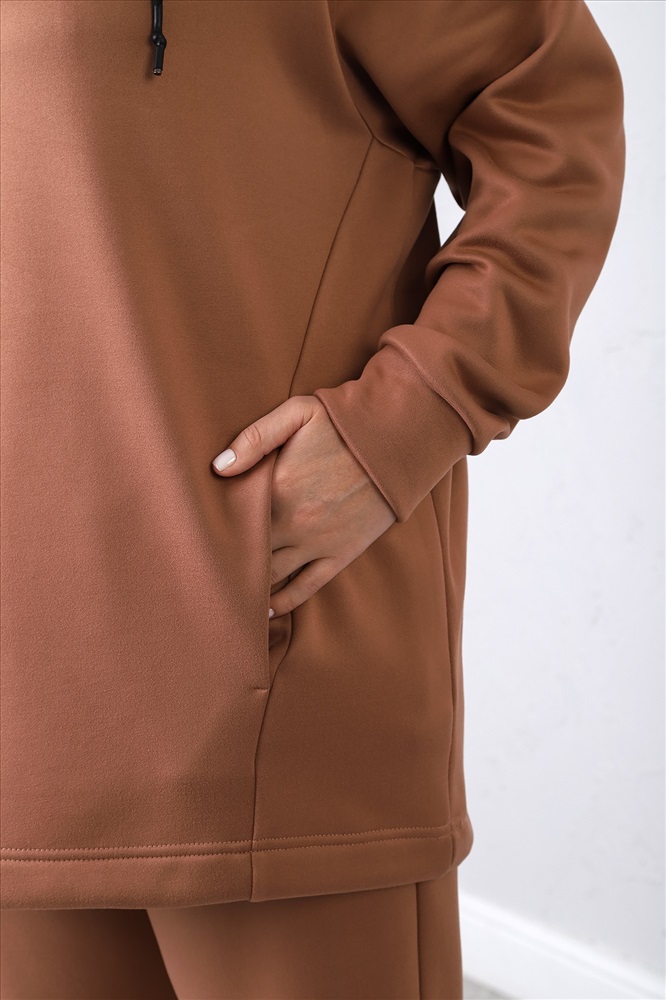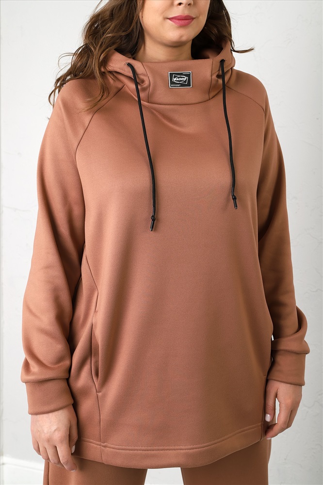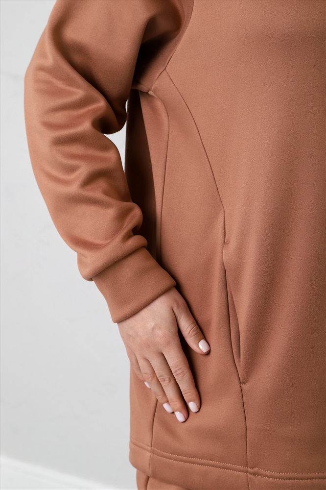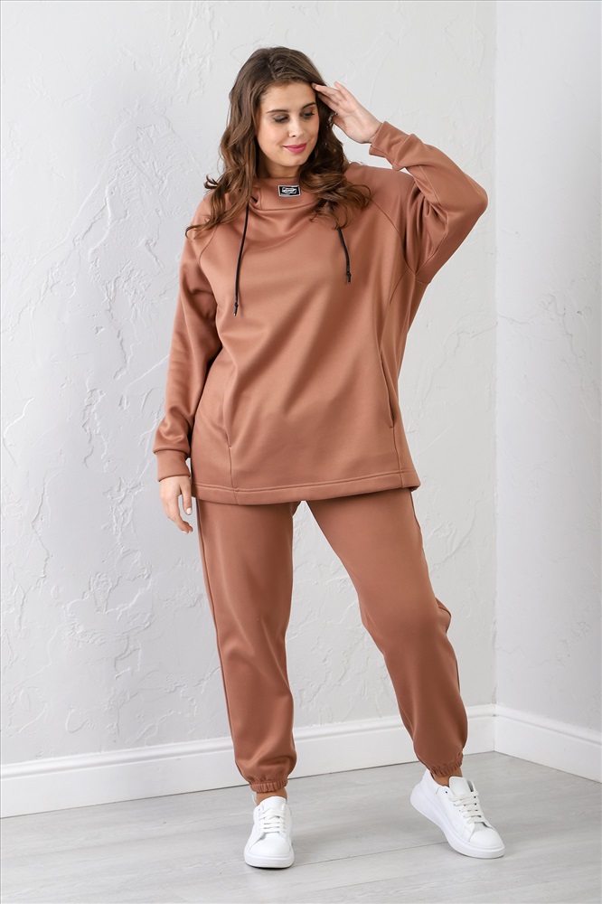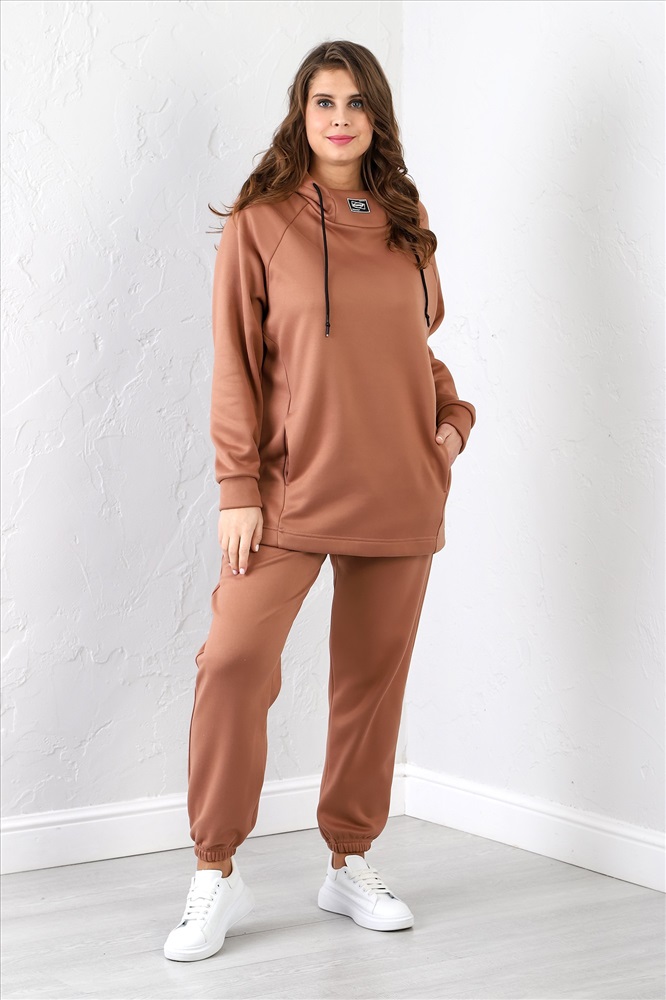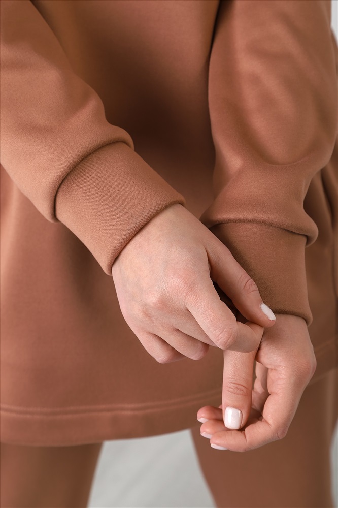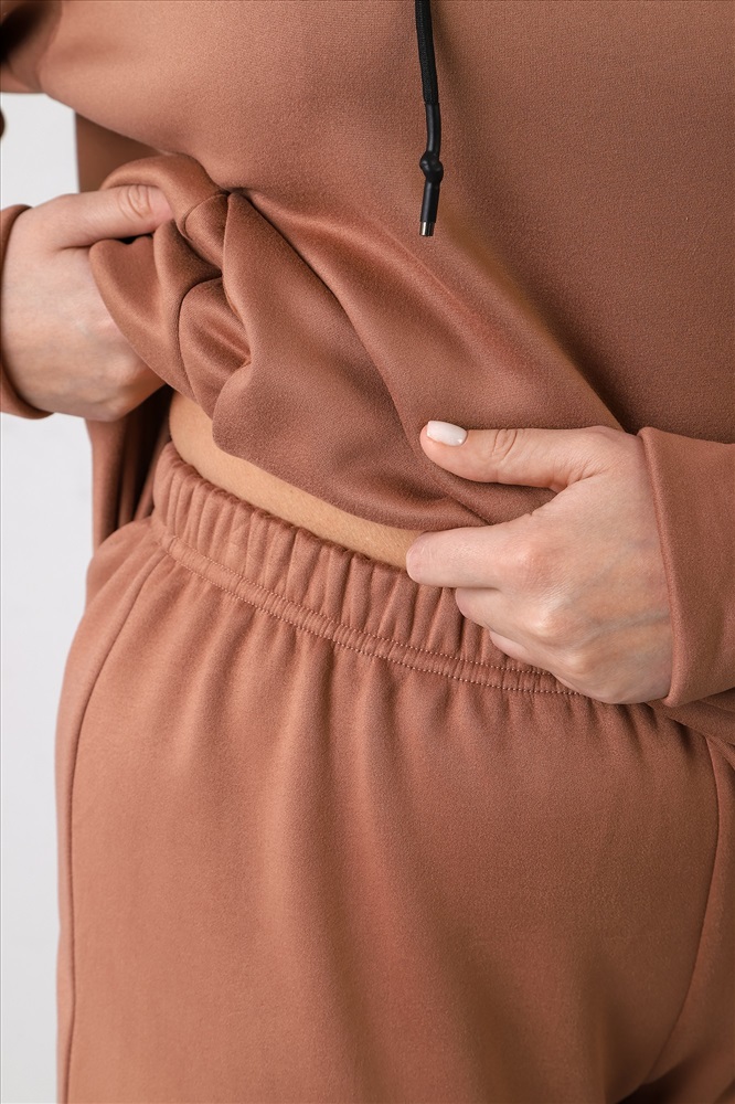Костюм молодежный из гладкокрашеного полотна «Интерсофт», состоящий из худии и брюк. Худи – свободного покроя, с длинными рукавами «реглан» и капюшоном с подкладкой из основного материала. На центральной детали капюшона настрочен декоративный элемент прямоугольной формы. Полочка – с карманами в рельефных швах, выходящих из пройм. Рукава – с притачными манжетами. Брюки – длинные, с эластичной тесьмой по талии и низу.