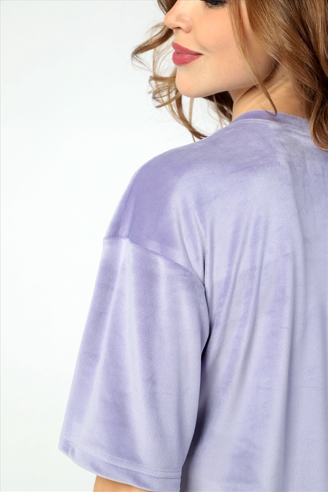 Костюм из гладкокрашеного трикотажного полотна «велюр стрейч», состоящий из футболки и леггинсов. Футболка – удлиненная, свободного покроя, со спущенной, линией плеча, короткими втачными рукавами, горловиной овальной формы, обработанной втачной планкой.Леггинсы – длиной до колен, с эластичной тесьмой по талии.