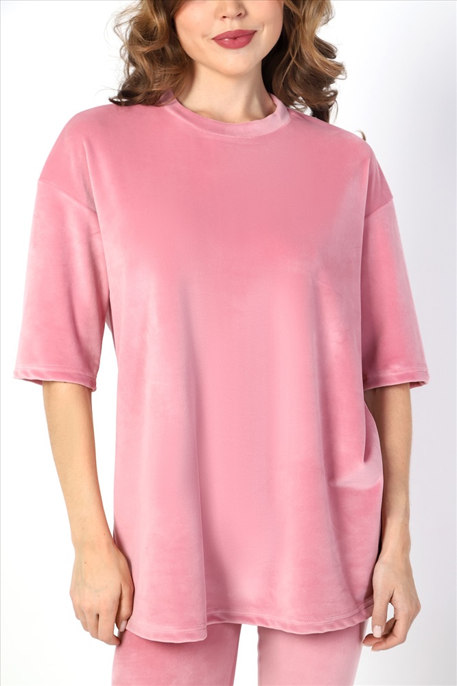 Костюм из гладкокрашеного трикотажного полотна «велюр стрейч», состоящий из футболки и леггинсов. Футболка – удлиненная, свободного покроя, со спущенной, линией плеча, короткими втачными рукавами, горловиной овальной формы, обработанной втачной планкой.Леггинсы – длиной до колен, с эластичной тесьмой по талии.