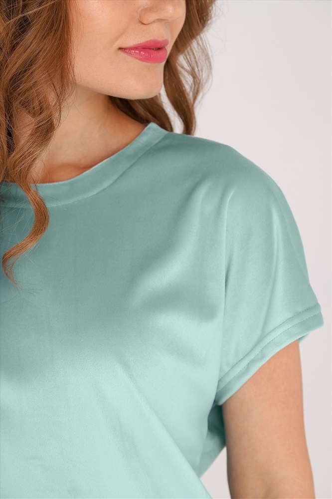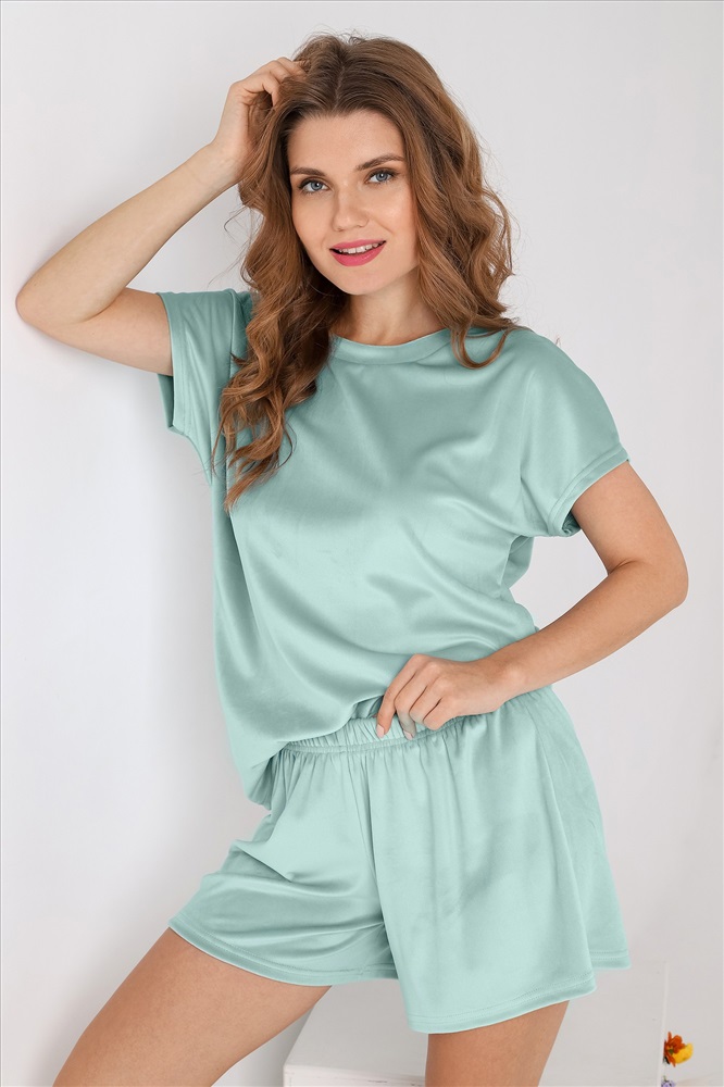 Костюм молодежный из трикотажного полотна «велюр-стрейч», состоящий из футболки и шорт. Футболка – классического покроя, с короткими цельнокроеными рукавами и горловиной овальной формы, обработанной втачной планкой. Шорты - средней длины, расширенные книзу, с эластичной тесьмой по талии.
