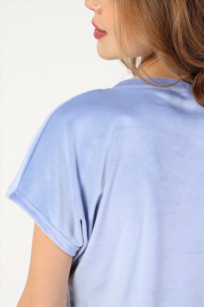 Костюм молодежный из трикотажного полотна «велюр-стрейч», состоящий из футболки и шорт. Футболка – классического покроя, с короткими цельнокроеными рукавами и горловиной овальной формы, обработанной втачной планкой. Шорты - средней длины, расширенные книзу, с эластичной тесьмой по талии.