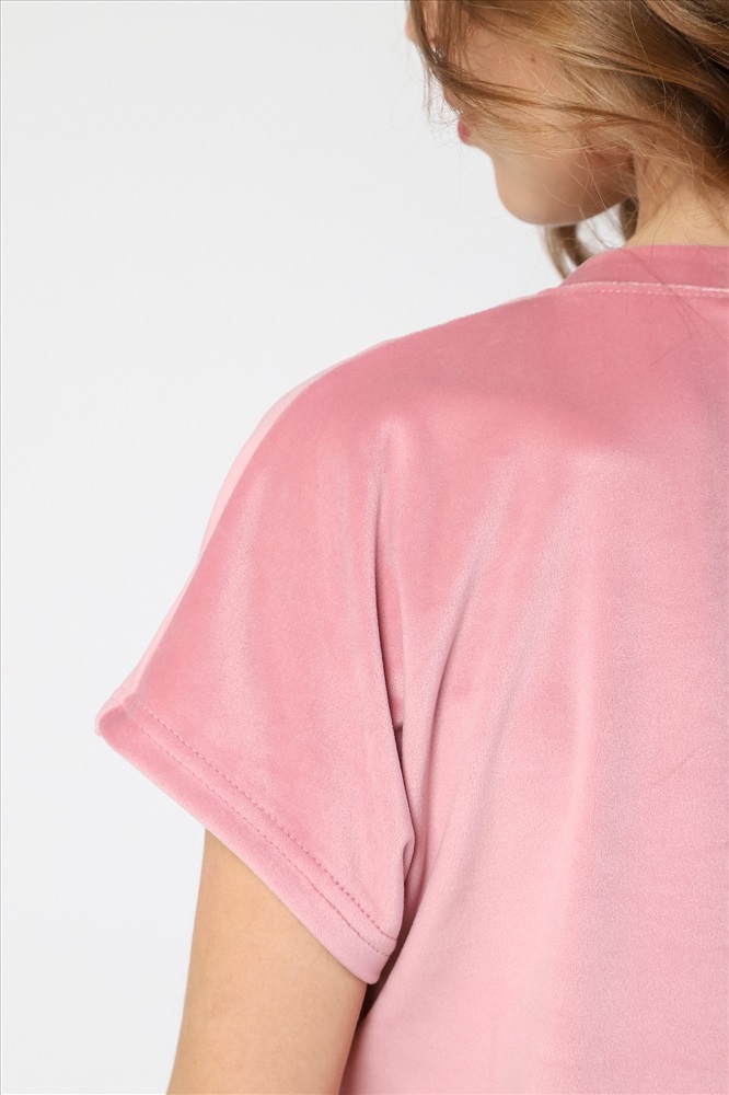 Костюм молодежный из трикотажного полотна «велюр-стрейч», состоящий из футболки и шорт. Футболка – классического покроя, с короткими цельнокроеными рукавами и горловиной овальной формы, обработанной втачной планкой. Шорты - средней длины, расширенные книзу, с эластичной тесьмой по талии.