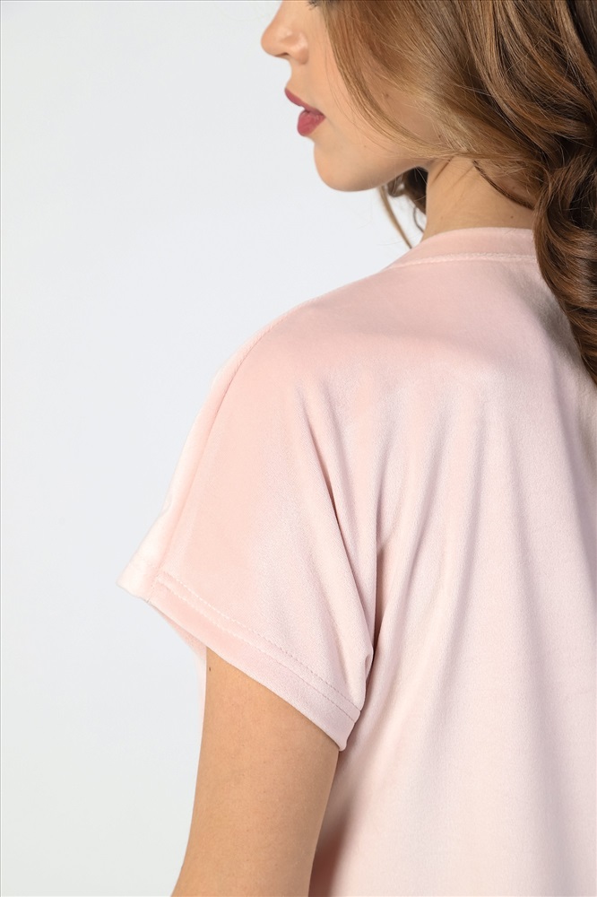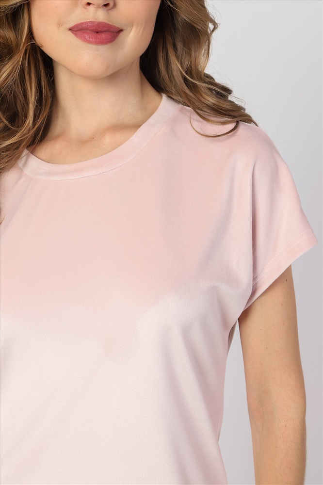 Костюм молодежный из трикотажного полотна «велюр-стрейч», состоящий из футболки и шорт. Футболка – классического покроя, с короткими цельнокроеными рукавами и горловиной овальной формы, обработанной втачной планкой. Шорты - средней длины, расширенные книзу, с эластичной тесьмой по талии.