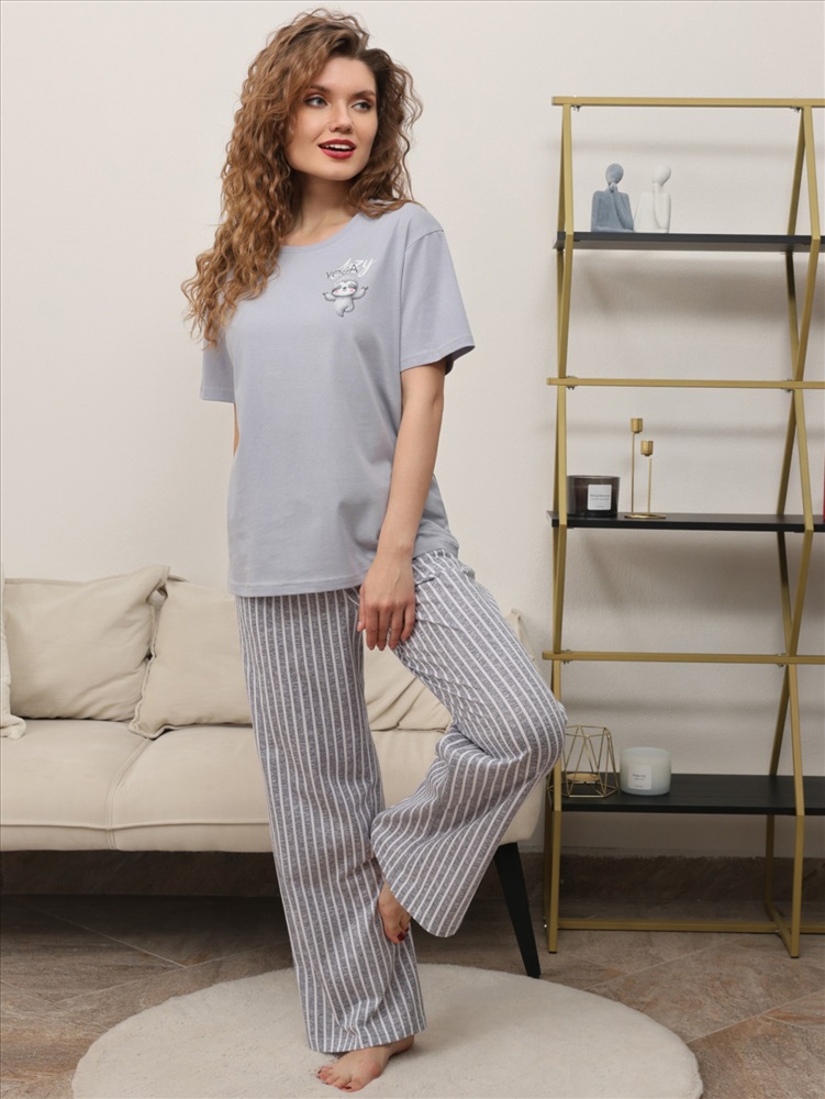 Костюм молодежный из трикотажного полотна «кулирка» в комбинации двух видов: с набивным рисунком и гладкокрашенного в единой цветовой гамме, состоящий из футболки и брюк. Футболка - из гладкокрашенного полотна, классического покроя, с короткими втачными рукавами, горловиной овальной формы и принтом на полочке, выполненным в технике «шелкографии». Горловина обработана втачной планкой из основного материала. Брюки - из полотна с набивным рисунком, длинные, слегка расширенные книзу, с карманами в боковых швах, на притачном поясе с эластичной тесьмой внутри.
