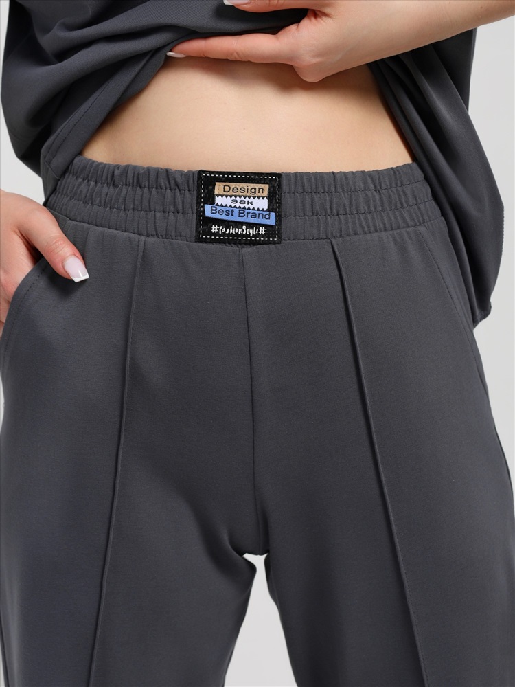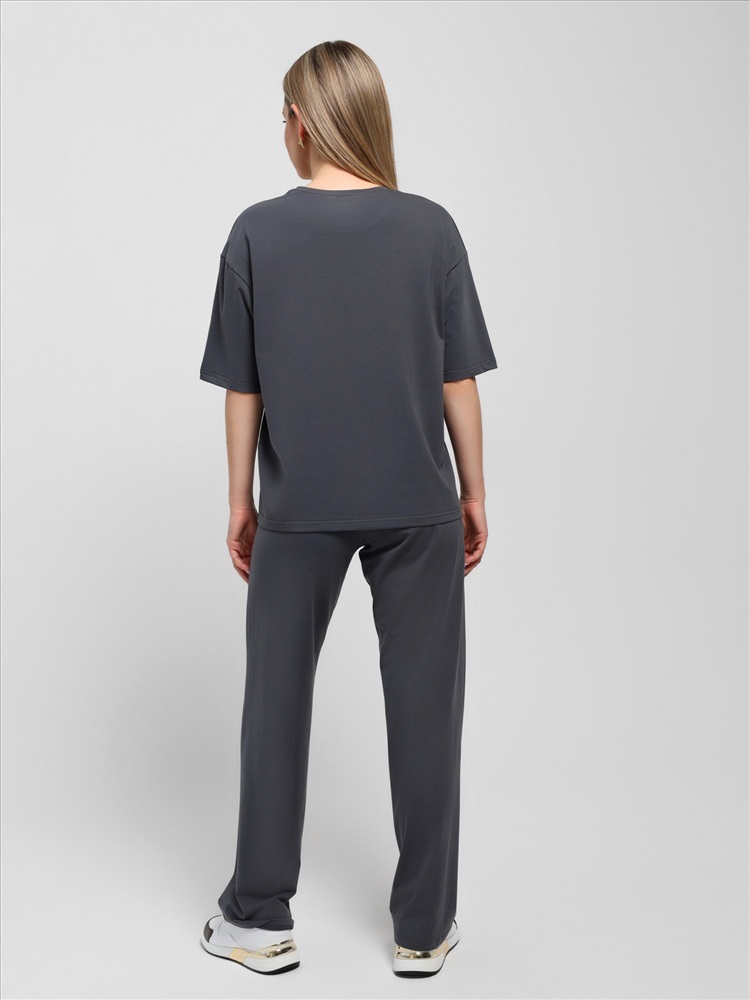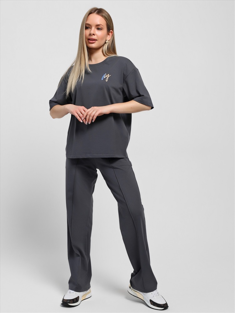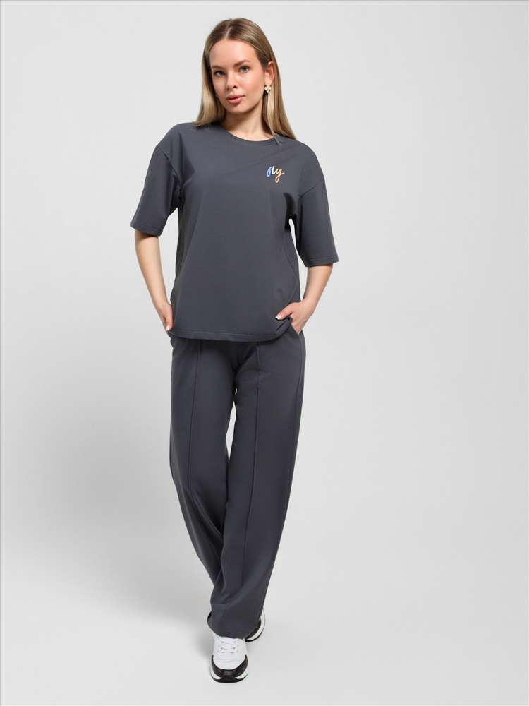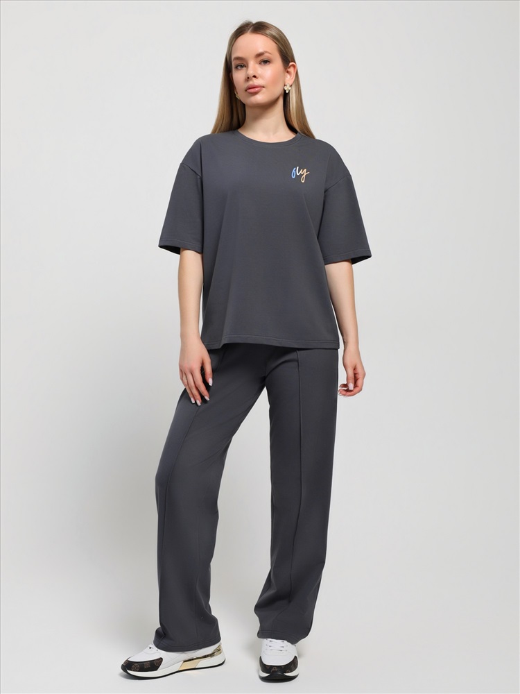 Костюм женский из гладкокрашеного трикотажного полотна "кулирка с лайкрой" состоящий из футболки и брюк. Футболка – классического покроя, с короткими втачными рукавами и горловиной овальной формы, обработанной втачной планкой, на полочке выполнен принт в технике "шелкографии".Брюки – длинные, классического кроя, на притачном поясе с эластичной тесьмой внутри и карманами в боковых швах. Передние половины брюк застрочены по центральным линиям. По центру пояса настрочен декоративный элемент.
