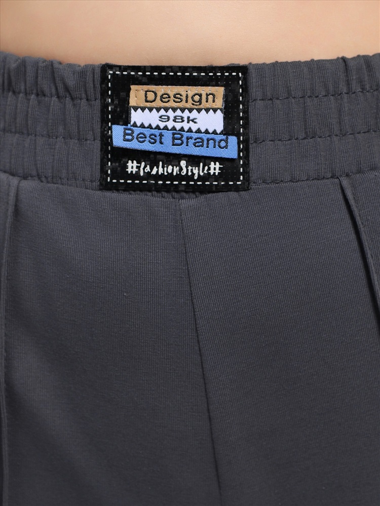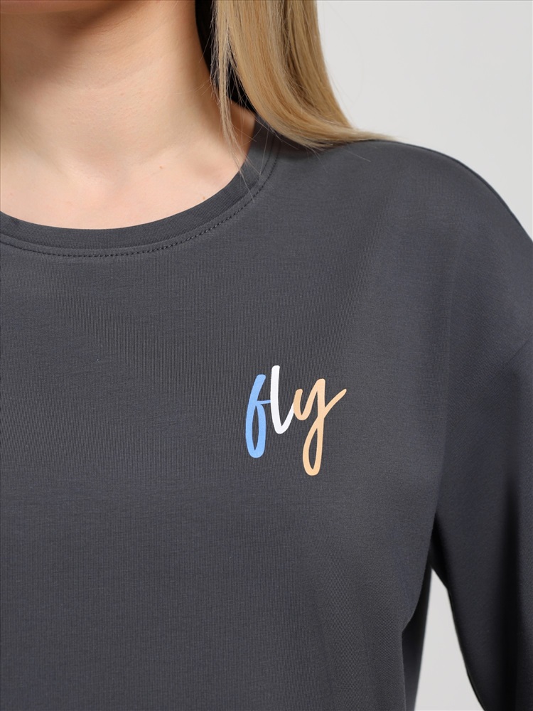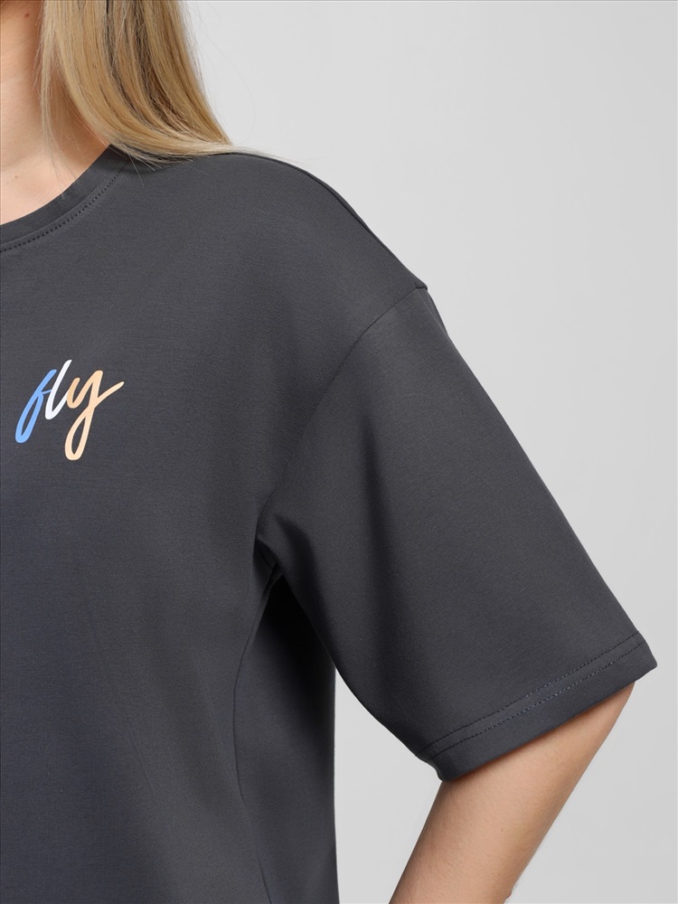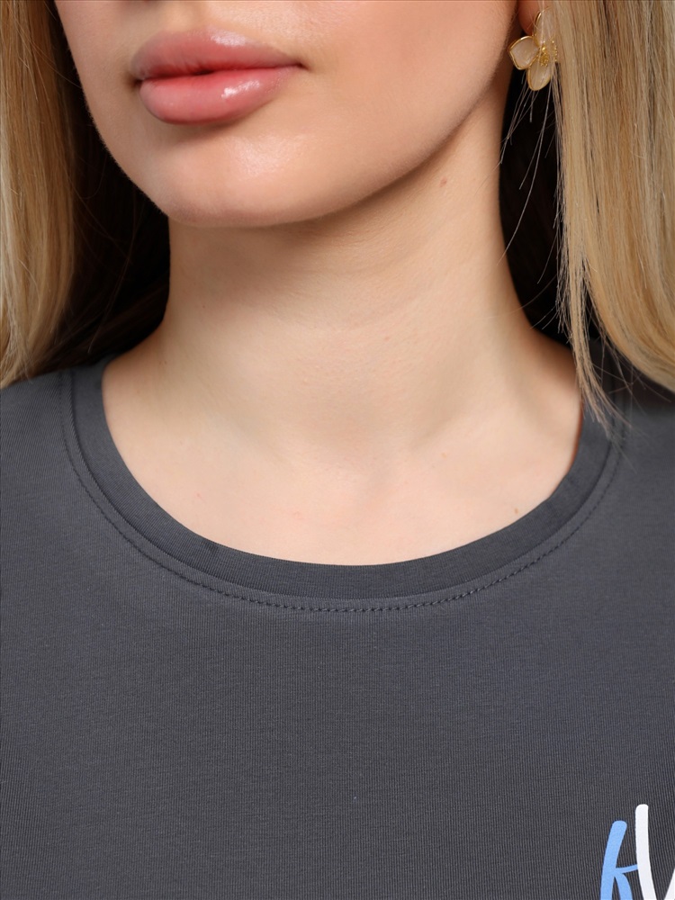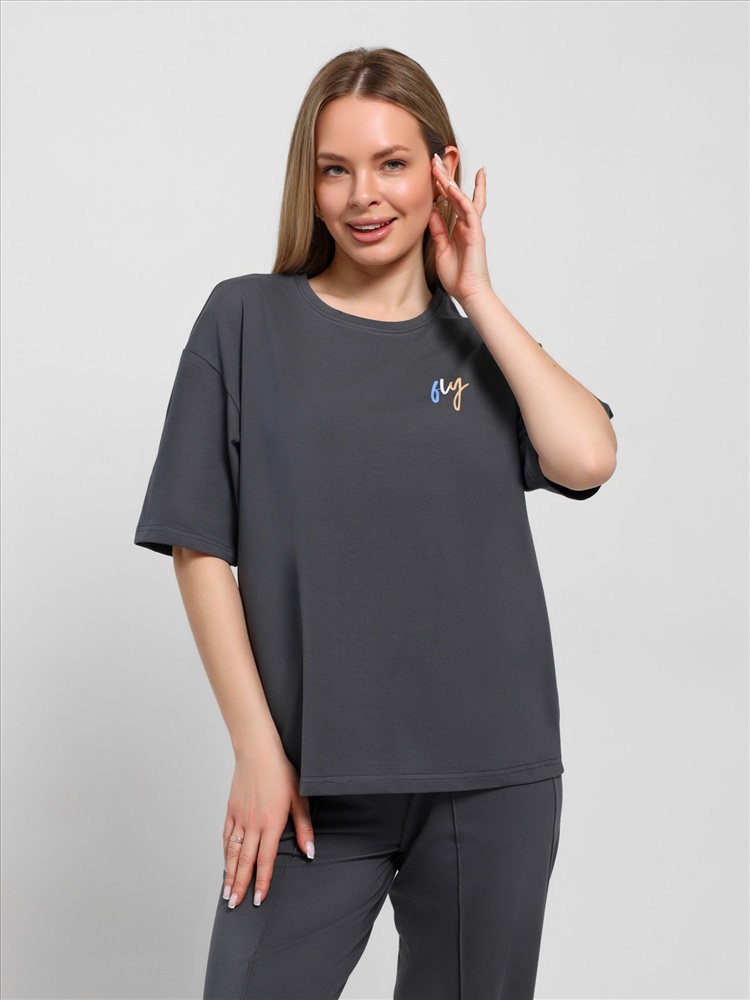 Костюм женский из гладкокрашеного трикотажного полотна "кулирка с лайкрой" состоящий из футболки и брюк. Футболка – классического покроя, с короткими втачными рукавами и горловиной овальной формы, обработанной втачной планкой, на полочке выполнен принт в технике "шелкографии".Брюки – длинные, классического кроя, на притачном поясе с эластичной тесьмой внутри и карманами в боковых швах. Передние половины брюк застрочены по центральным линиям. По центру пояса настрочен декоративный элемент.