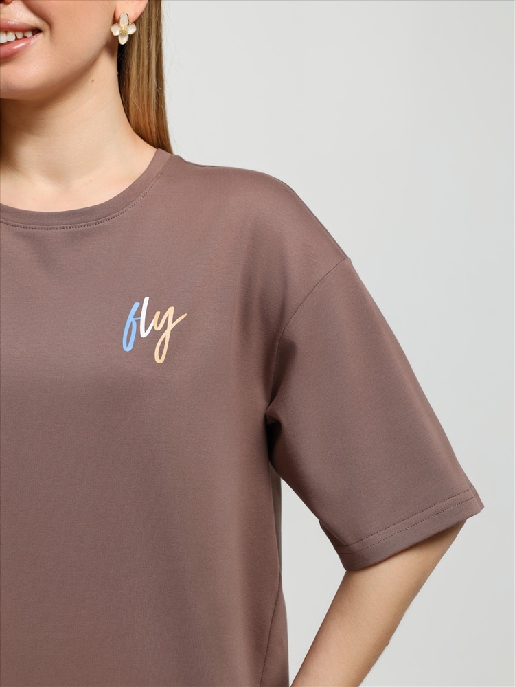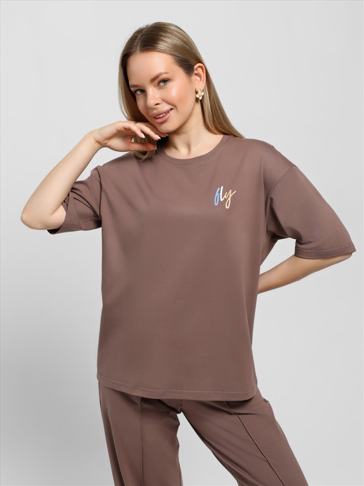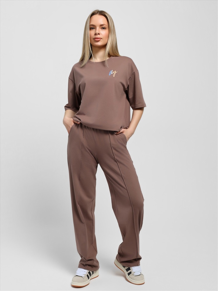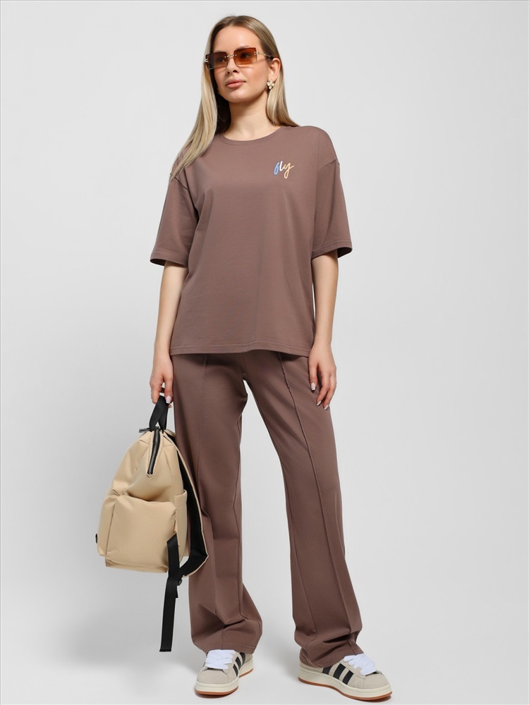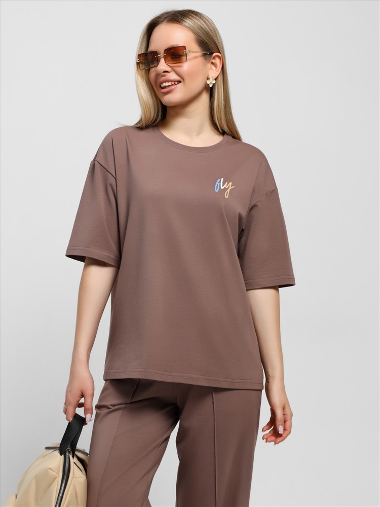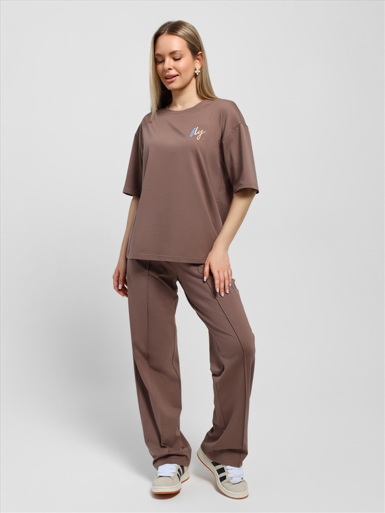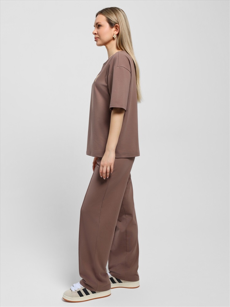 Костюм женский из гладкокрашеного трикотажного полотна "кулирка с лайкрой" состоящий из футболки и брюк. Футболка – классического покроя, с короткими втачными рукавами и горловиной овальной формы, обработанной втачной планкой, на полочке выполнен принт в технике "шелкографии".Брюки – длинные, классического кроя, на притачном поясе с эластичной тесьмой внутри и карманами в боковых швах. Передние половины брюк застрочены по центральным линиям. По центру пояса настрочен декоративный элемент.