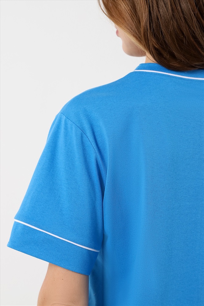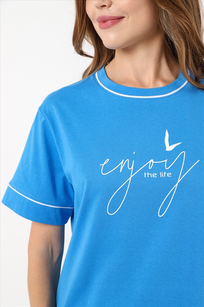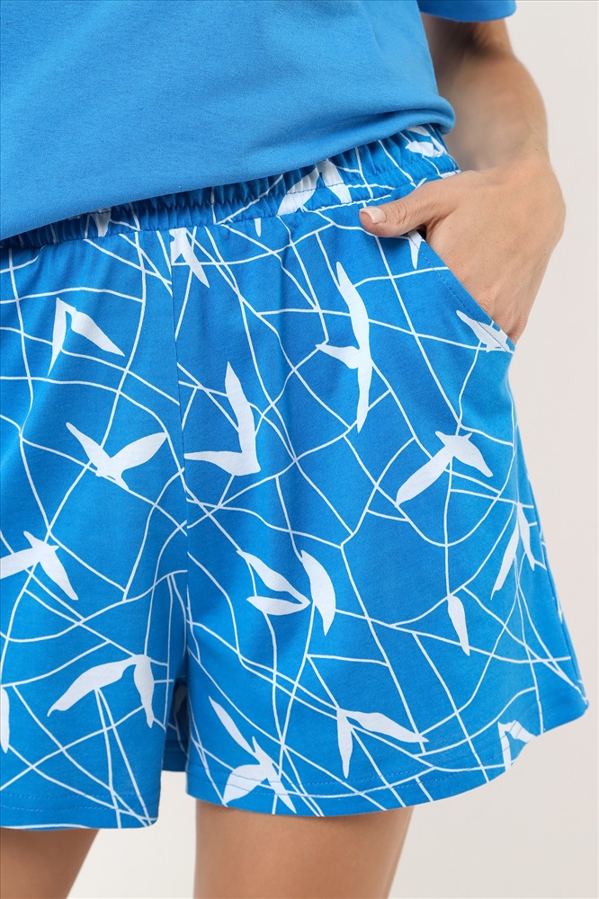 Костюм молодежный из трикотажного полотна «кулирка» в комбинации двух видов полотен: гладкокрашеной и с набивным рисунком, состоящий из футболки и брюк. Футболка – из полотна с набивным рисунком, свободного покроя, с короткими втачными рукавами, горловиной овальной формы, обработанной двойной притачной бейкой из контрастного материала. На полочке принт, выполненный в технике «шелкографии», рукава с отделочными манжетами и кантом.Шорты – из полотна с набивным рисунком, свободные, с карманами в боковых швах, на притачном поясе с эластичной тесьмой внутри.