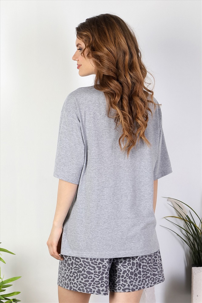 Ткань: Кулирка (меланж) Костюм женский из трикотажного полотна «кулирка» в комбинации двух видов: с набивным рисунком и гладкокрашеного в единой цветовой гамме, состоящий из футболки и шорт. Футболка - из гладкокрашеного полотна, классического покроя, с короткими втачными рукавами, горловиной овальной формы, обработанной окантовкой из основного материала и принтом на полочке, выполненным в технике «шелкографии». Шорты – из полотна с набивным рисунком, свободные, с карманами в боковых швах, на притачном поясе с эластичной тесьмой внутри.