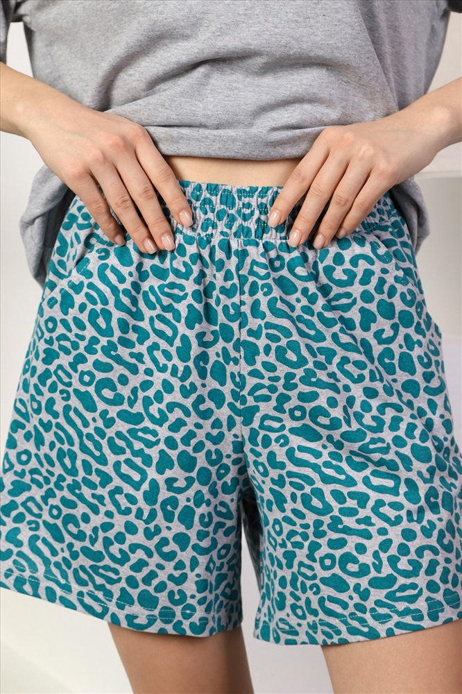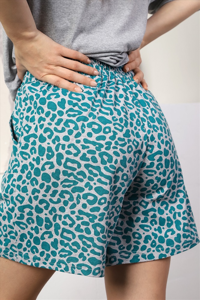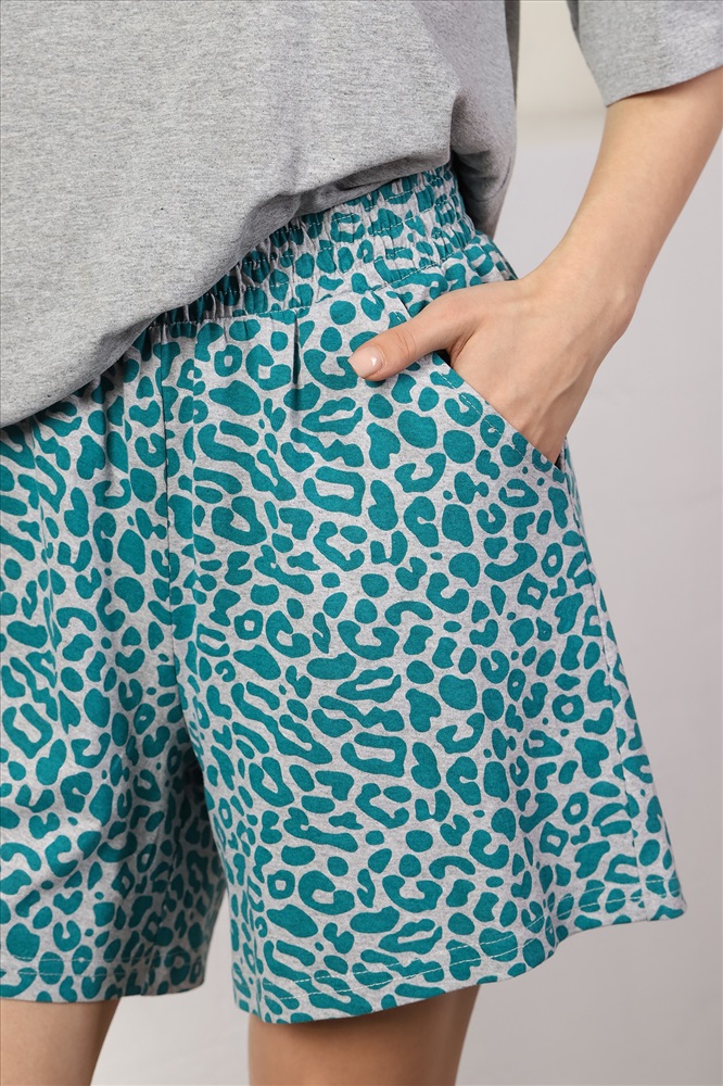 Костюм женский из трикотажного полотна «кулирка» в комбинации двух видов: с набивным рисунком и гладкокрашеного в единой цветовой гамме, состоящий из футболки и шорт. Футболка - из гладкокрашеного полотна, классического покроя, с короткими втачными рукавами, горловиной овальной формы, обработанной окантовкой из основного материала и принтом на полочке, выполненным в технике «шелкографии». Шорты – из полотна с набивным рисунком, свободные, с карманами в боковых швах, на притачном поясе с эластичной тесьмой внутри.