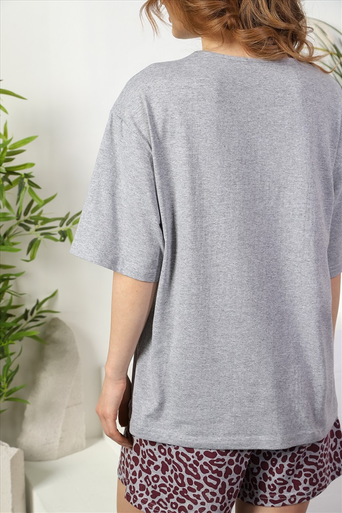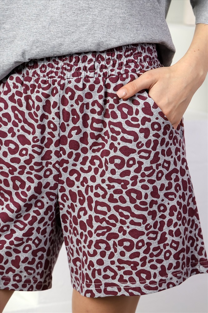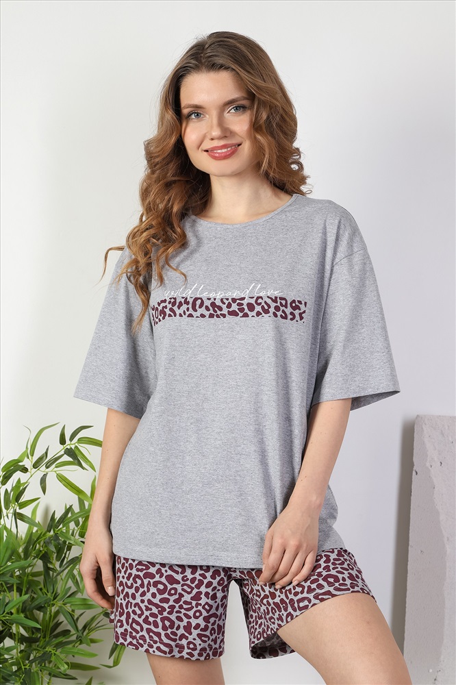 Костюм женский из трикотажного полотна «кулирка» в комбинации двух видов: с набивным рисунком и гладкокрашеного в единой цветовой гамме, состоящий из футболки и шорт. Футболка - из гладкокрашеного полотна, классического покроя, с короткими втачными рукавами, горловиной овальной формы, обработанной окантовкой из основного материала и принтом на полочке, выполненным в технике «шелкографии». Шорты – из полотна с набивным рисунком, свободные, с карманами в боковых швах, на притачном поясе с эластичной тесьмой внутри.