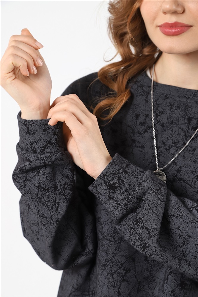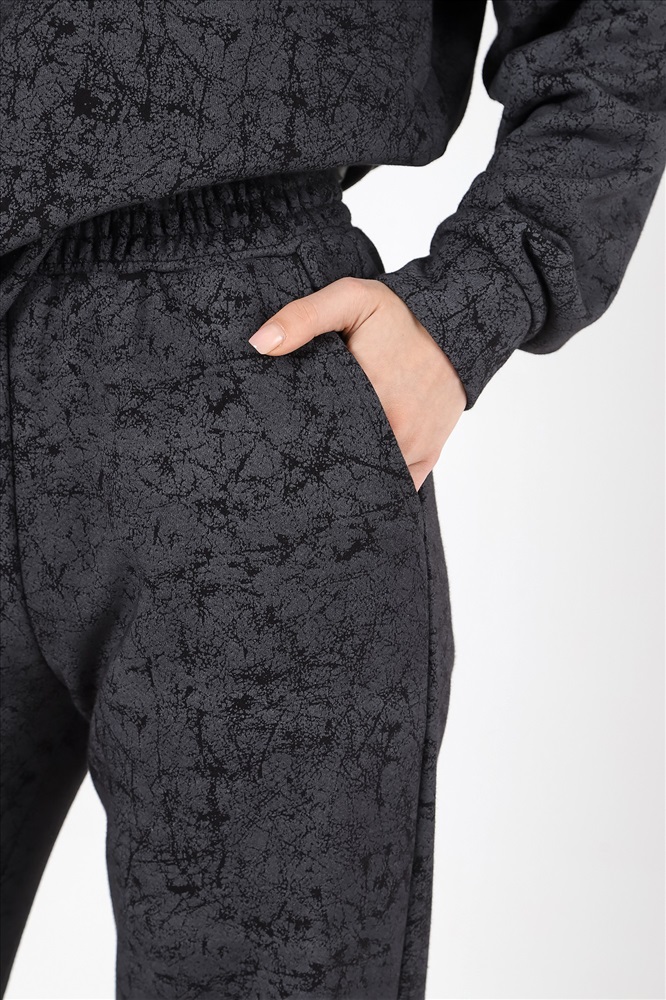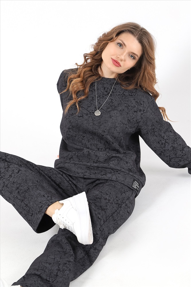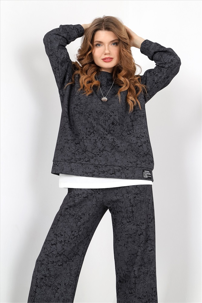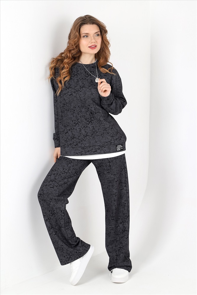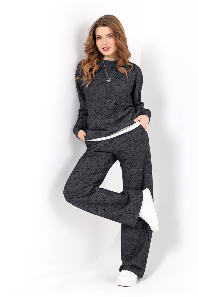 Костюм молодежный из трикотажного полотна футер трехнитка с «эффектом замши», состоящий из джемпера и брюк. Джемпер – прямого силуэта, с длинными втачными рукавами, горловиной овальной формы, обработанной втачной планкой. Рукава с манжетами, низ - с притачным поясом, дополненным декоративным элементом-нашивкой.Брюки – длинные, свободные, на притачном поясе с эластичной тесьмой внутри, карманами в боковых швах.