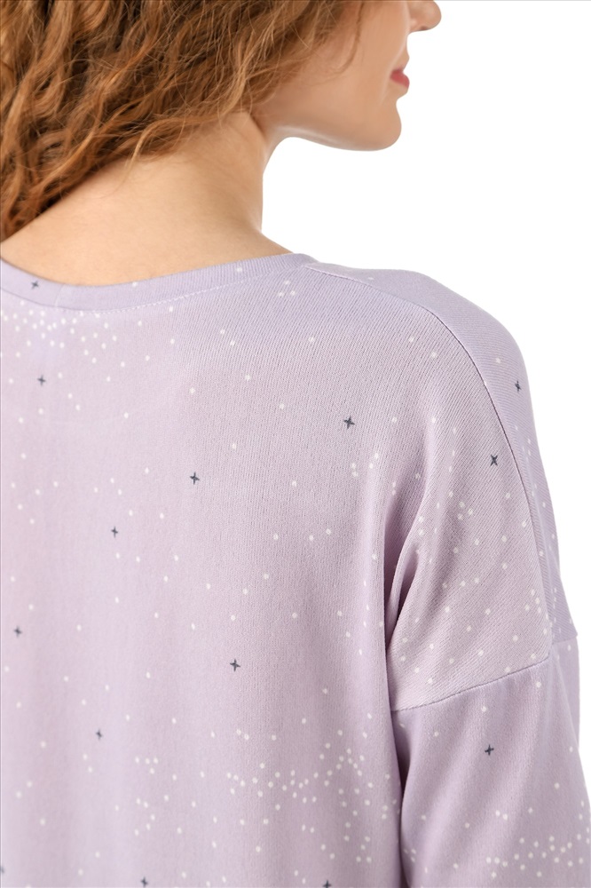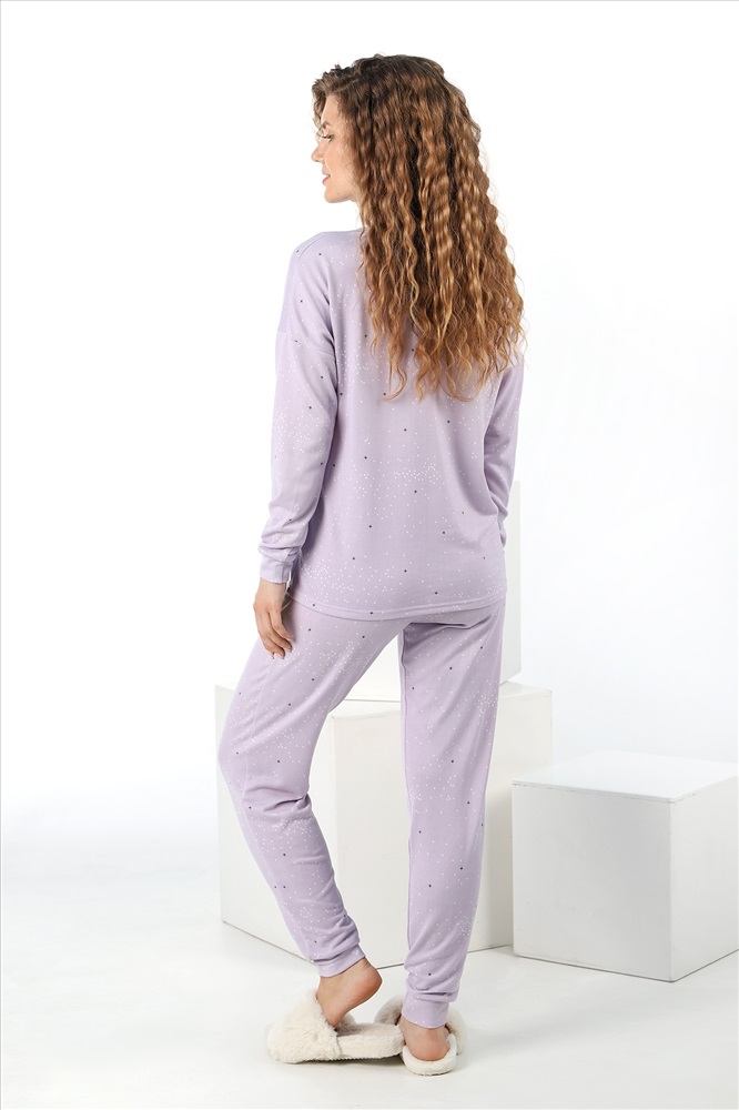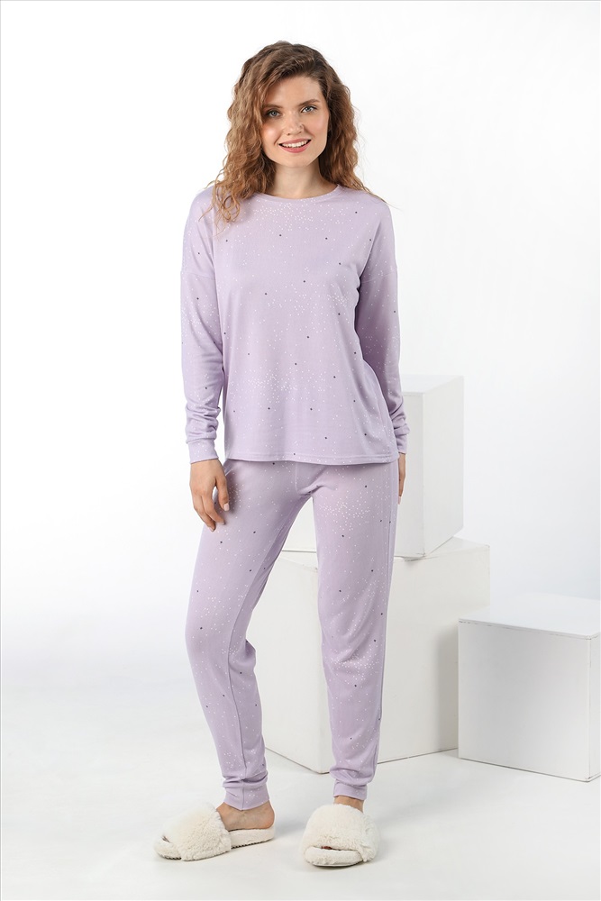 Костюм молодежный из трикотажного синтетического полотна, имитирующего кашемир, состоящий из джемпера и брюк. Джемпер – свободного покроя, с длинными втачными рукавам с притачными манжетами и горловиной овальной формы, обработанной втачной планкой. Брюки – длинные, свободного покроя, с эластичной тесьмой по талии и притачными манжетами по низу.