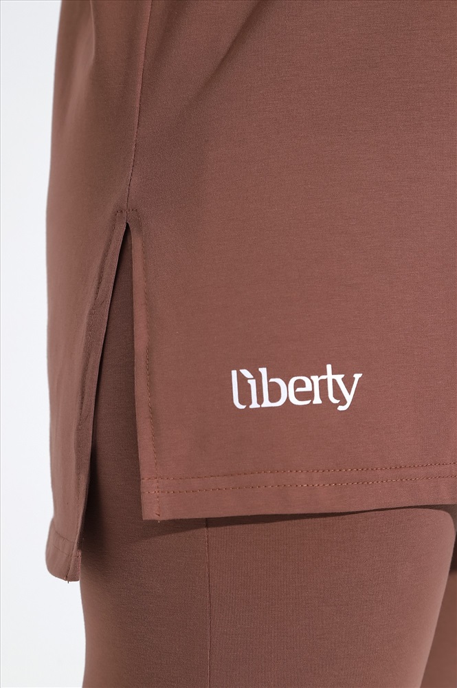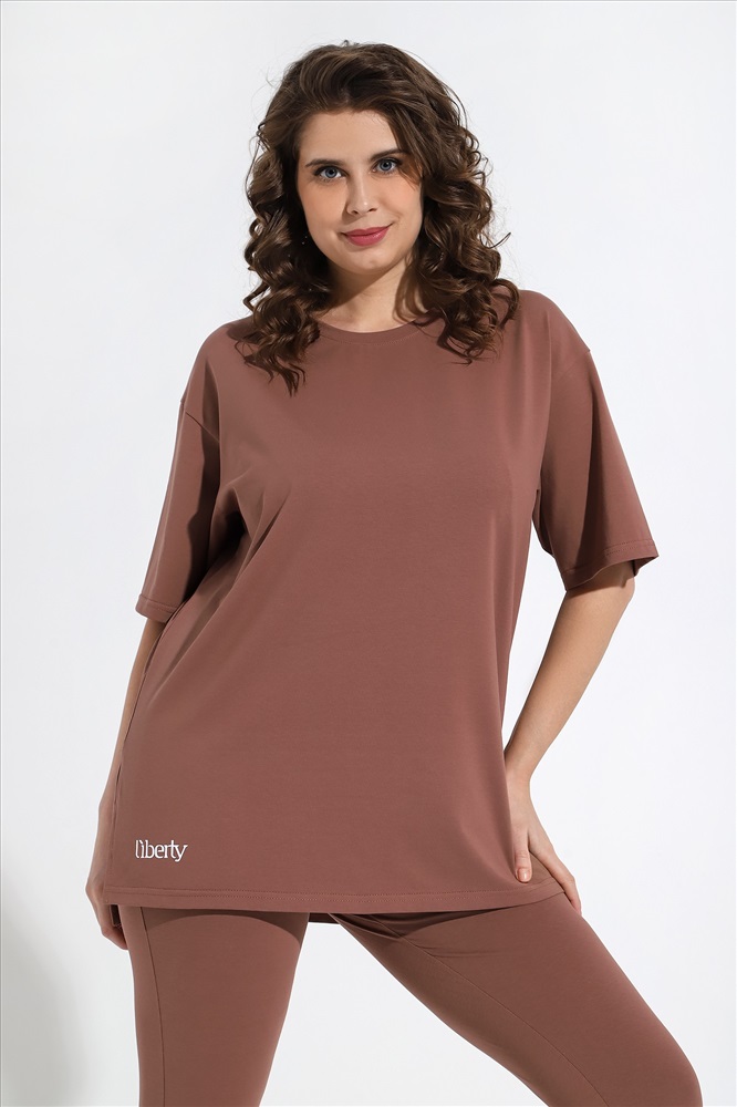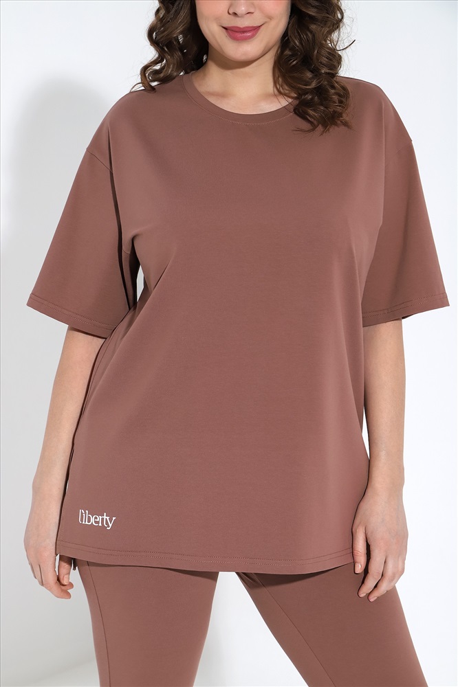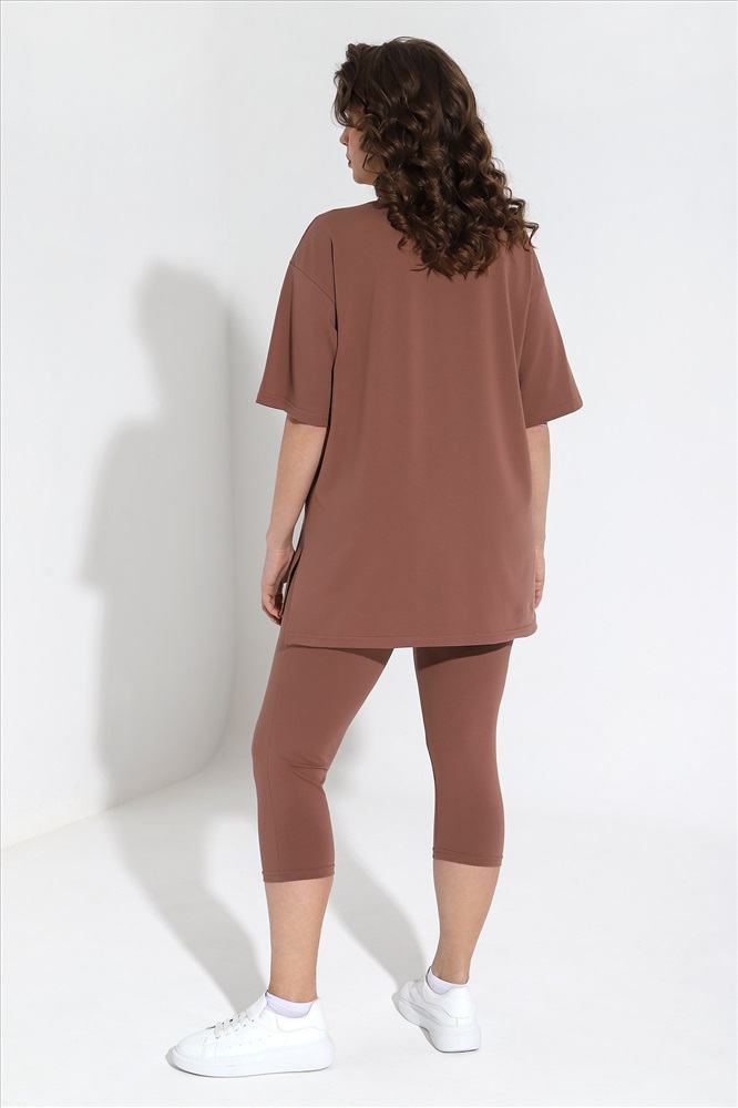 Костюм женский из трикотажного гладкокрашенного полотна «кулирка с лайкрой», состоящий из футболки и бридж. Футболка свободного покроя, со спущенным плечом и втачными рукавами длиной до локтя, горловиной овальной формы, обработанной втачной планкой и принтом на полочке, выполненным в технике «шелкографии». В нижней части боковых швов – разрезы.Бриджи – классического покроя, на резинке.