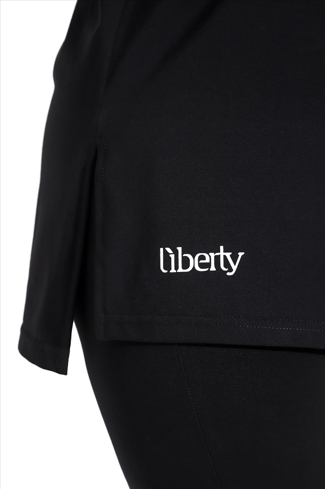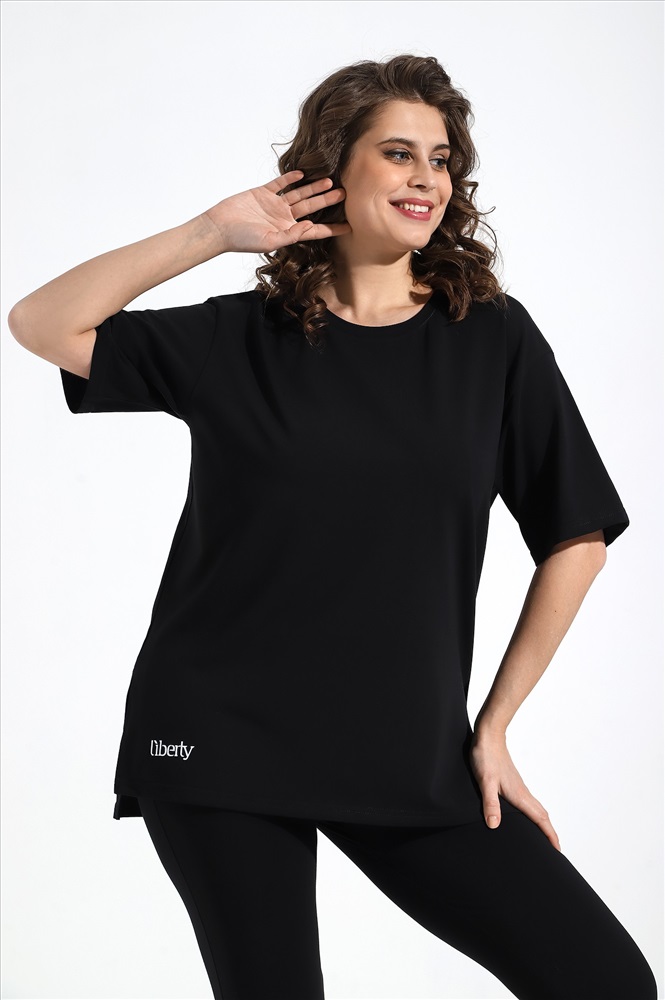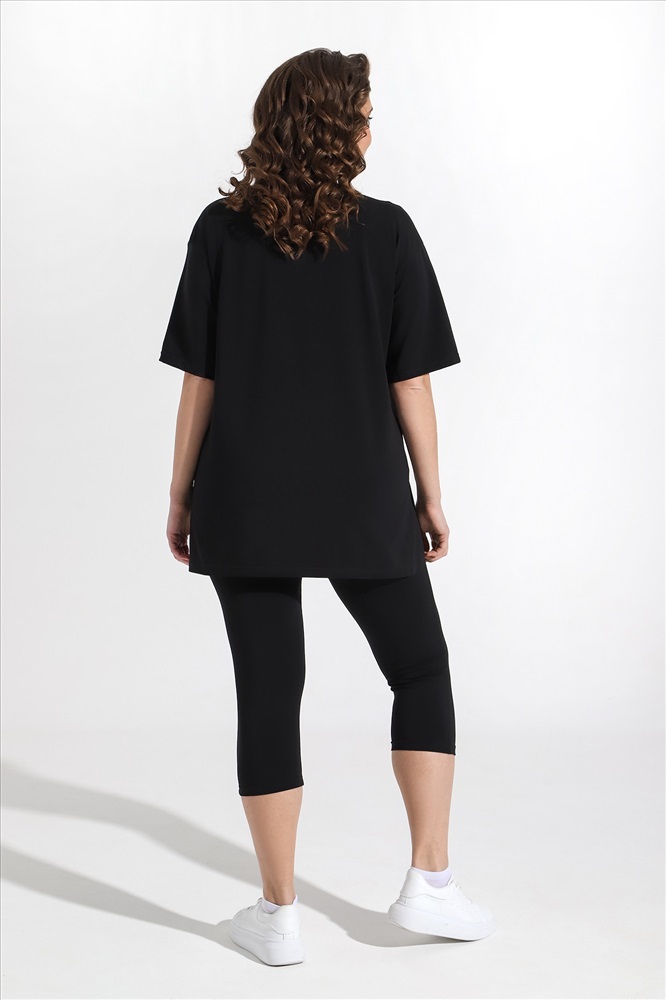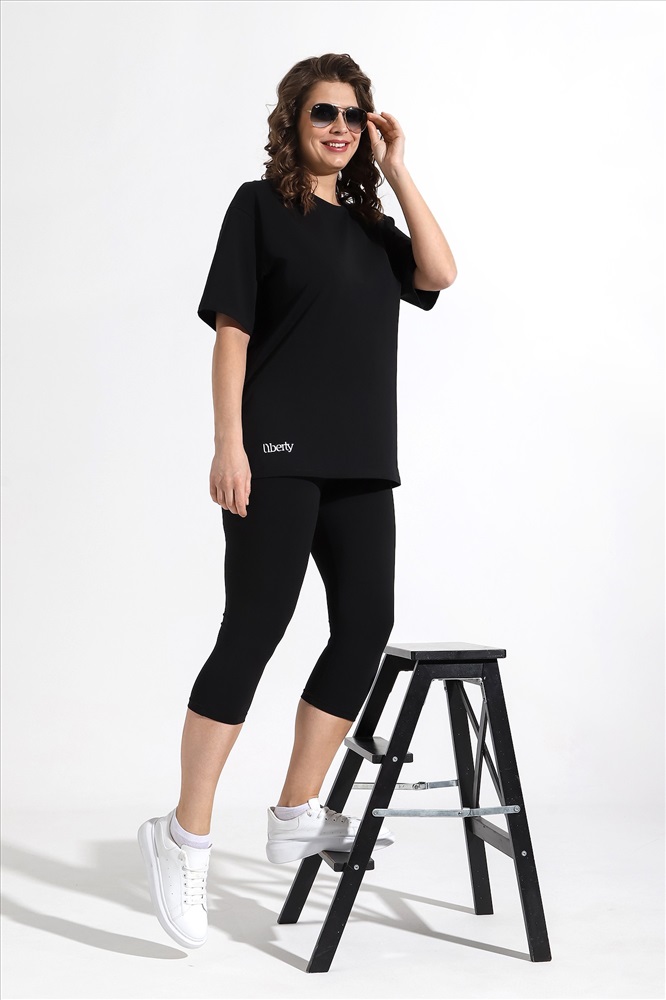 Ткань: Кулирка с лайкрой Костюм женский из трикотажного гладкокрашенного полотна «кулирка с лайкрой», состоящий из футболки и бридж. Футболка свободного покроя, со спущенным плечом и втачными рукавами длиной до локтя, горловиной овальной формы, обработанной втачной планкой и принтом на полочке, выполненным в технике «шелкографии». В нижней части боковых швов – разрезы.Бриджи – классического покроя, на резинке.