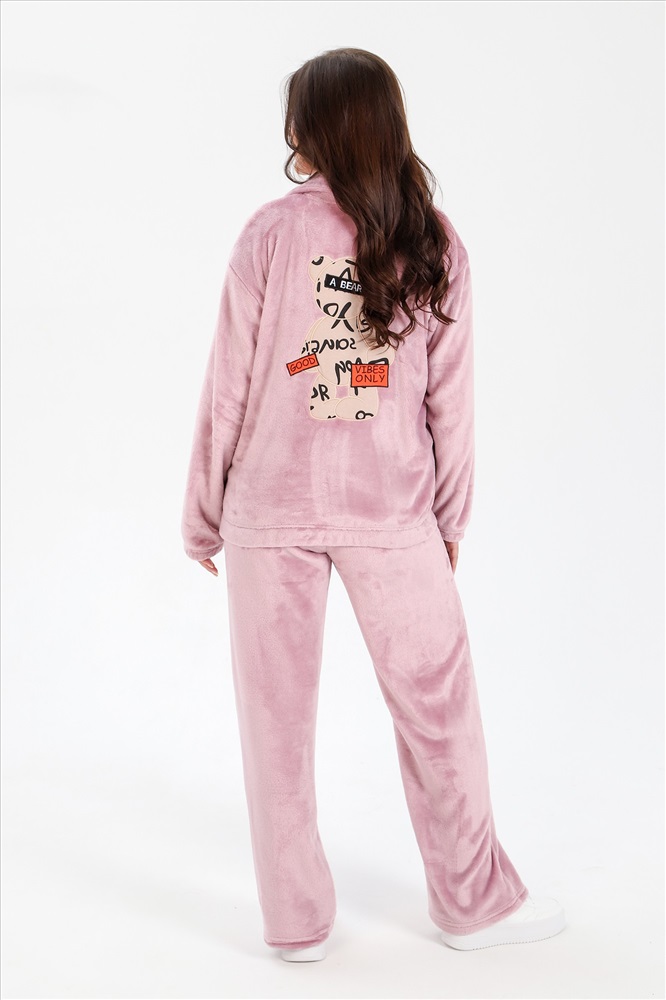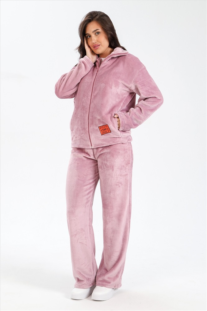 Брюки – из трикотажного полотна «велсофт», длинные, слегка расширенные книзу, с эластичной тесьмой по талии.