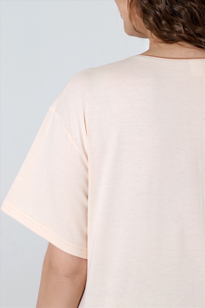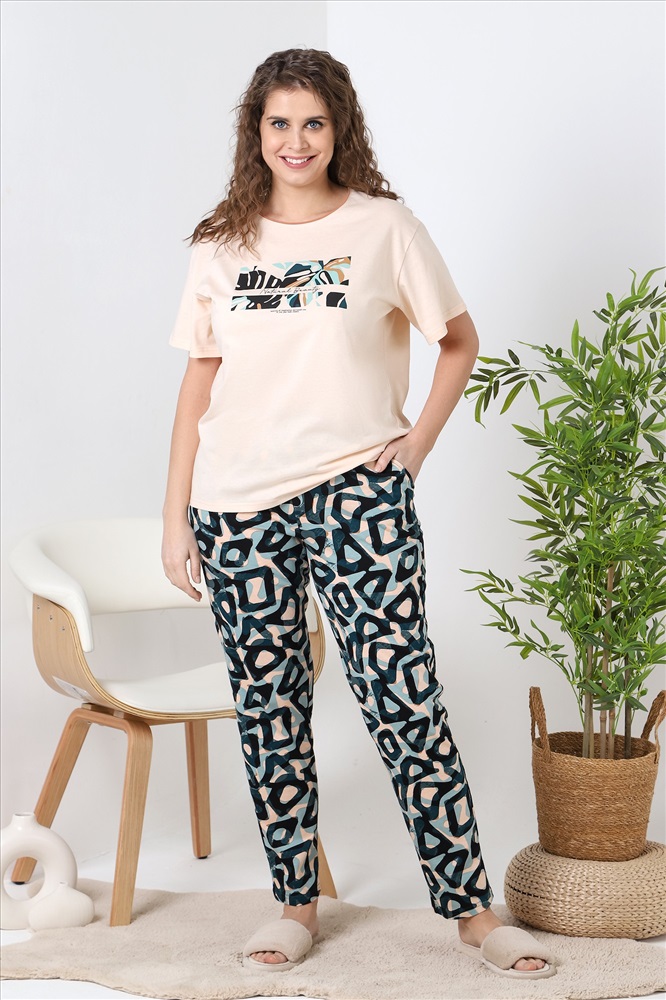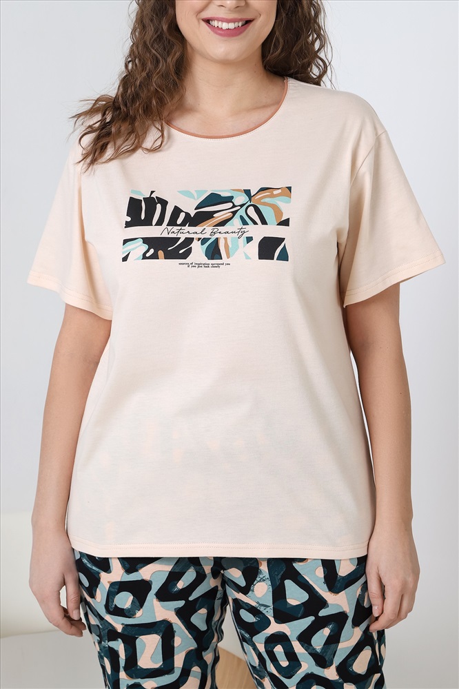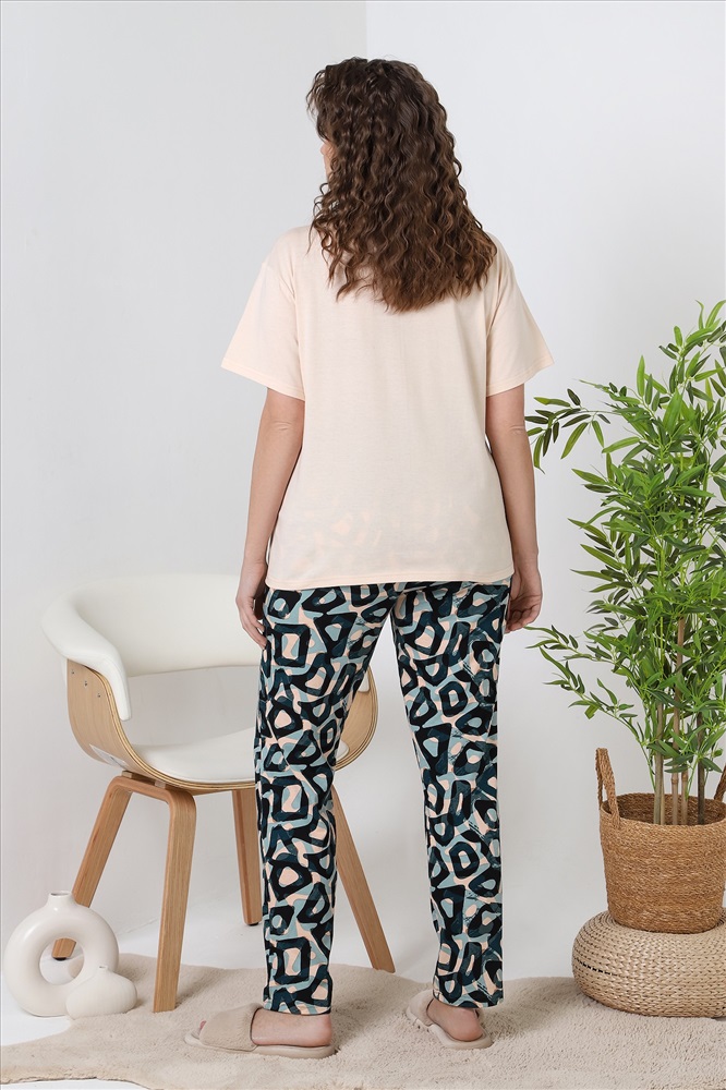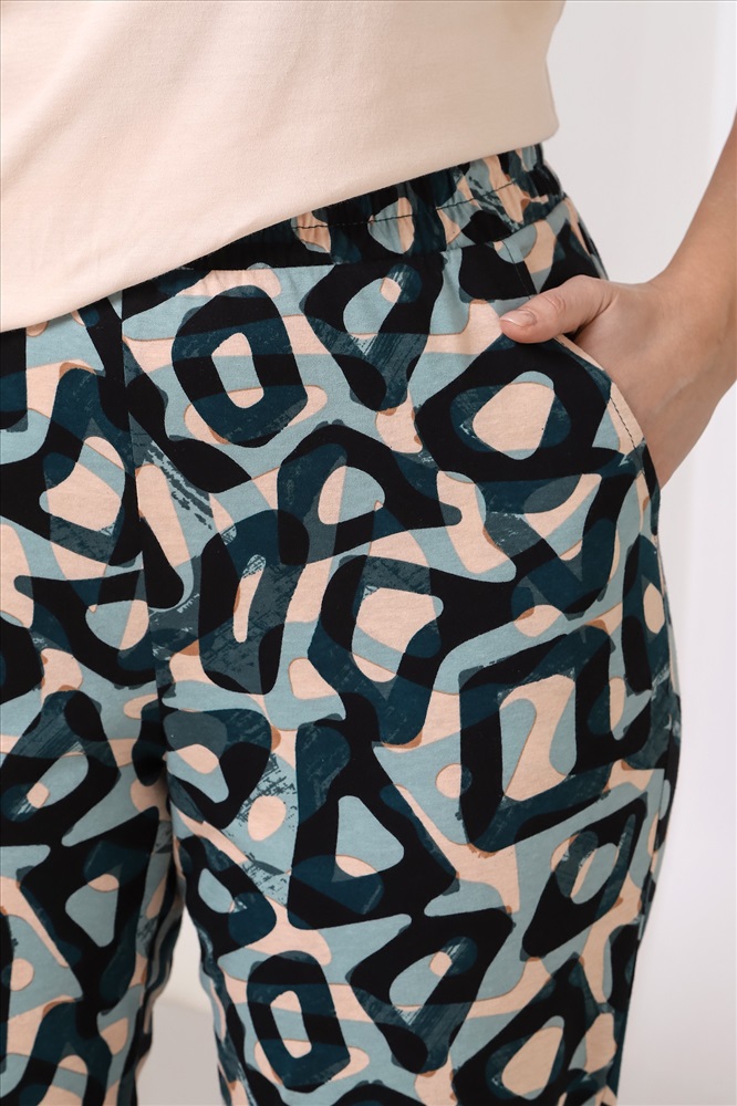Ткань: Кулирка Кулирка - это самое гладкое и тонкое трикотажное полотно из чистого хлопка. С лицевой стороны ткань «кулирка» выглядит как «вертикальные косички», орнамент изнаночной стороны напоминает «кирпичную кладку». Свойства кулирного трикотажа- воздухопроницаемость, гигроскопичность, не теряя своей формы, практически не тянется в длину и хорошо растягивается в ширину, не образует складки. Костюм женский из трикотажного полотна «кулирка» в комбинации двух видов: гладкокрашеного и с набивным рисунком в единой цветовой гамме, состоящий из футболки и брюк. Футболка – из гладкокрашеного полотна, с короткими втачными рукавами, горловиной овальной формы, обработанной притачной бейкой из основного материала и принтом на полочке, выполненным методом «шелкографии».Брюки – из полотна с набивным рисунком, длинные, на притачном поясе с эластичной тесьмой внутри и карманами в боковых швах.