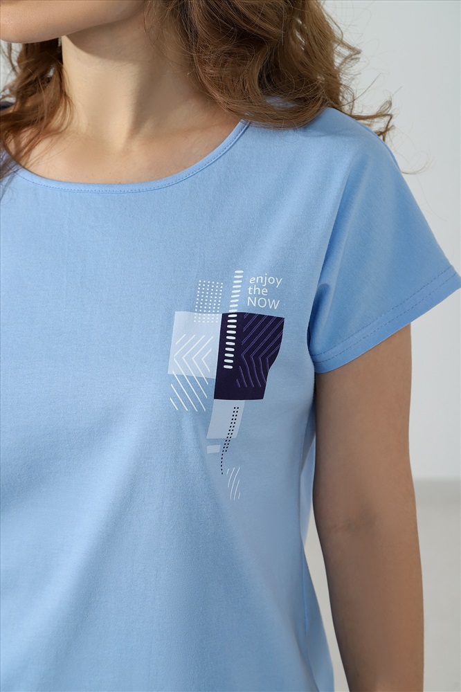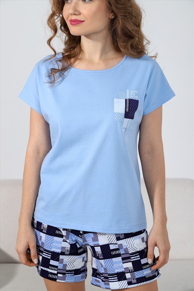 Костюм из трикотажного полотна «кулирка» в комбинации двух видов в единой цветовой гамме: гладкокрашеного и с набивным рисунком, состоящий из футболки и шорт. Футболка – из гладкокрашеного полотна, с короткими цельнокроеными рукавами, горловиной овальной формы, окантованной основным материалом и принтом на полочке. Шорты - из полотна с набивным рисунком, короткие, на широком притачном поясе с эластичной тесьмой внутри, с двумя карманами в боковых швах и отворотами по низу.