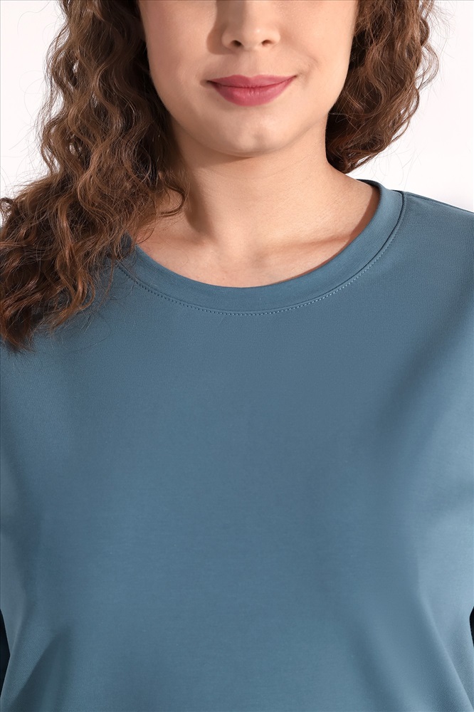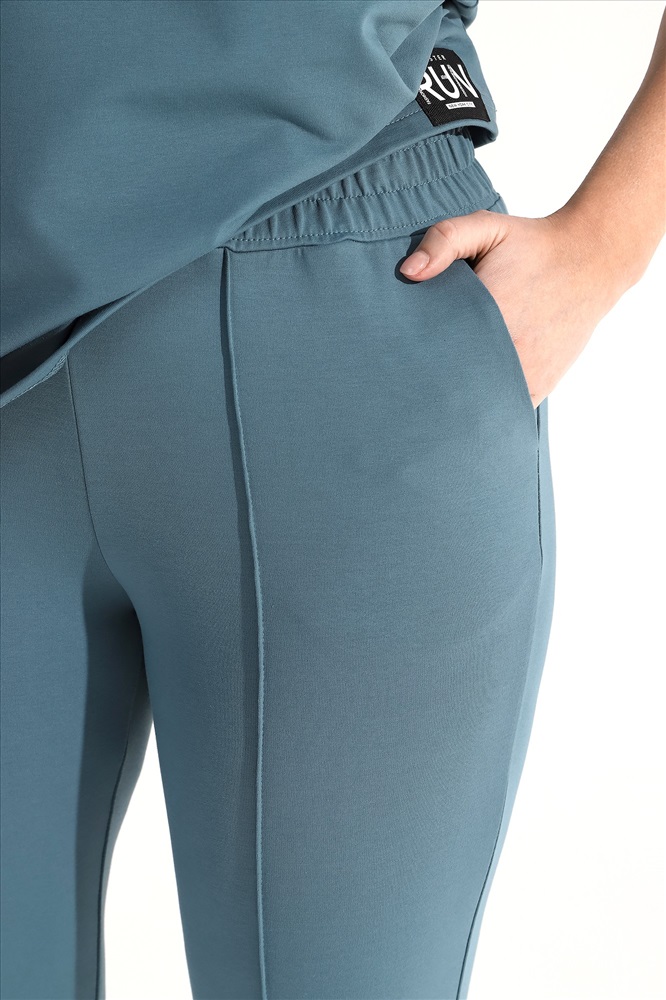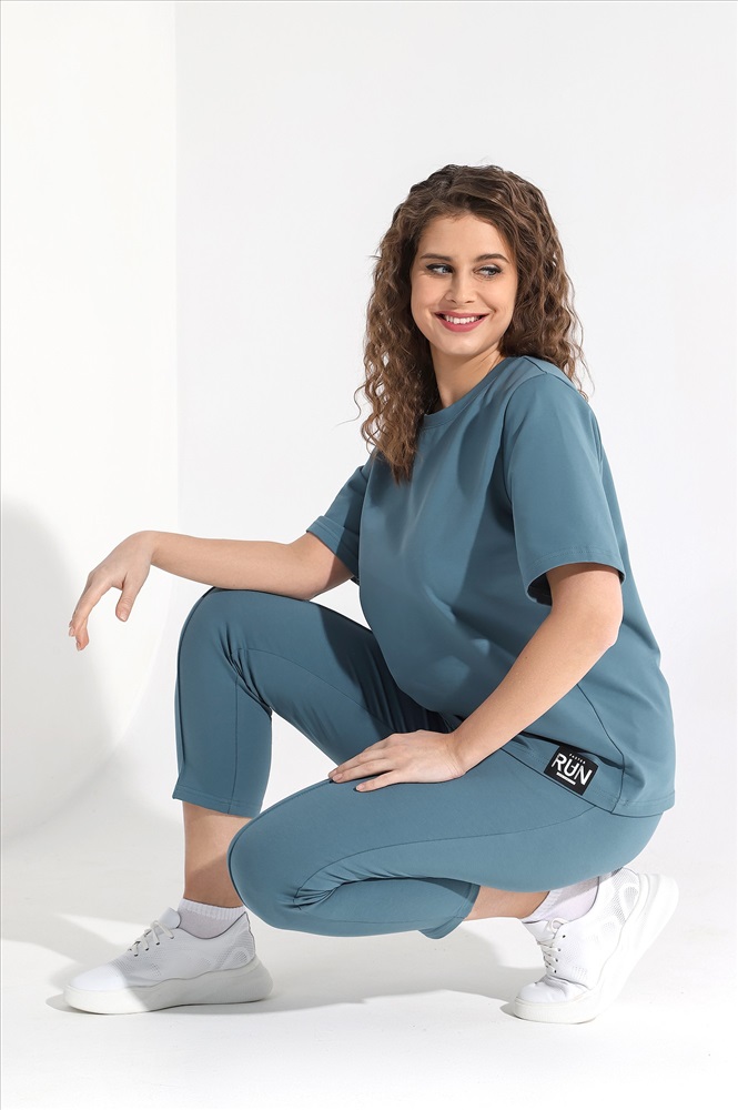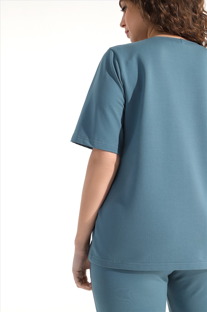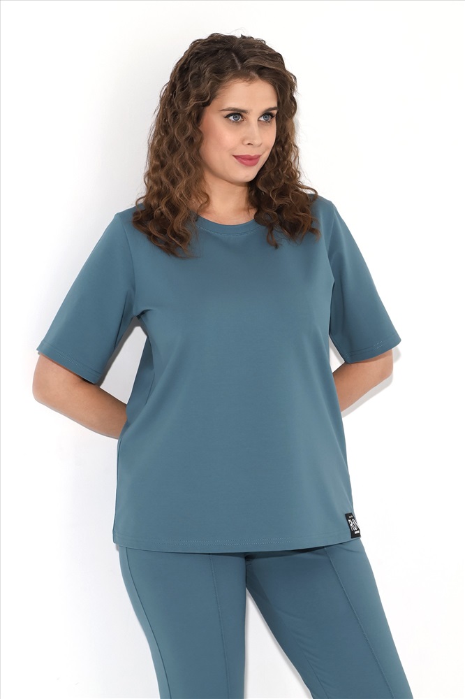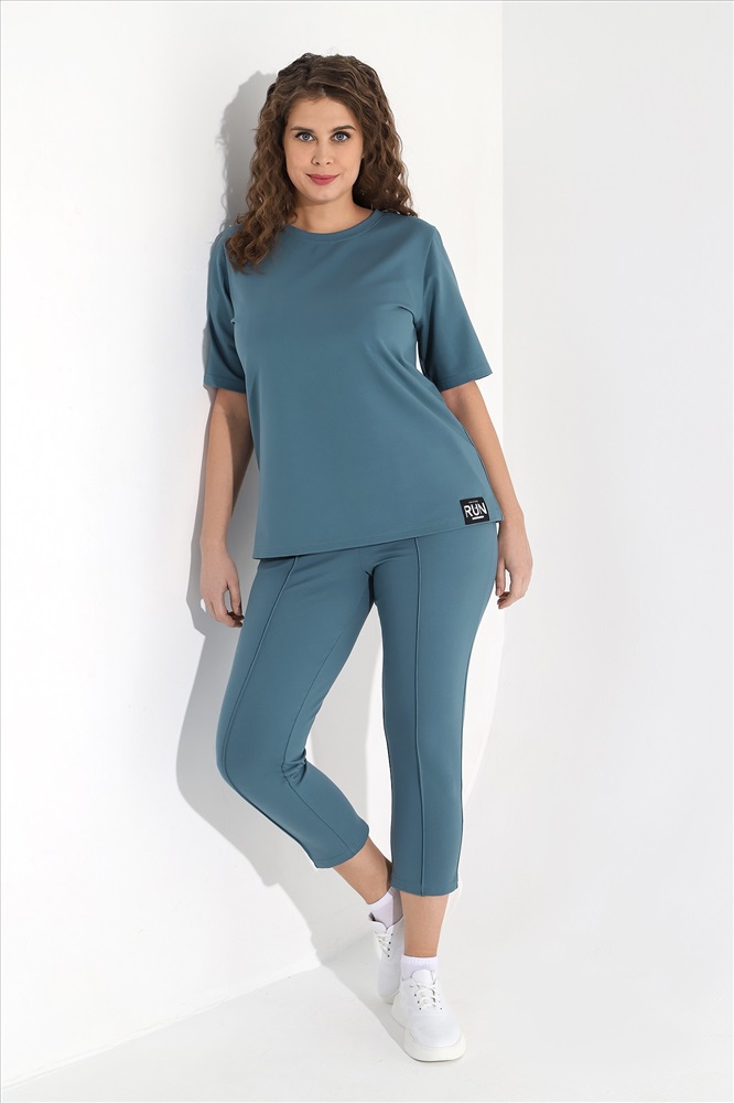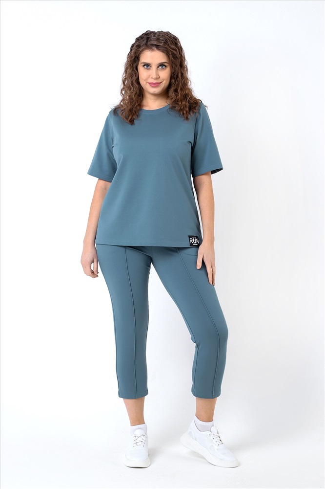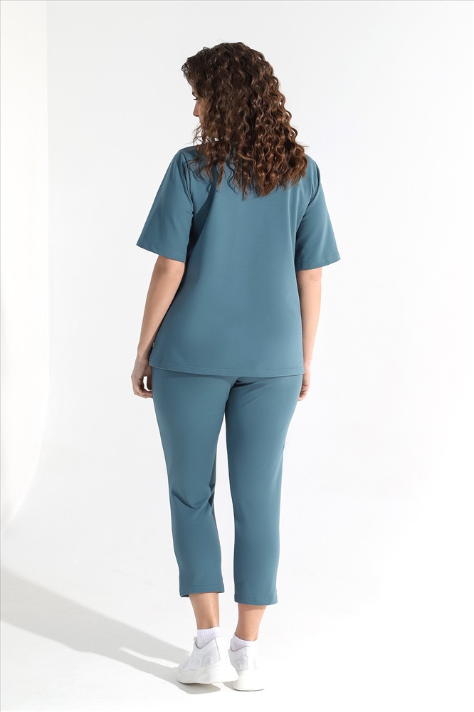 Костюм женский из гладкокрашеного трикотажного полотна футер-двунитка, состоящий из футболки и брюк. Футболка – классического покроя, с короткими втачными рукавами и горловиной овальной формы, обработанной втачной планкой. В нижней части полочки слева настрочен декоративный элемент прямоугольной формы.Брюки – длиной 7/8, слегка зауженные книзу, на притачном поясе с эластичной тесьмой внутри и карманами в боковых швах. Передние половины брюк застрочены по линиям центра вдоль на 0,3 см.