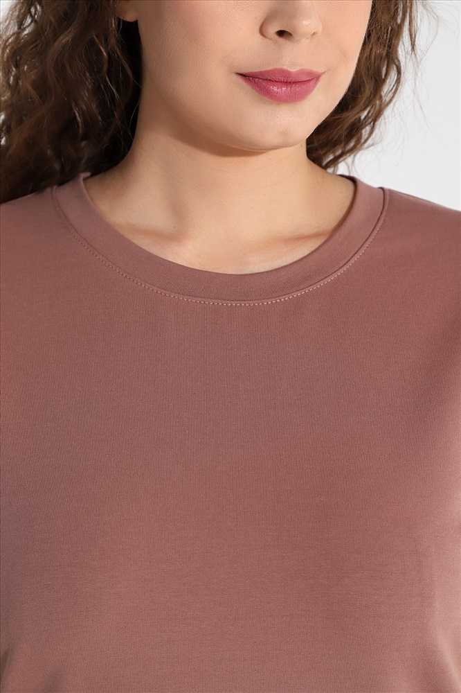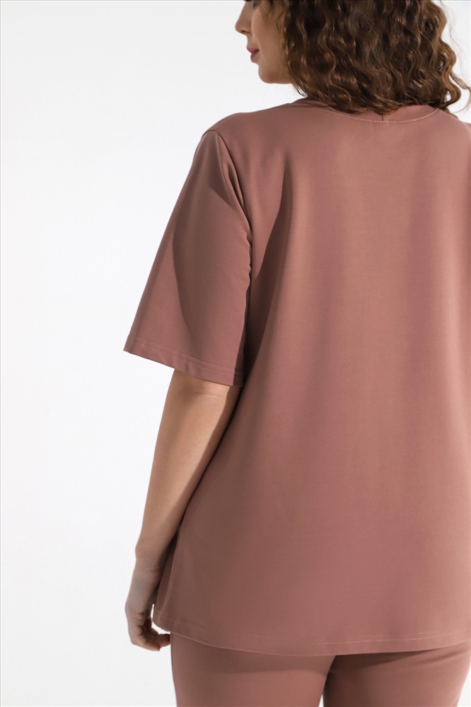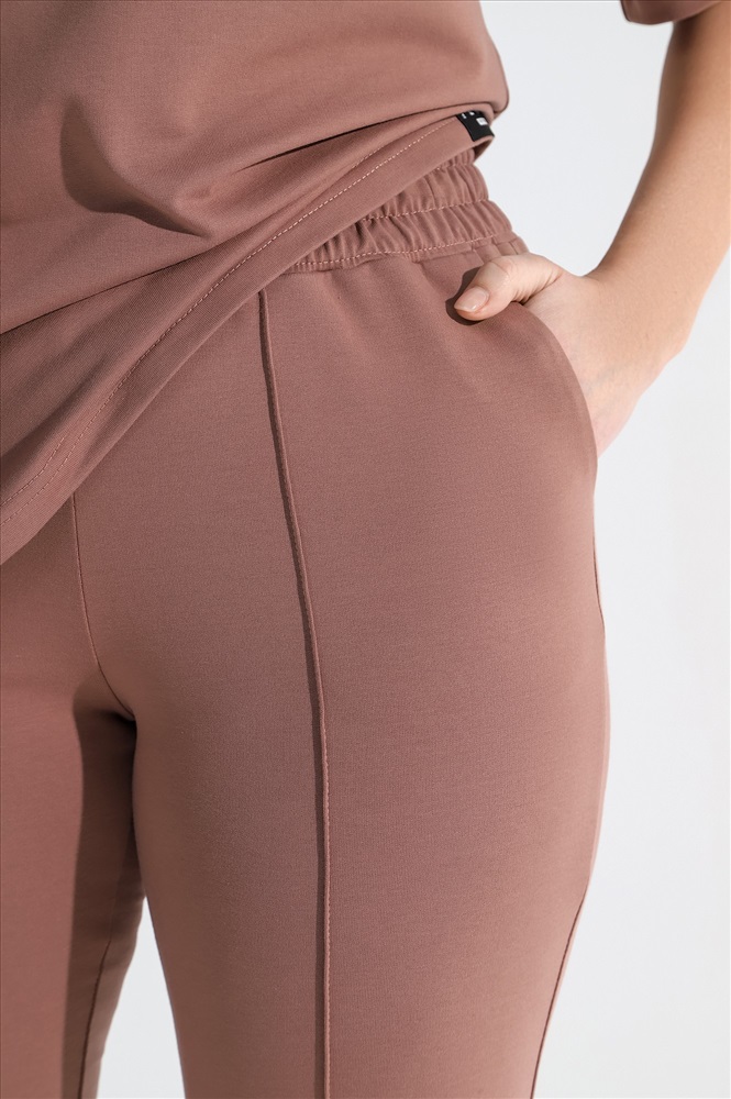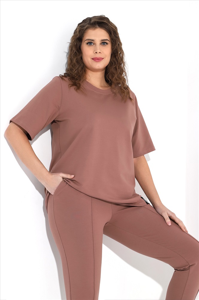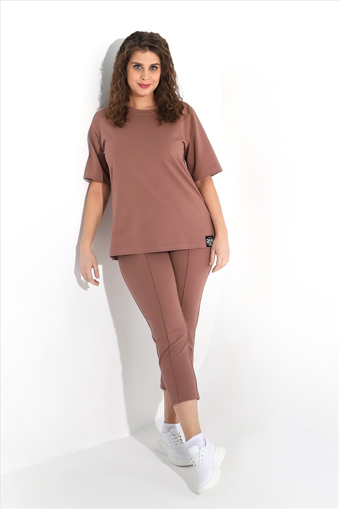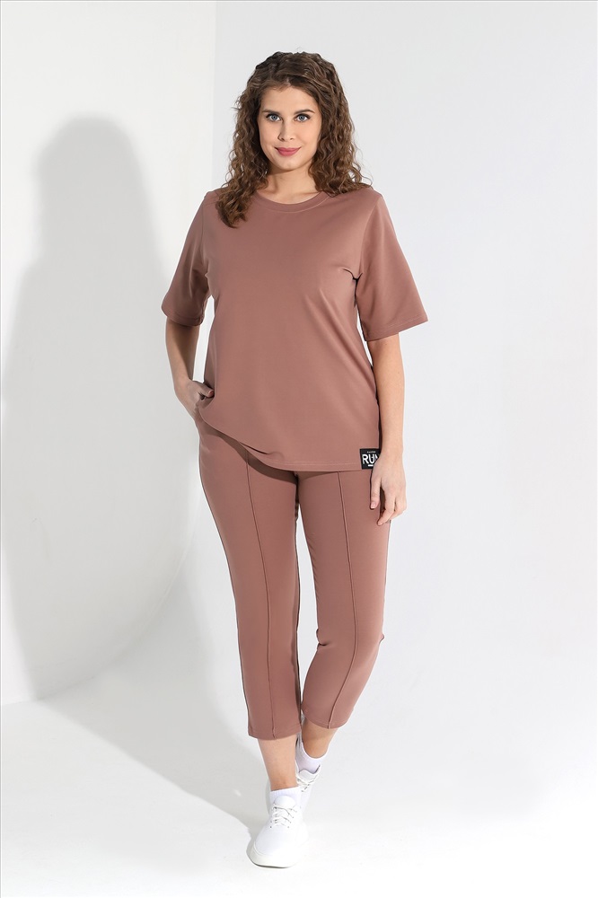 Костюм женский из гладкокрашеного трикотажного полотна футер-двунитка, состоящий из футболки и брюк. Футболка – классического покроя, с короткими втачными рукавами и горловиной овальной формы, обработанной втачной планкой. В нижней части полочки слева настрочен декоративный элемент прямоугольной формы.Брюки – длиной 7/8, слегка зауженные книзу, на притачном поясе с эластичной тесьмой внутри и карманами в боковых швах. Передние половины брюк застрочены по линиям центра вдоль на 0,3 см.