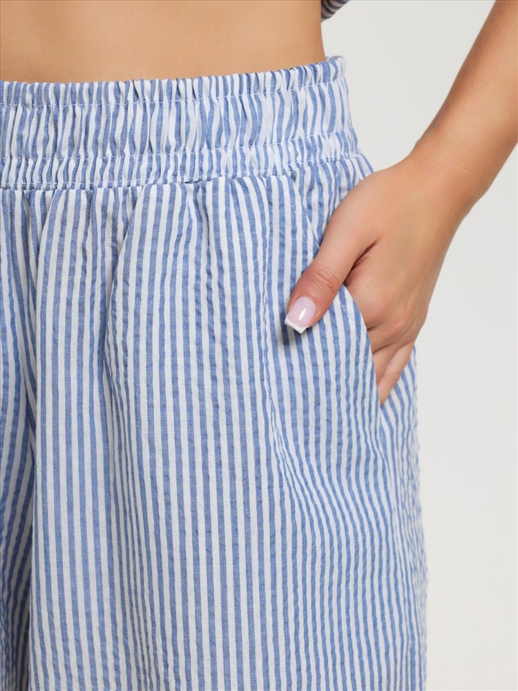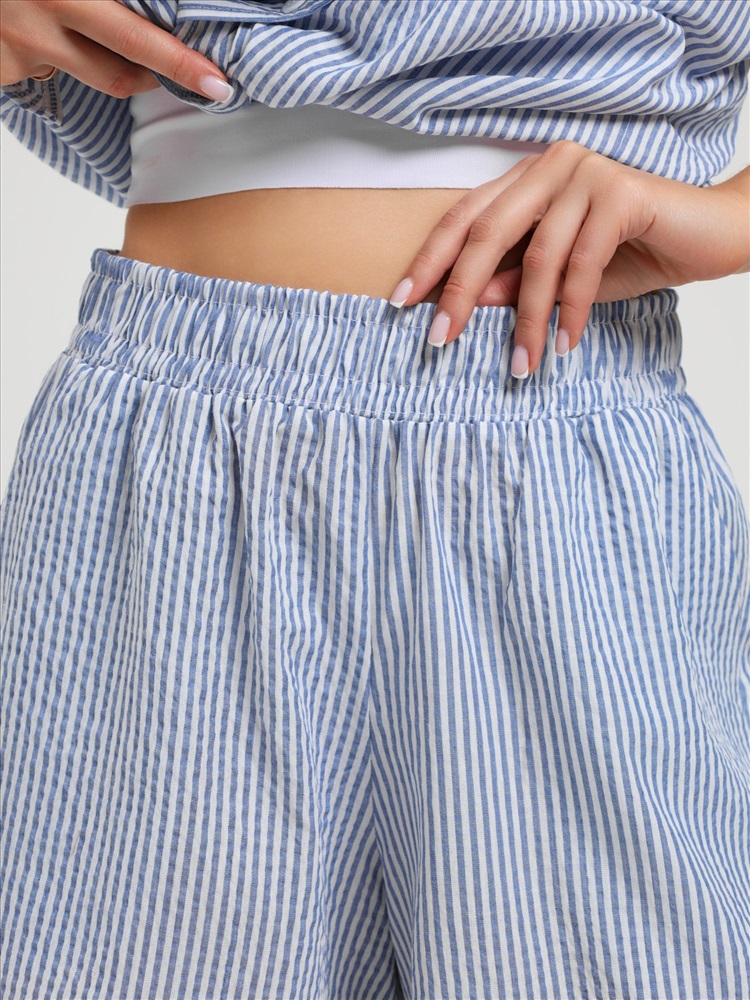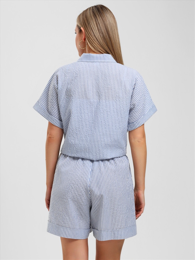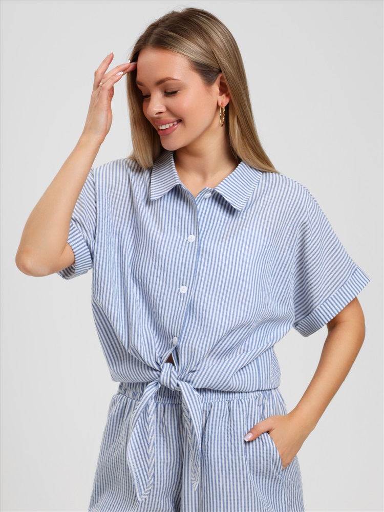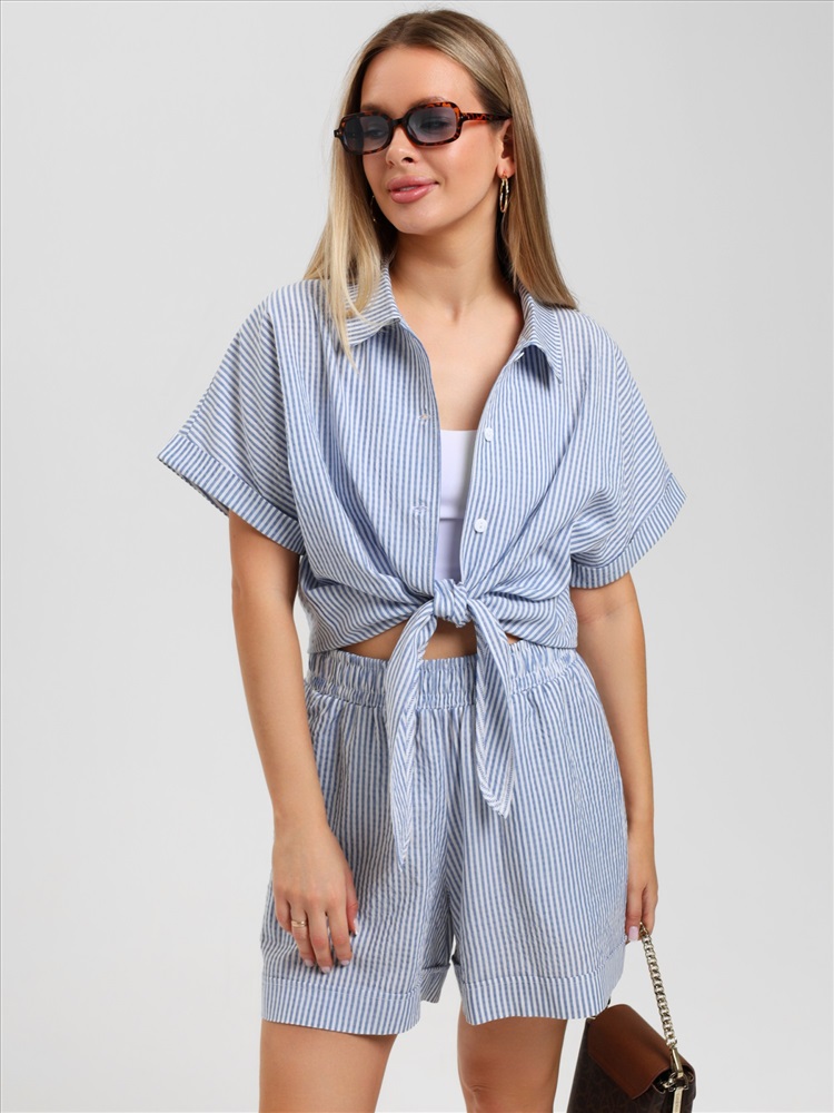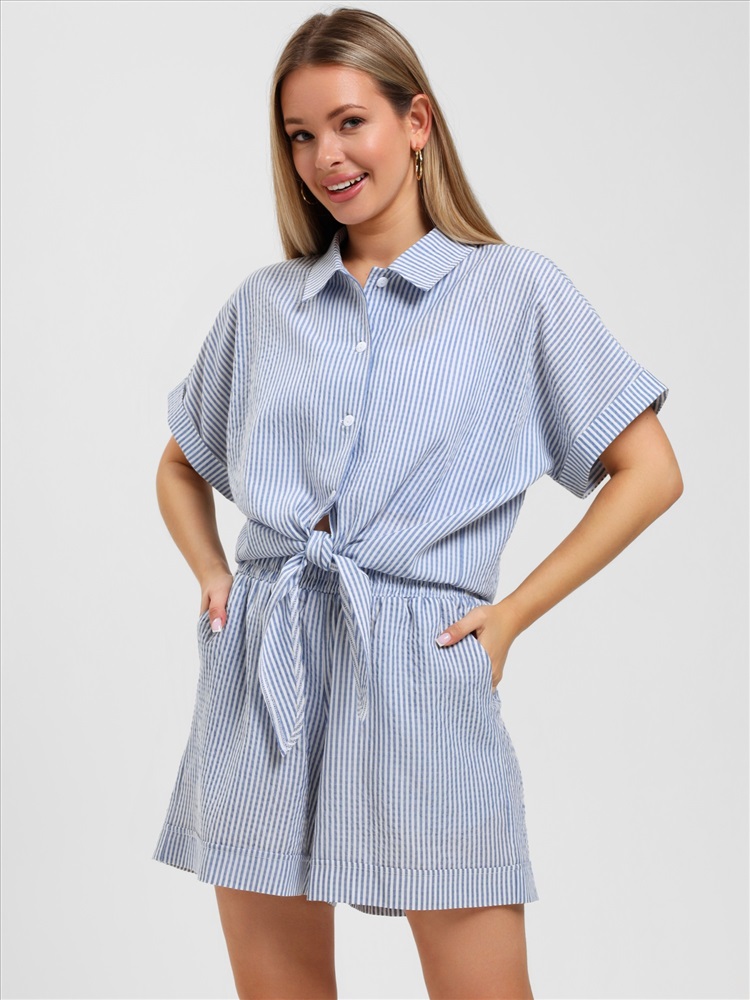 Костюм молодежный из тканого полотна в полоску, состоящий из блузы - рубашки и шорт. Блуза – укороченного силуэта, свободного покроя, с короткими цельнокроеными рукавами, обработанными манжетами, акцентными декоративными завязками спереди, отложным воротником и центральной бортовой застежкой на петли и пуговицы.Шорты - свободные, средней длины, с карманами в боковых швах, на притачном поясе с эластичной тесьмой внутри, с двойной подгибкой низа имитирующей манжет.