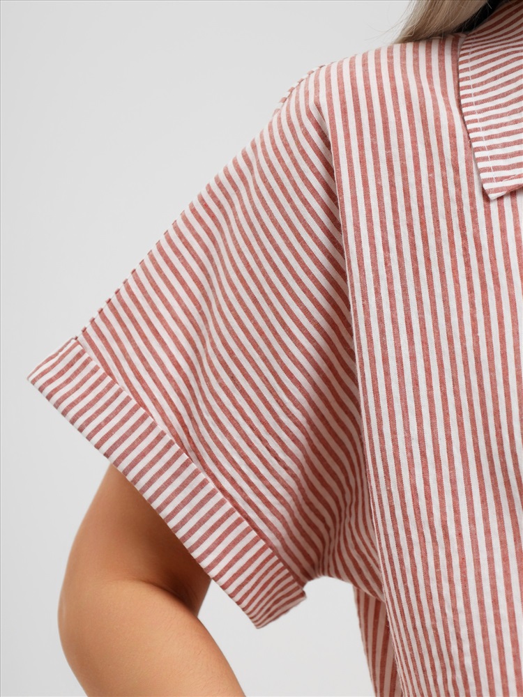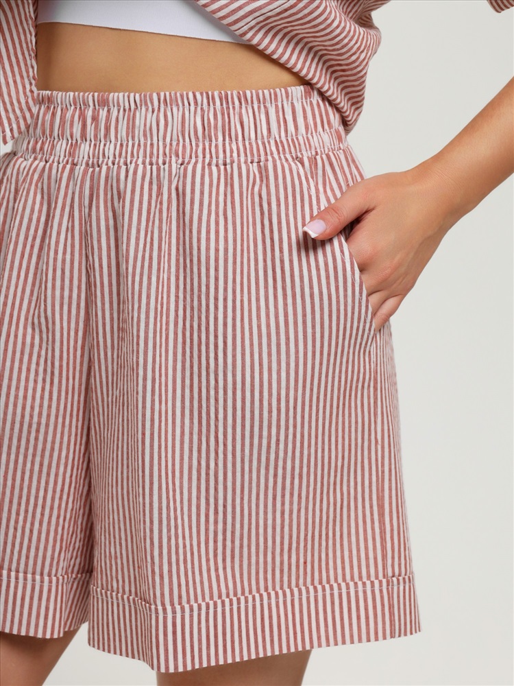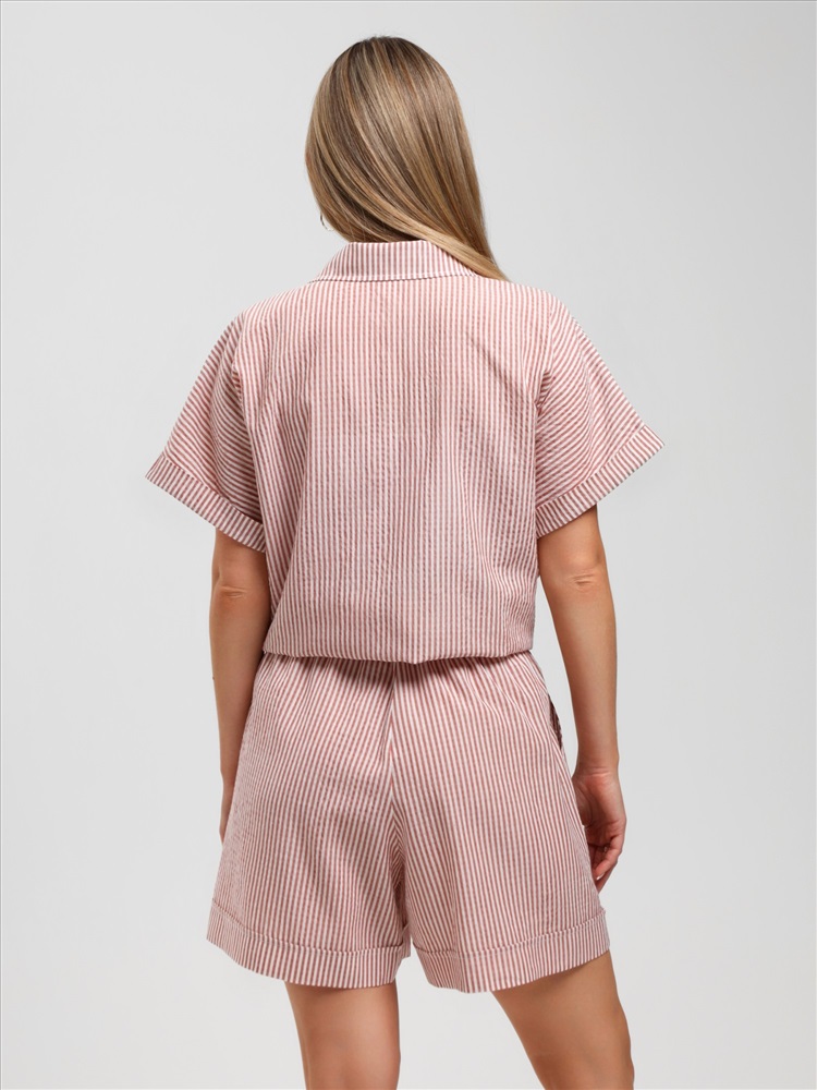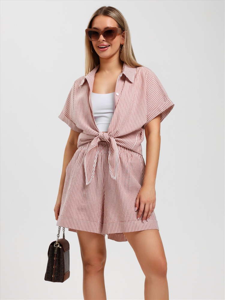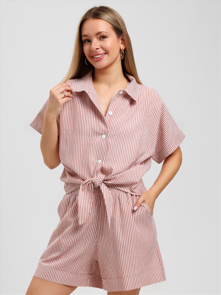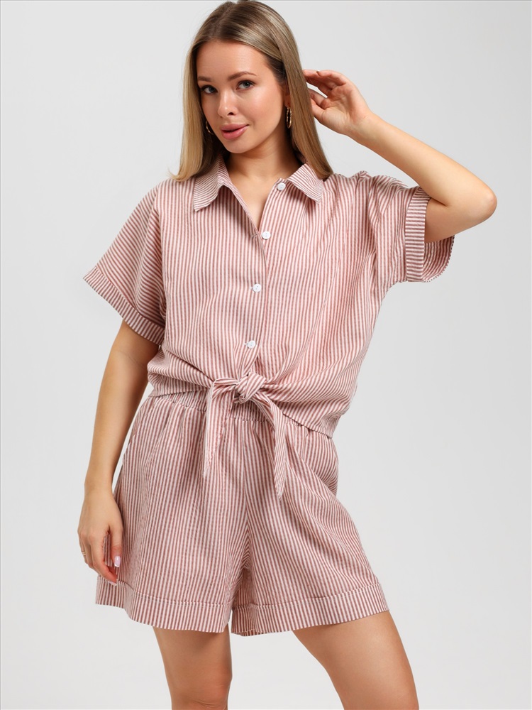 Костюм молодежный из тканого полотна в полоску, состоящий из блузы - рубашки и шорт. Блуза – укороченного силуэта, свободного покроя, с короткими цельнокроеными рукавами, обработанными манжетами, акцентными декоративными завязками спереди, отложным воротником и центральной бортовой застежкой на петли и пуговицы.Шорты - свободные, средней длины, с карманами в боковых швах, на притачном поясе с эластичной тесьмой внутри, с двойной подгибкой низа имитирующей манжет.
