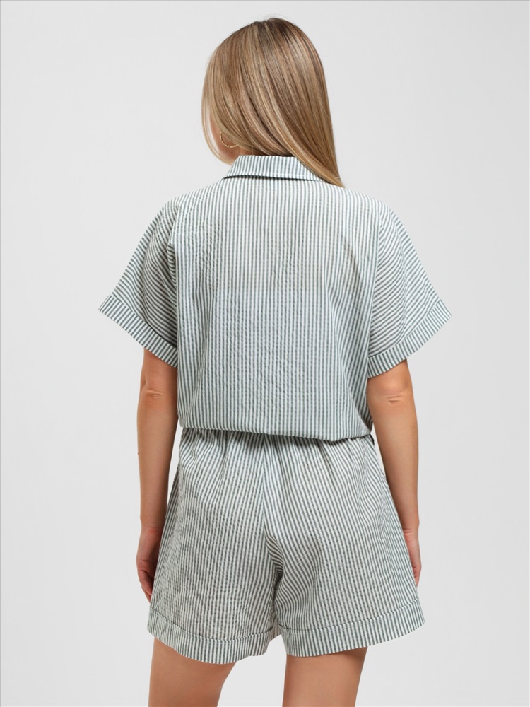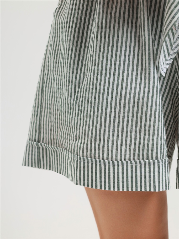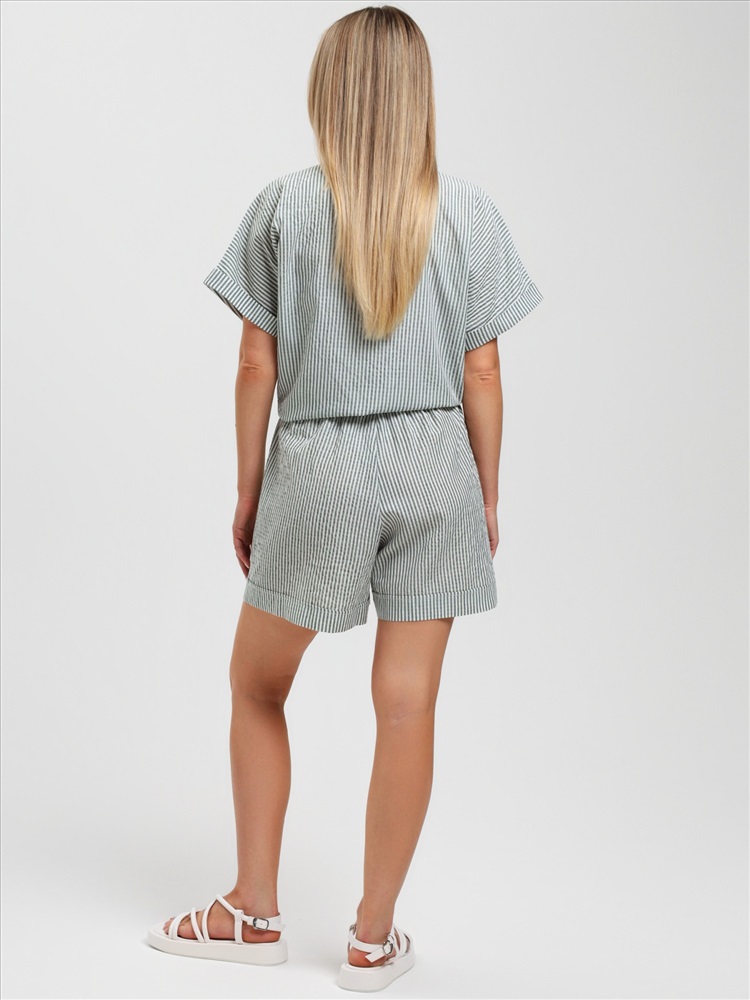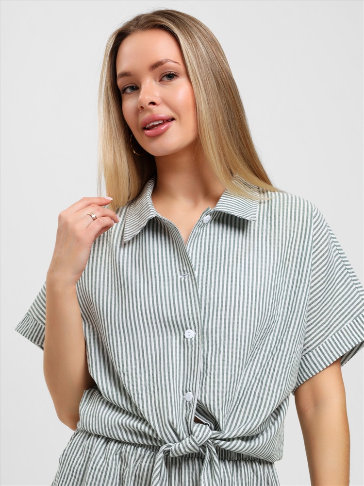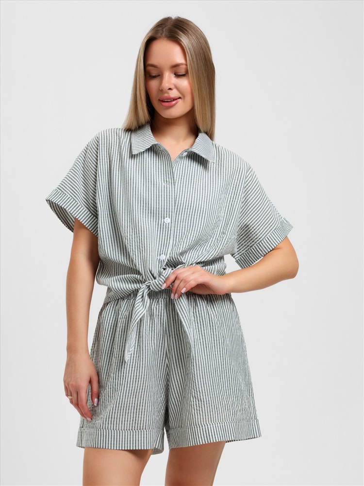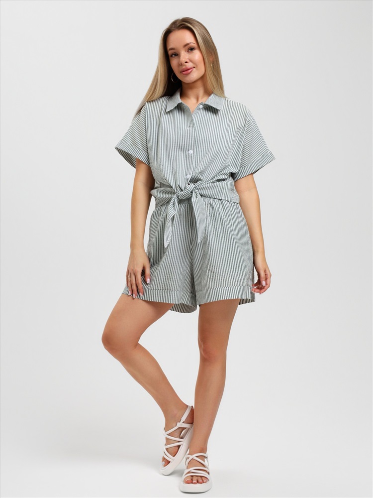 Костюм молодежный из тканого полотна в полоску, состоящий из блузы - рубашки и шорт. Блуза – укороченного силуэта, свободного покроя, с короткими цельнокроеными рукавами, обработанными манжетами, акцентными декоративными завязками спереди, отложным воротником и центральной бортовой застежкой на петли и пуговицы.Шорты - свободные, средней длины, с карманами в боковых швах, на притачном поясе с эластичной тесьмой внутри, с двойной подгибкой низа имитирующей манжет.