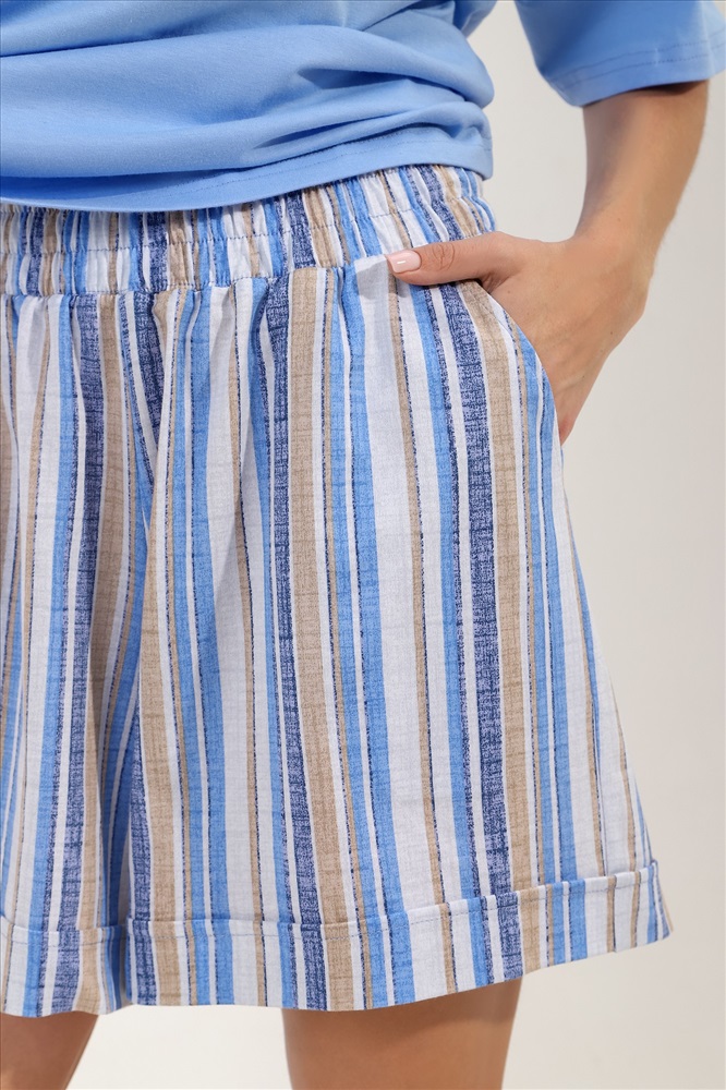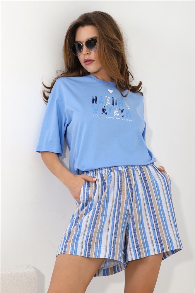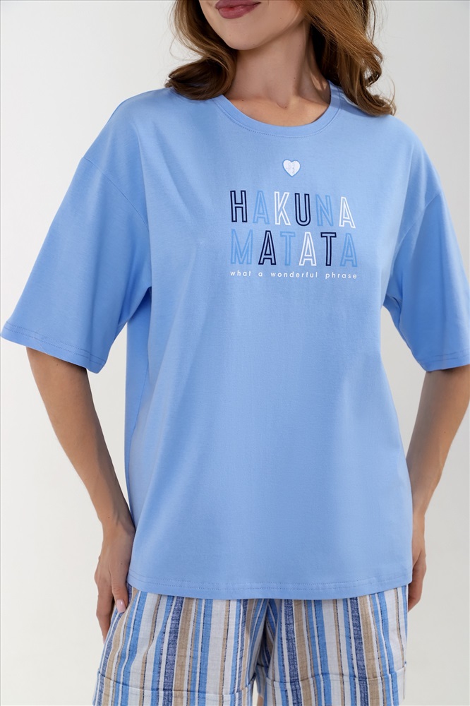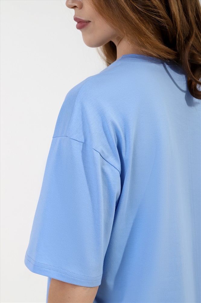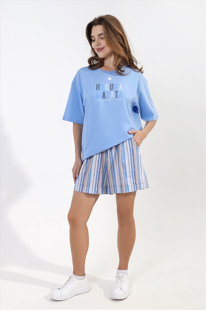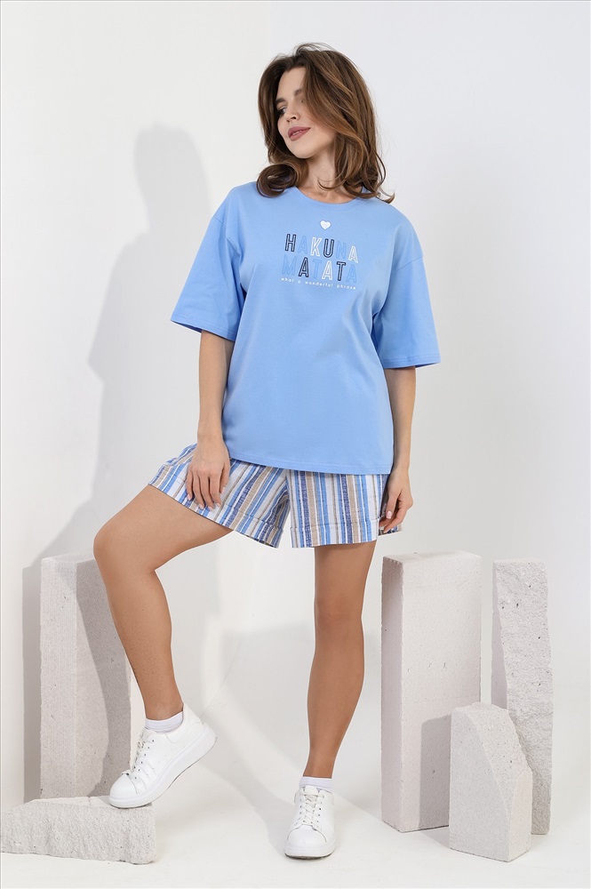 Костюм молодежный из трикотажного полотна «кулирка» » в комбинации двух видов: с набивным рисунком и гладкокрашеного в единой цветовой гамме, состоящий из футболки и шорт. Футболка – из гладкокрашеного полотна, классического покроя, с короткими втачными рукавами, горловиной овальной формы, обработанной притачной бейкой из основного материала, с принтом на полочке, выполненным в технике «шелкографии».Шорты – из полотна с набивным рисунком, свободные, средней длины, с карманами в боковых швах, на притачном поясе с эластичной тесьмой внутри, с двойной подгибкой низа имитирующей манжет.