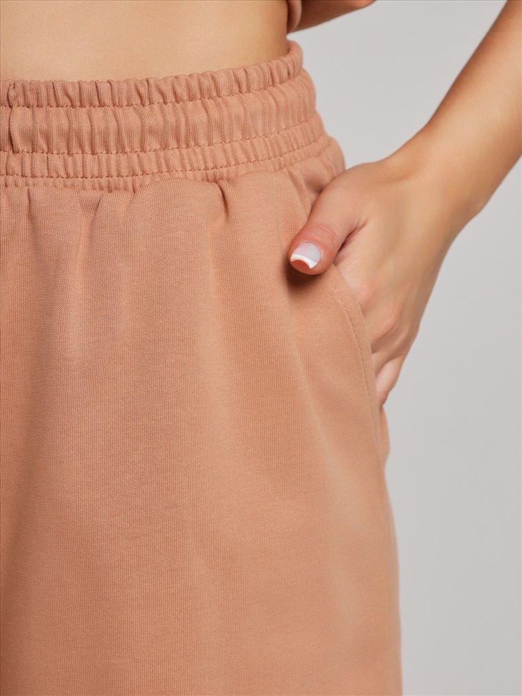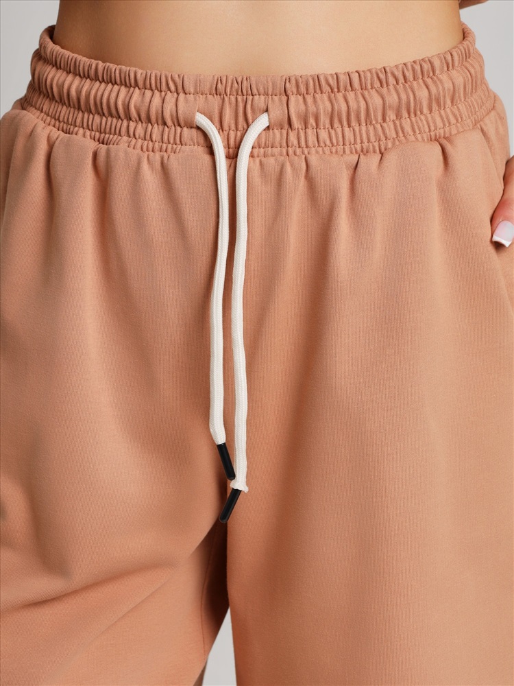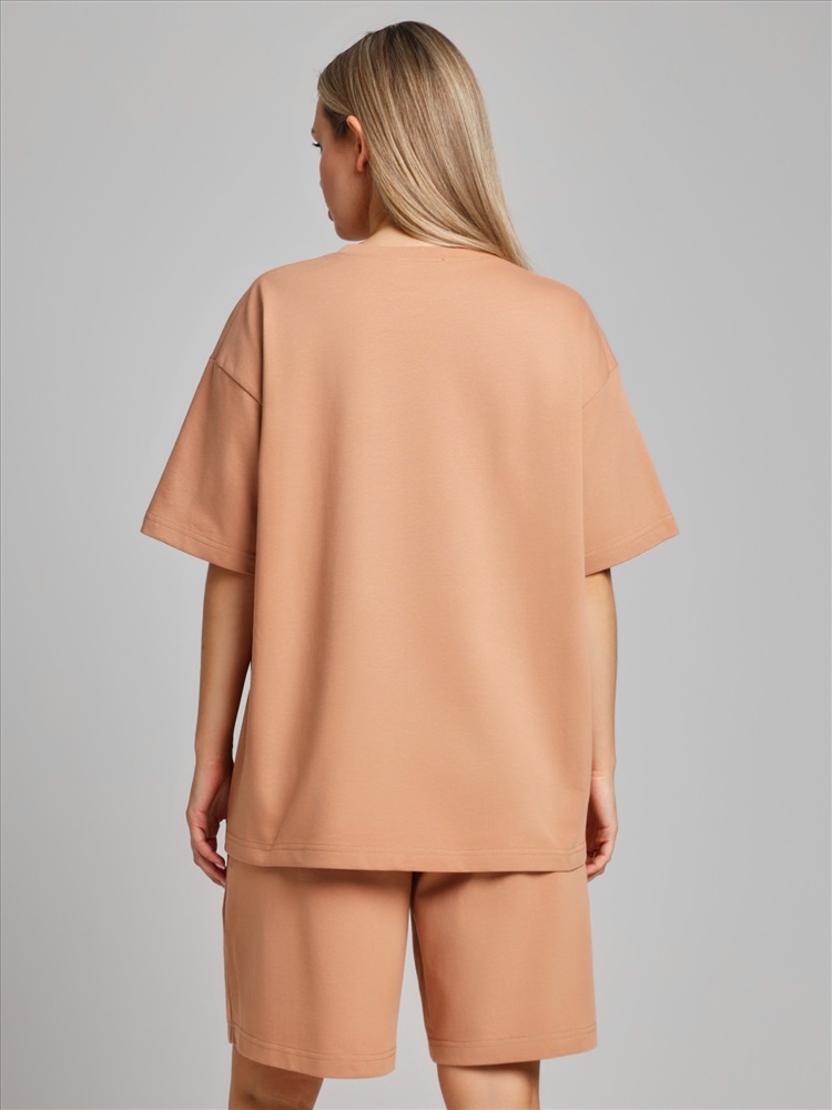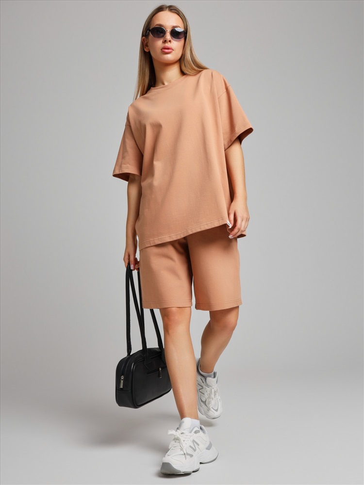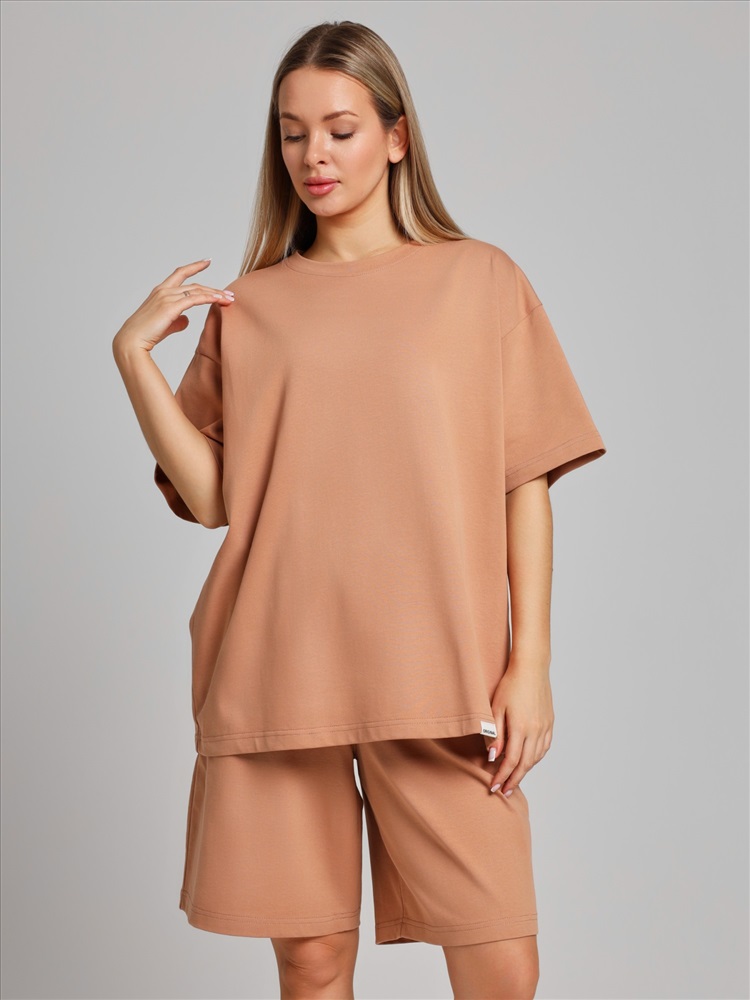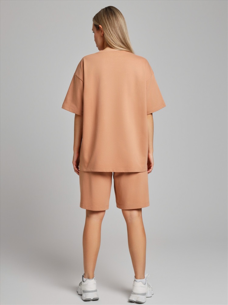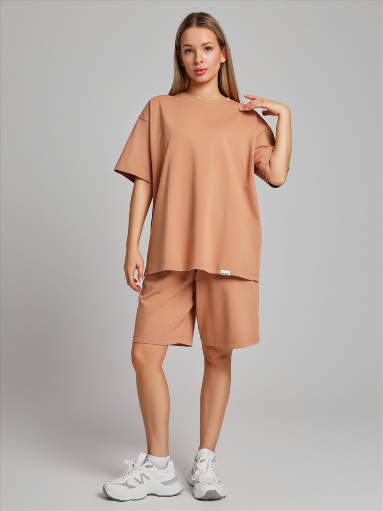Костюм женский из плотного гладкокрашеного трикотажного полотна "кулирка", состоящий из футболки и шорт. Футболка - свободного покроя, с удлиненными плечевым и швами, короткими втачными рукавами и горловиной овальной формы, обработанной втачной планкой. В нижней части переда слева настрочен декоративный элемент прямоугольной формы. По горловине проложена отделочная строчка. Шорты - классического покроя, на притачном поясе с эластичной тесьмой внутри и карманами в боковых швах. Для регулирования степени прилегания шорт по талии в пояс вставлен шнурок, продетый через два отверстия в соединительных швах в центре пояса.