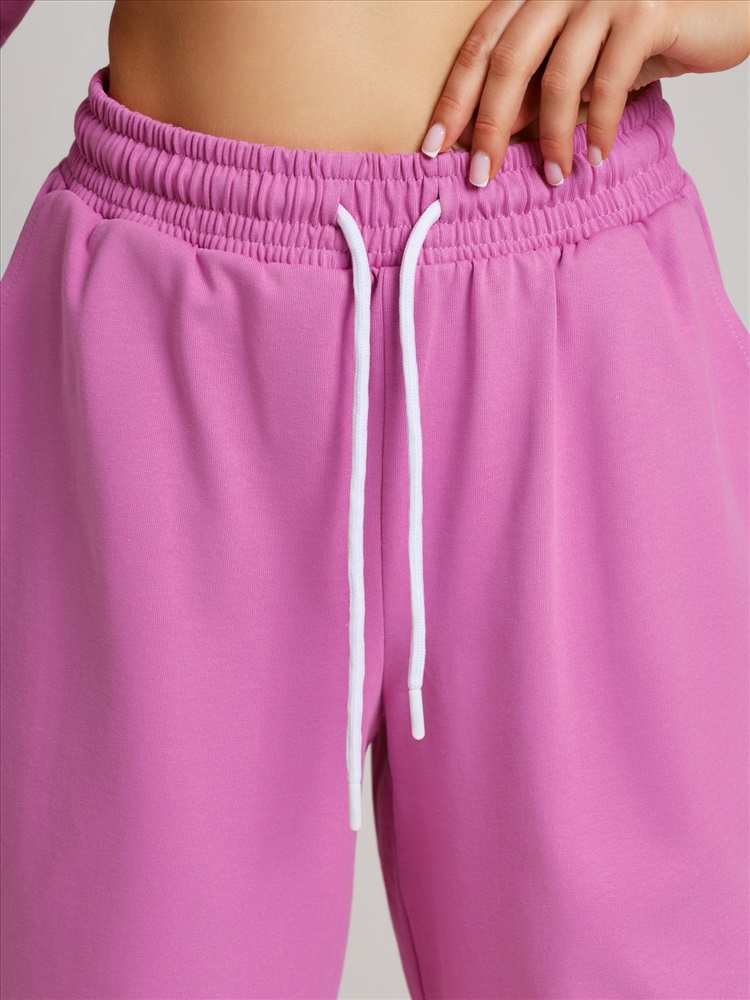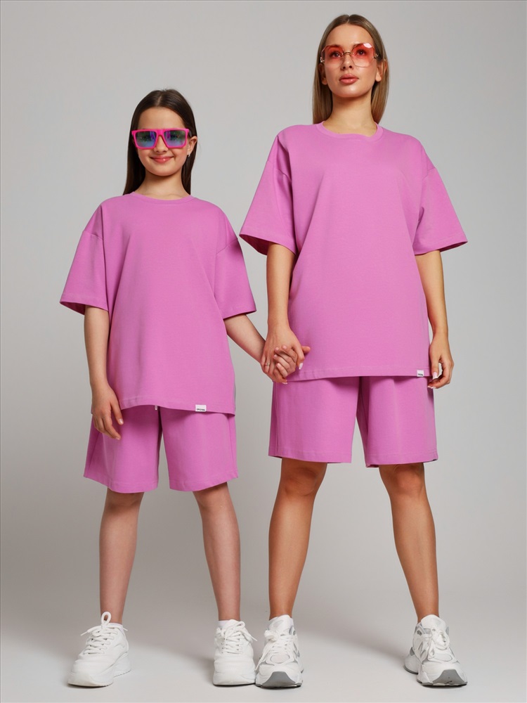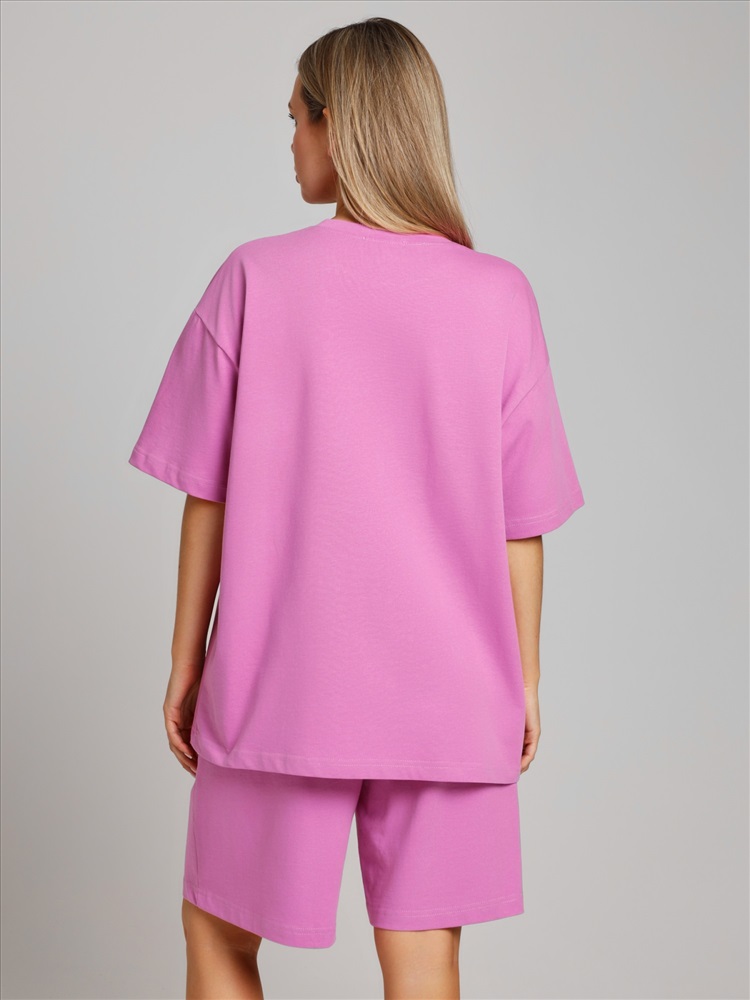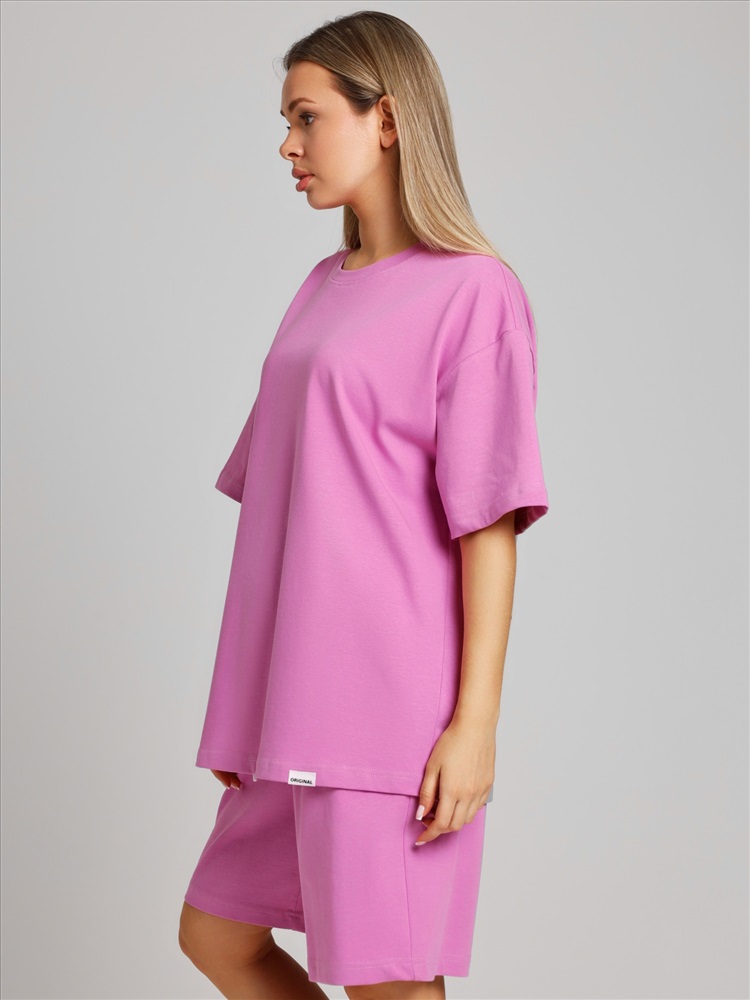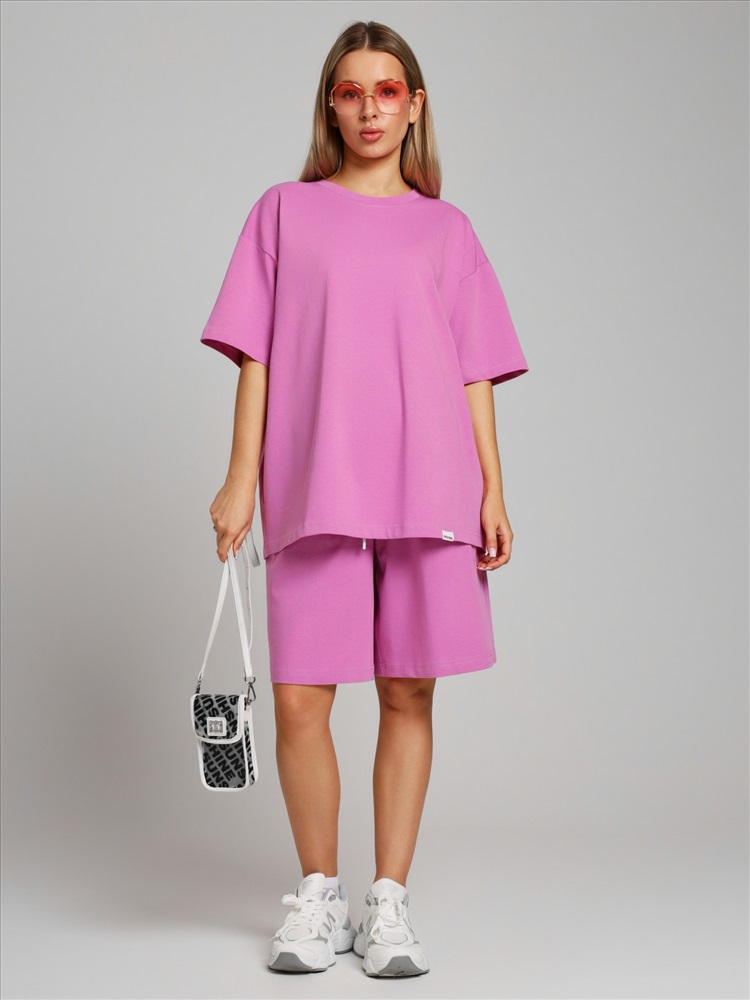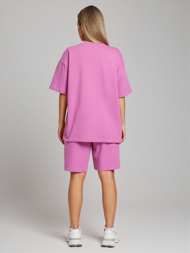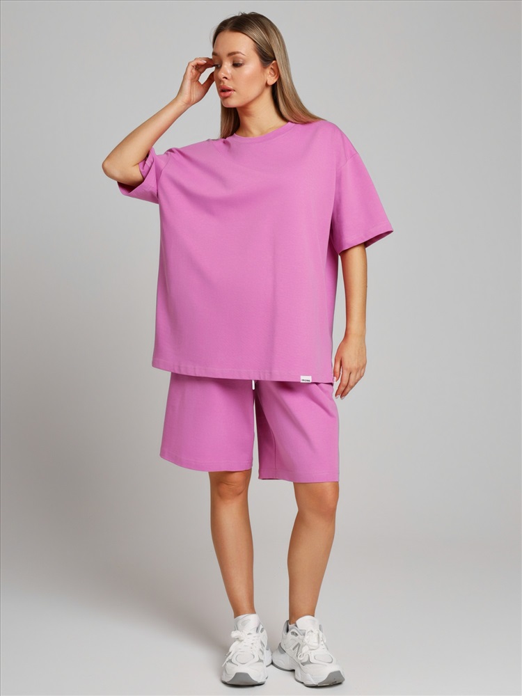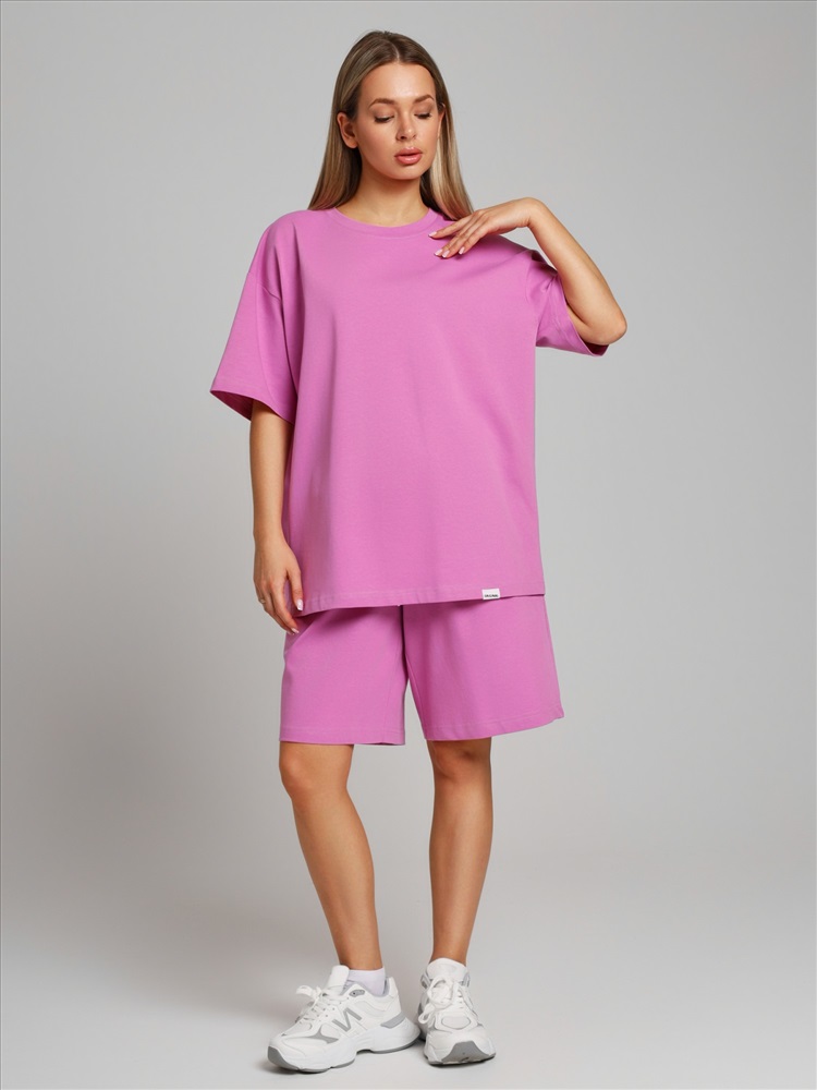 Костюм женский из плотного гладкокрашеного трикотажного полотна "кулирка", состоящий из футболки и шорт. Футболка - свободного покроя, с удлиненными плечевым и швами, короткими втачными рукавами и горловиной овальной формы, обработанной втачной планкой. В нижней части переда слева настрочен декоративный элемент прямоугольной формы. По горловине проложена отделочная строчка. Шорты - классического покроя, на притачном поясе с эластичной тесьмой внутри и карманами в боковых швах. Для регулирования степени прилегания шорт по талии в пояс вставлен шнурок, продетый через два отверстия в соединительных швах в центре пояса.