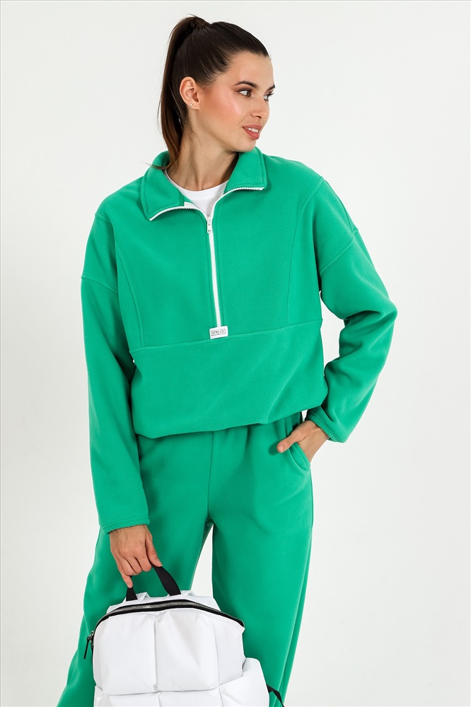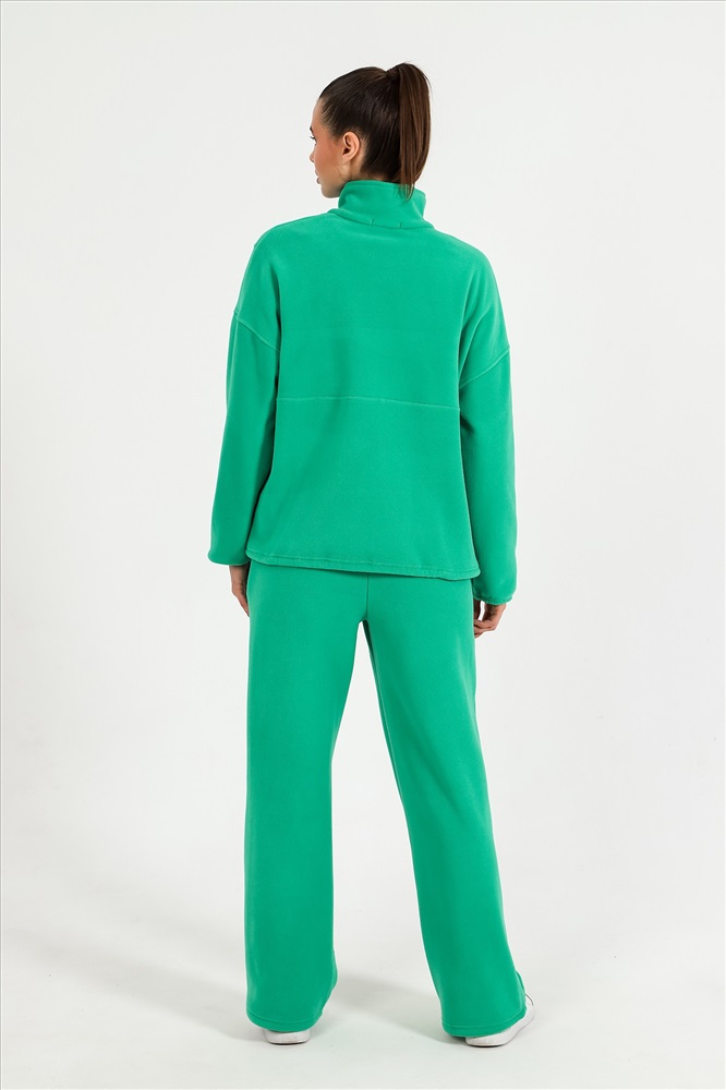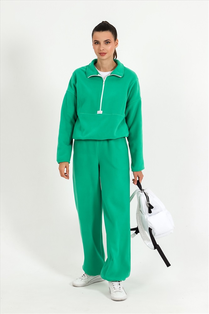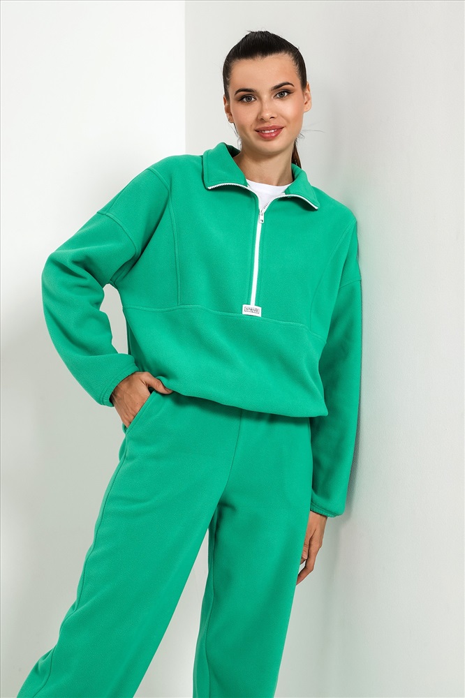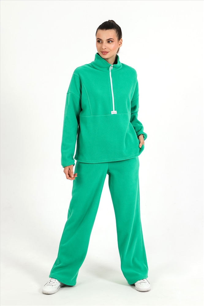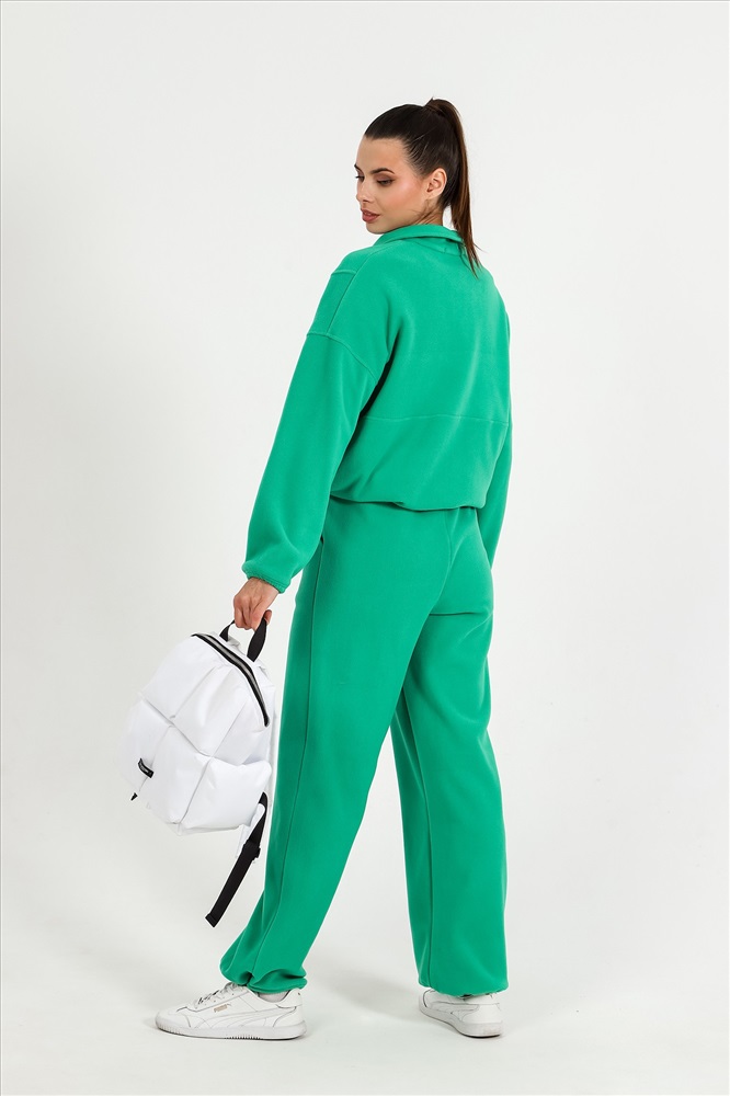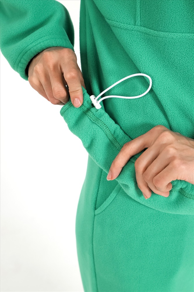 Ткань: Флис Флис - Название флисовой ткани произошло от англ. fleece – ворс, шерсть. В отличие от натуральных шерстяных тканей, флис – синтетическая ткань, при изготовлении которой используется полиэстер и другие искусственные нити.Однако, как и шерсть, флис обладает способностью хорошо сохранять тепло, а, кроме того, более легок, неприхотлив, и обладает влагоотталкивающими свойствами.! Ист. справка - флисовая ткань впервые была получена в конце 20 в. Открытие было удостоено Нобелевской премии, и не зря- материал оказался достойной заменой шерсти – достаточно теплый, но в то же время, позволяющий телу «дышать». Костюм, состоящий из толстовки и брюк. Толстовка - свободного покроя, средней длины, с длинными рукавами на основе цельнокроеных. Деталь переда - с отрезной кокеткой, состоящей из четырех деталей, симметрично расположенных относительно центрального шва, обработанного с застежкой на тесьму "молния". Спинка - с отрезной кокеткой. Нижние срезы рукавов обработанышвом вподгибку с эластичной тесьмой. Низ изделия обработан швом вподгибку. По всем основным соединительным швам толстовки настрочены отделочные строчки. Брюки - длинные, свободного покроя, на притачном поясе с эластичной тесьмой внутри и карманами в боковых швах. Нижние срезы обработаны швом вподгибку с эластичной тесьмой. По низу джемпера и низу брюк - эластичная тесьма с фиксаторами для регулировки ширины изделий на этих участках.