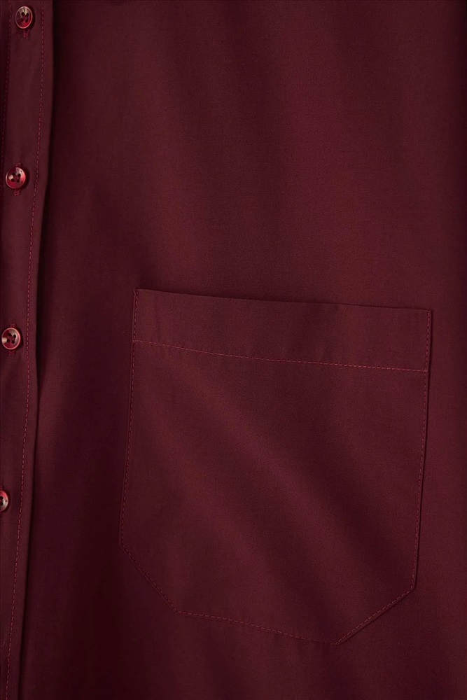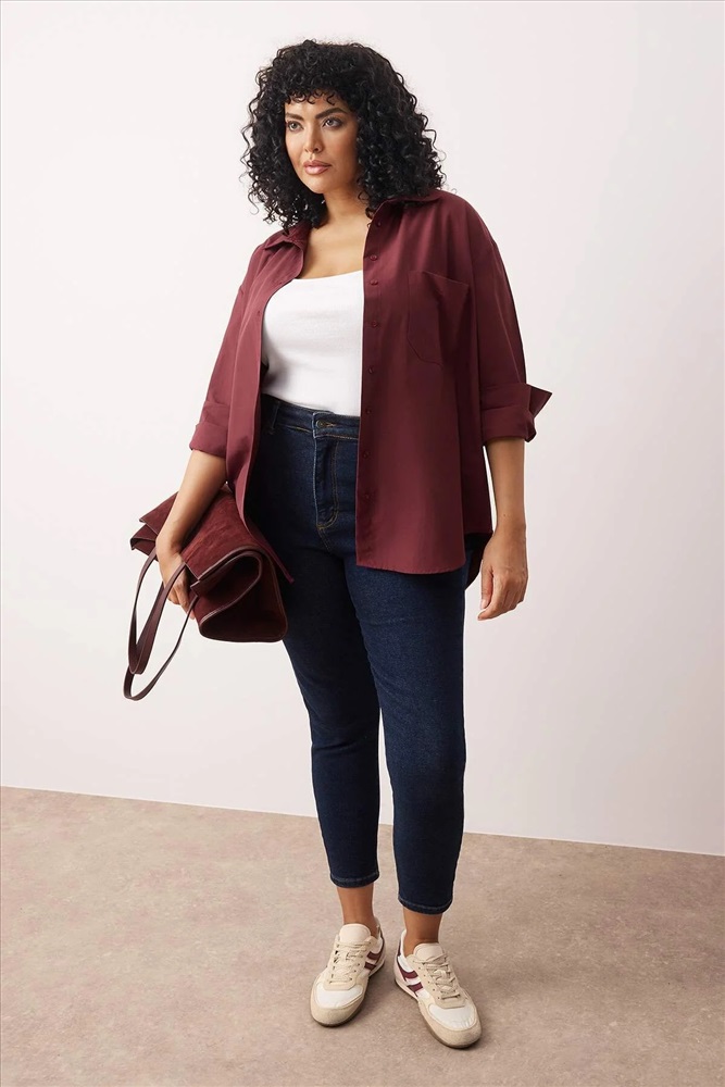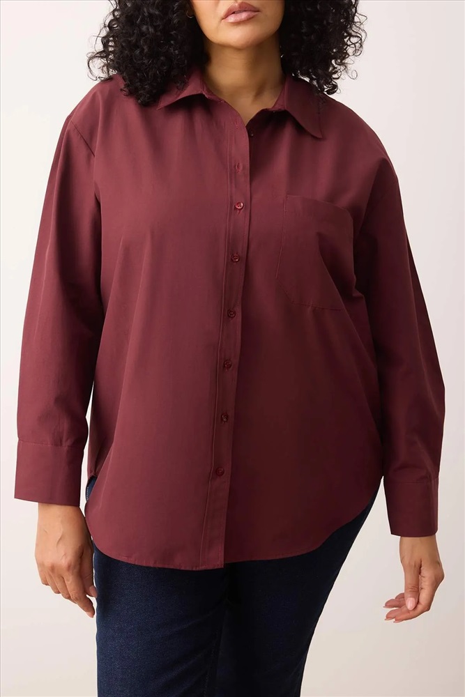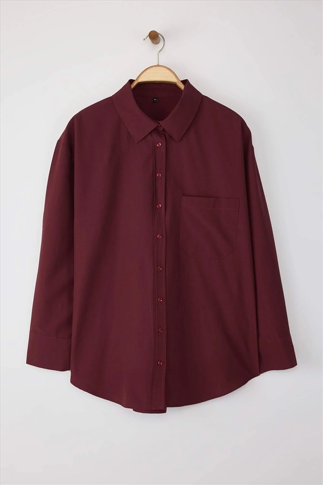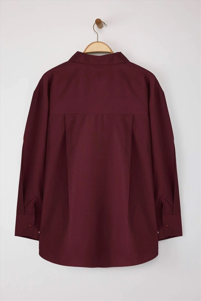 Koyu Bordo Loose Fit Pamuklu Uzun Kol Büyük Beden Dokuma Gömlek TBBSS22GO0323