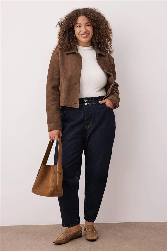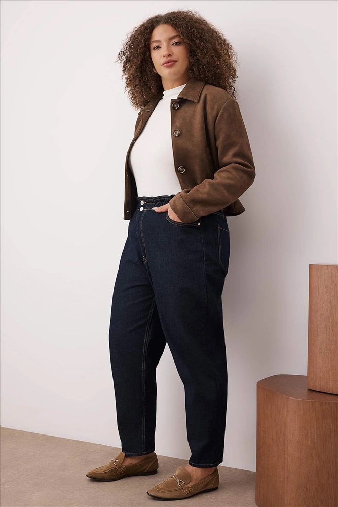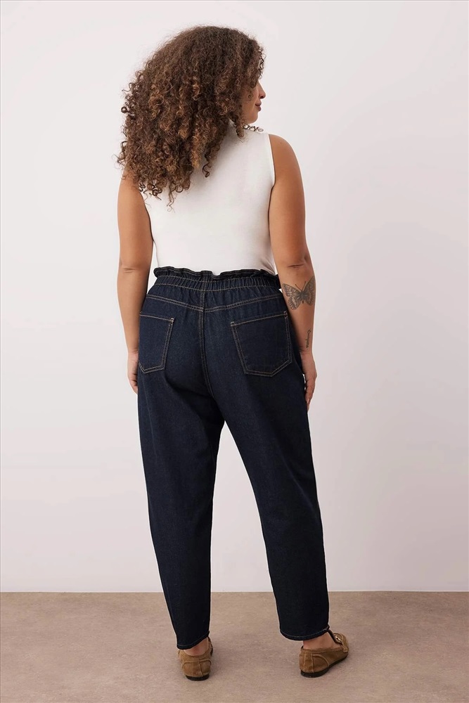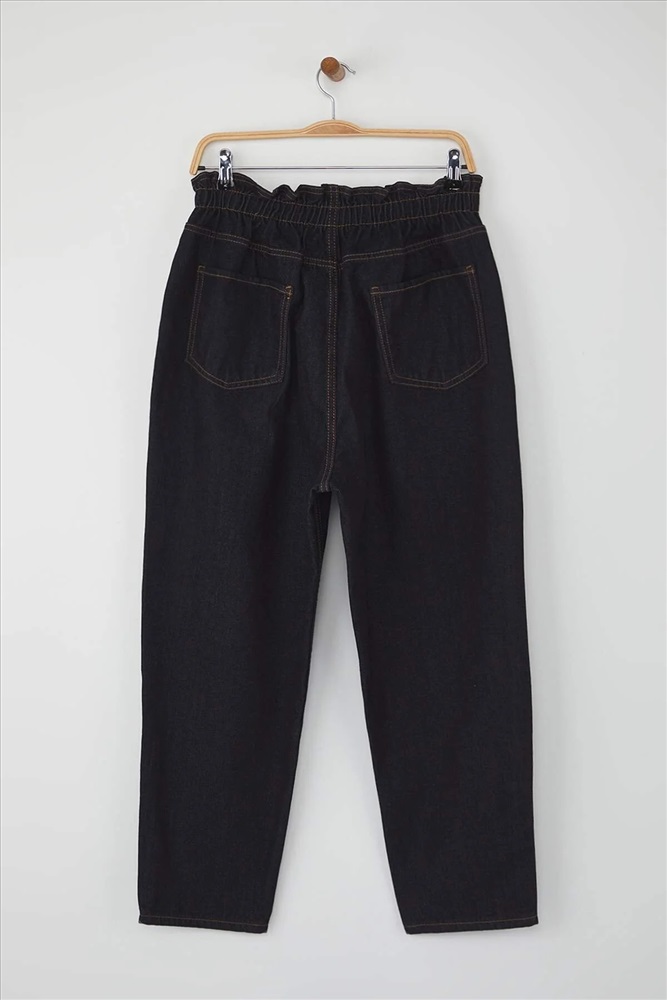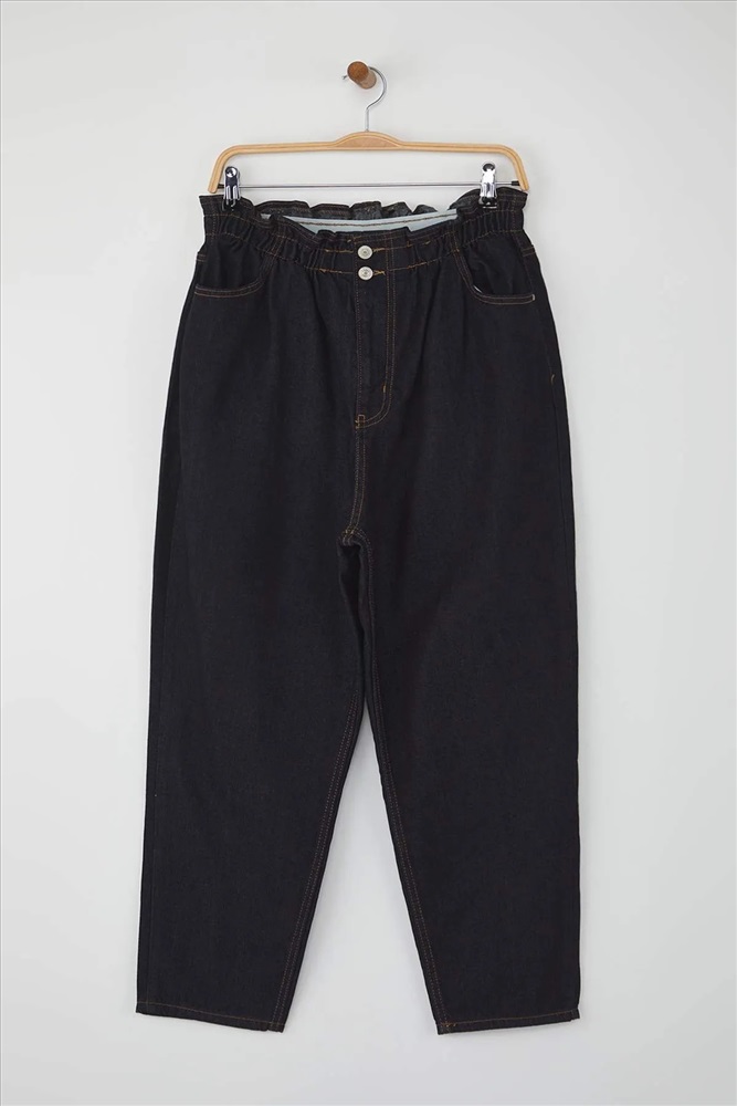 Koyu Mavi Yüksek Bel Beli Lastikli Büyük Beden Mom Jeans TBBAW23JE00002