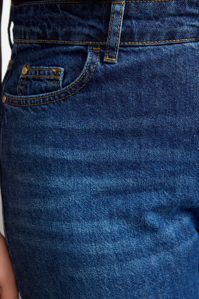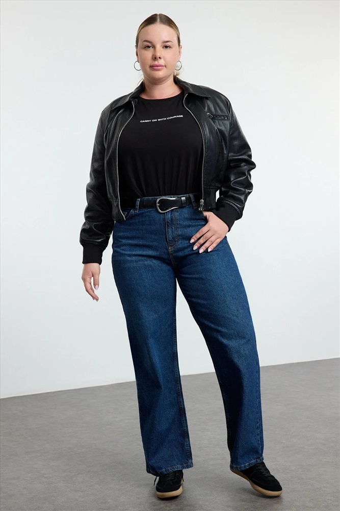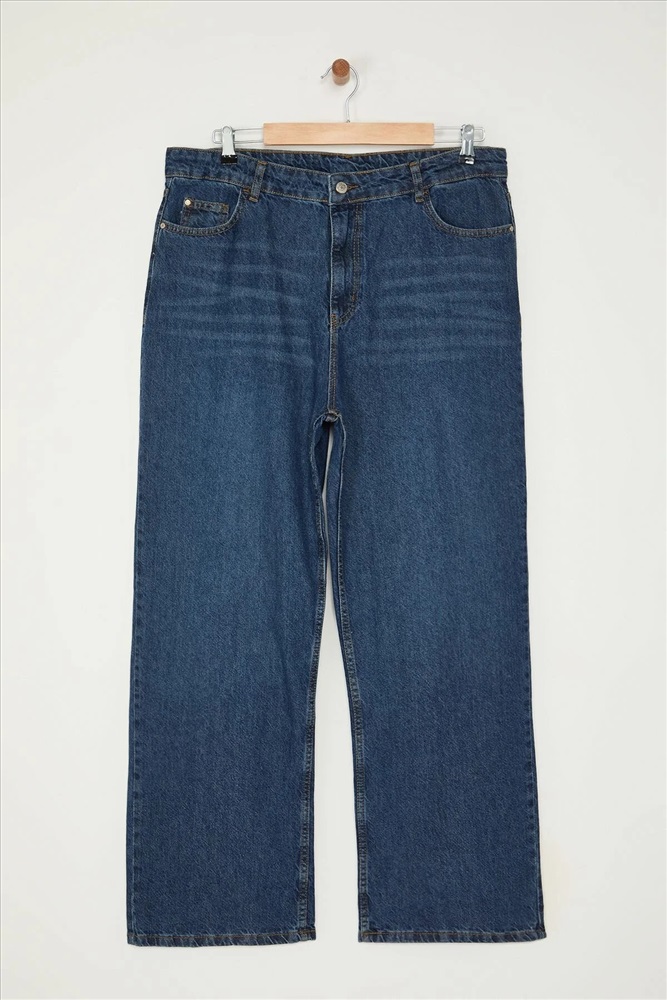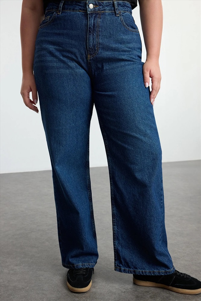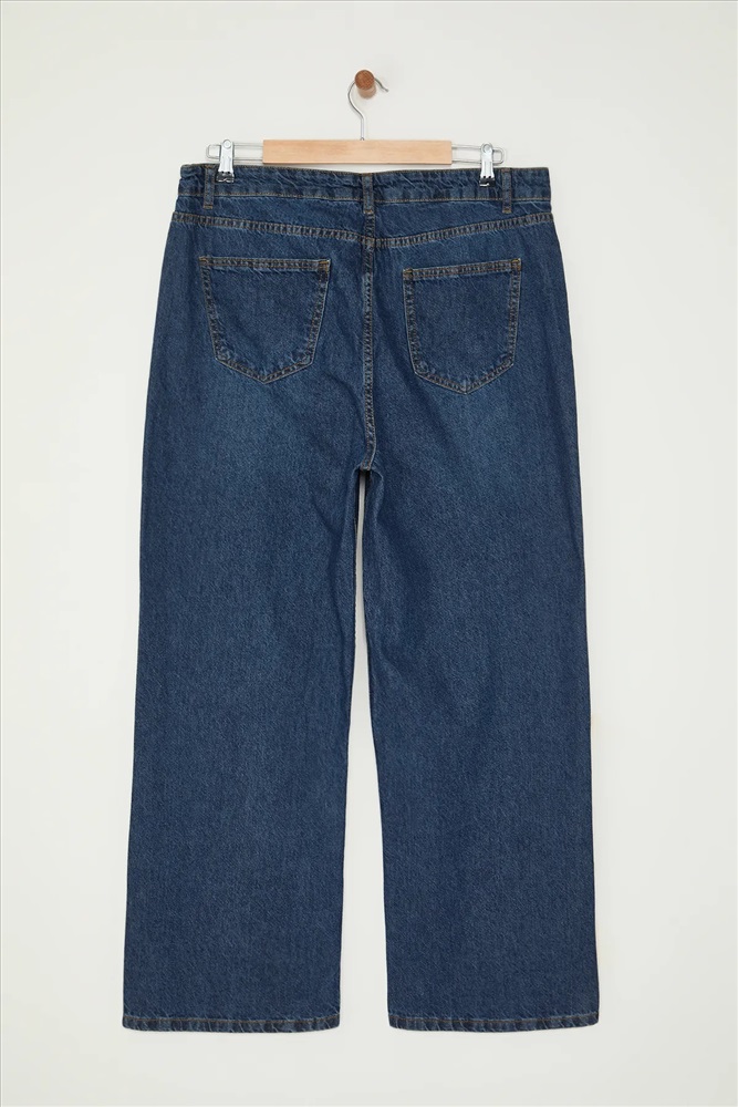 Koyu Mavi Yüksek Bel Soluk Efekt Vintage Yıkama Geniş Paça Büyük Beden Wide Leg Jeans TBBSS24CJ00042