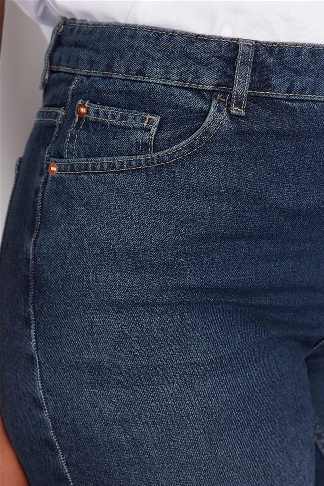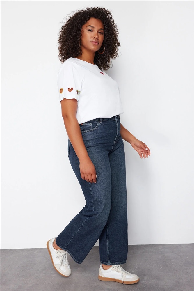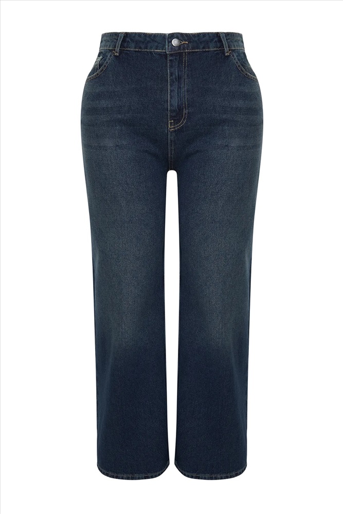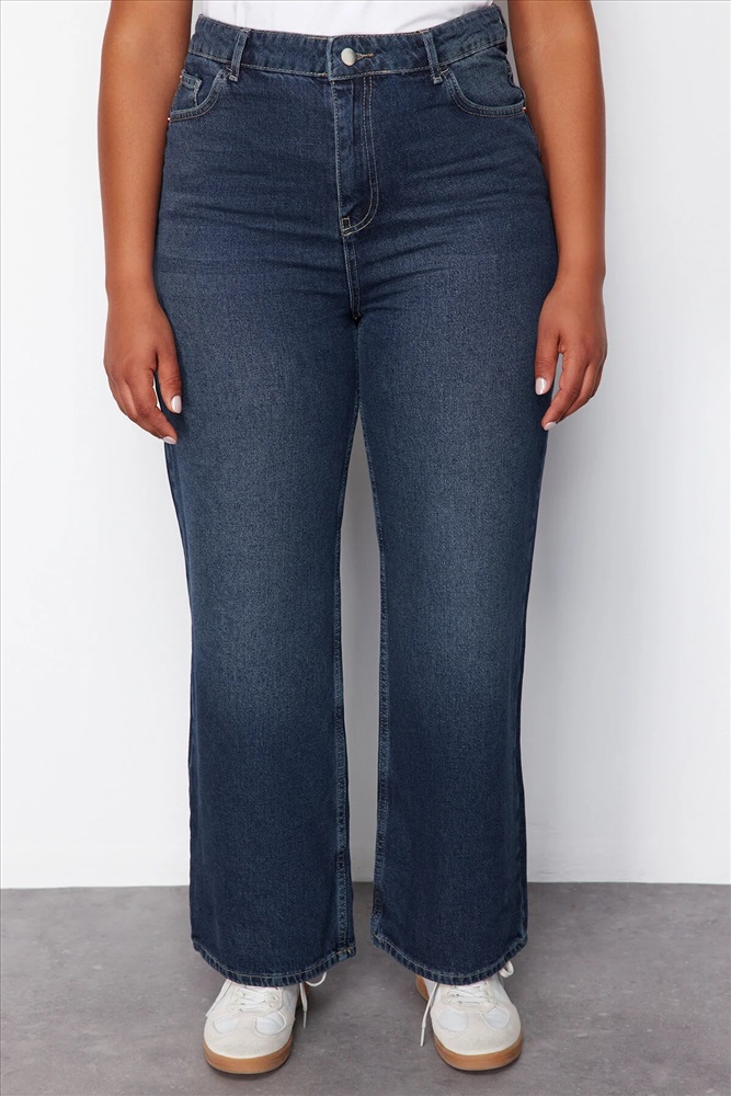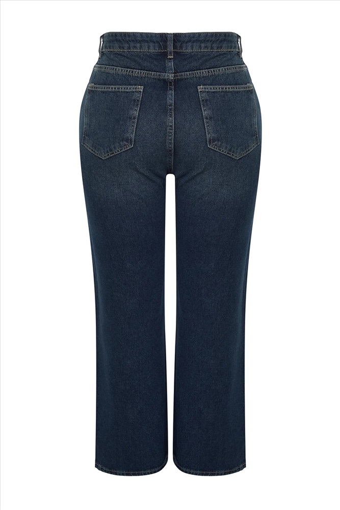 Koyu Mavi Yüksek Bel Soluk Efekt Vintage Yıkama Geniş Paça Büyük Beden Wide Leg Jeans TBBSS24CJ00050