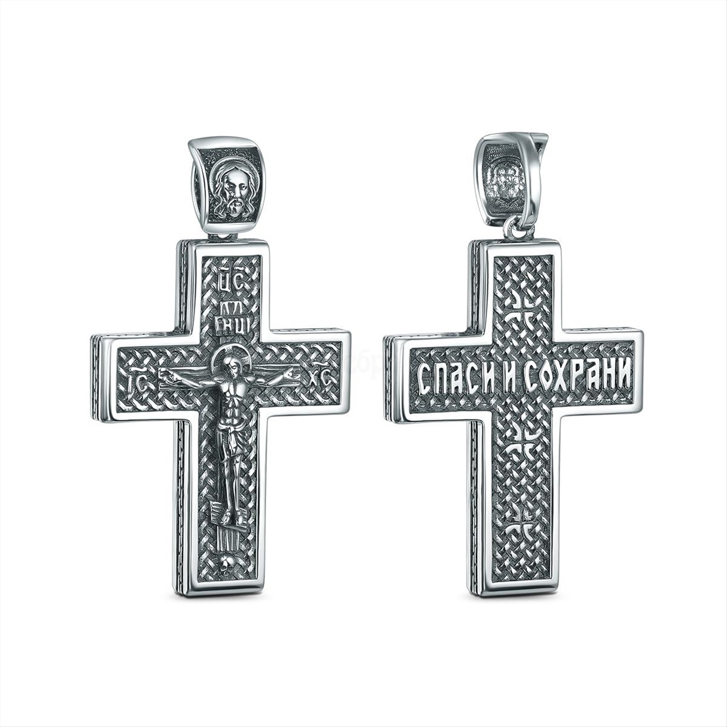 Крест из чернёного серебра - Рaспятие, Спаc Неpукотвоpный, Спаси и сохрани ПК-063-2ч