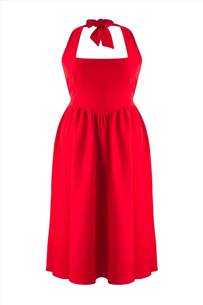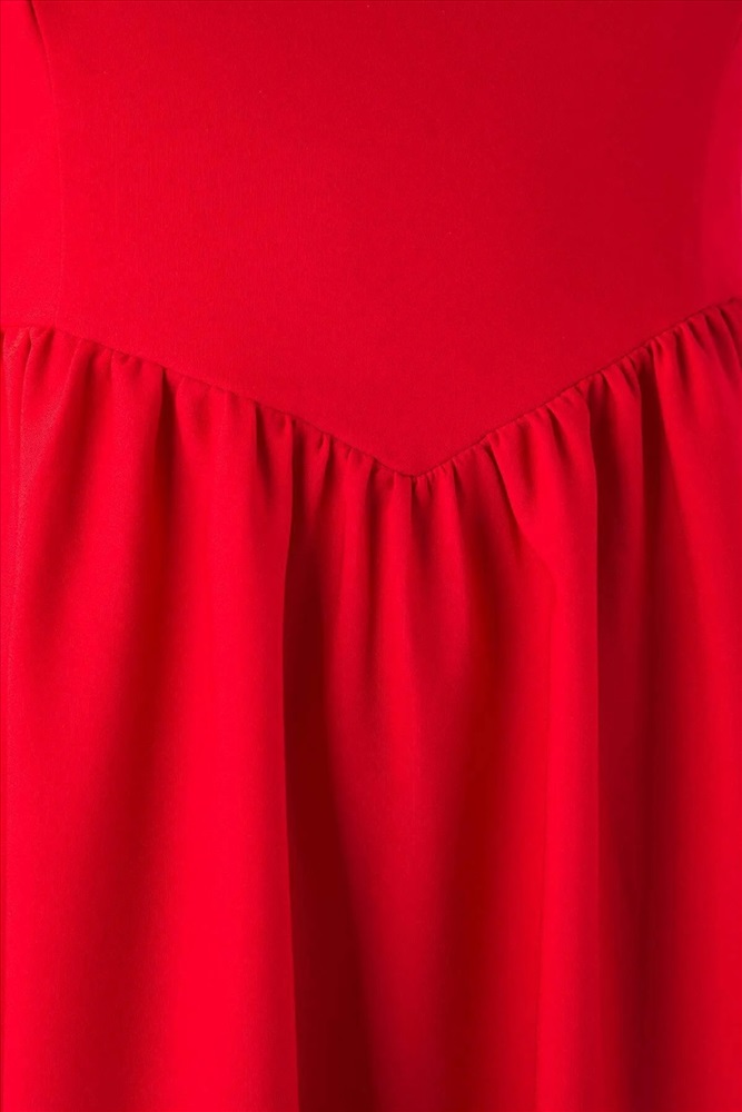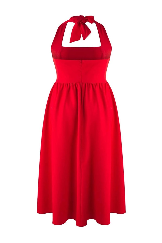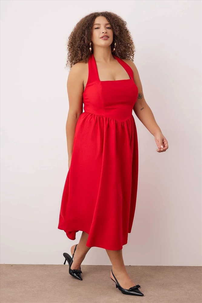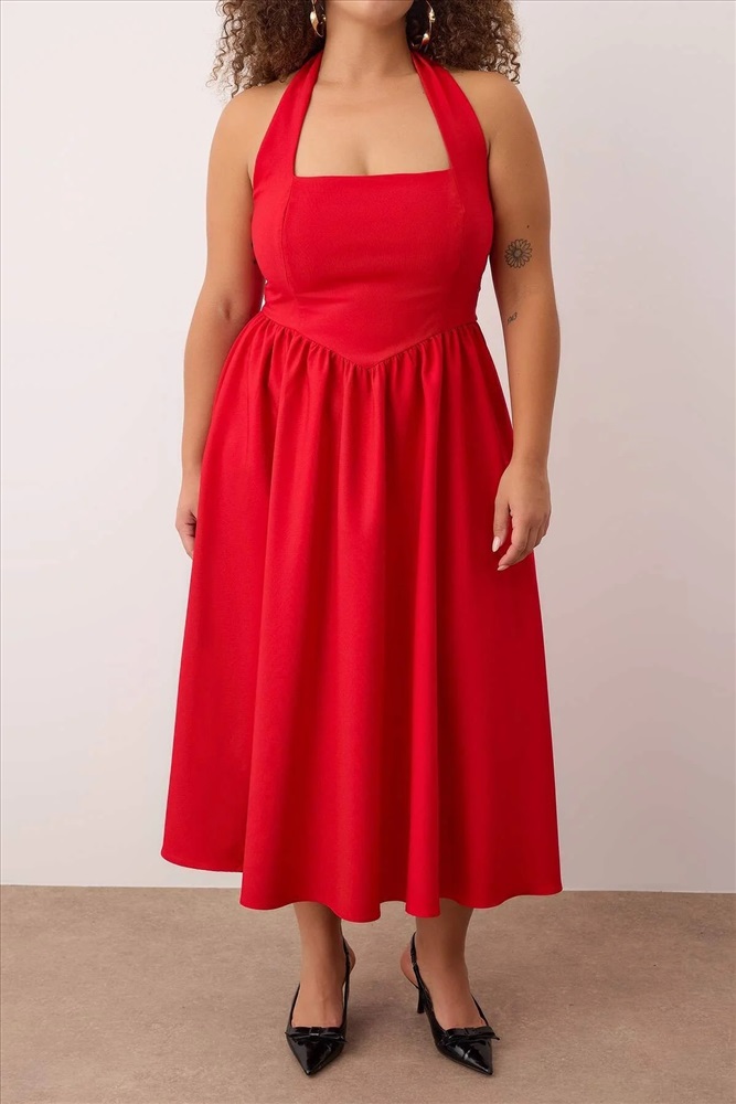 Kırmızı Kare Yaka Skater Midi Finike Dokuma Büyük Beden Elbise TBBSS25AH00255