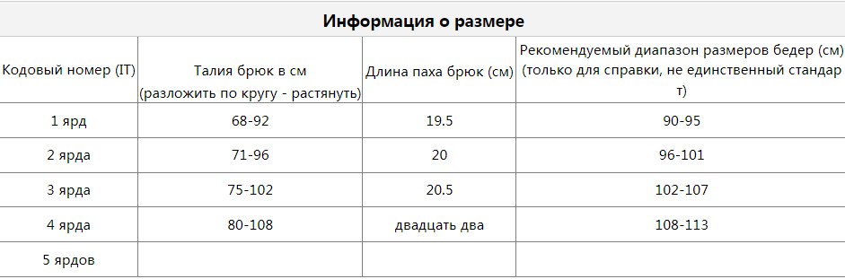 Размер: 1: обхват бедер 90–95 см., 2: обхват бедер 96–101 см, 3: обхват бедер 102–107 см., 4: обхват бедер 108–113 см.